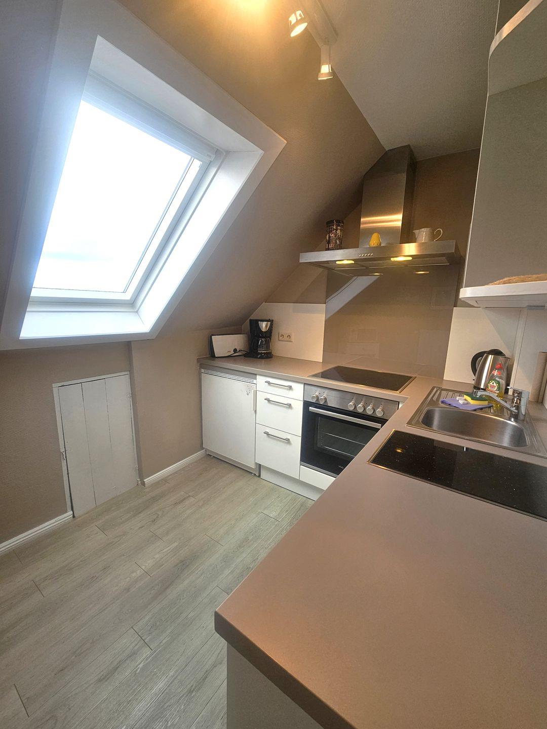 Die Küche ist vollständig ausgestattet und auf Selbstversorgung ausgerichtet: Herd mit 4-Platten-Kochfeld, Backofen, Mikrowelle, Kühlschrank mit Gefrierfach, Spülmaschine, Kaffeemaschine und Wasserkocher sowie Küchenutensilien, Geschirr und Besteck. Ein Essbereich mit Esstisch ist ebenfalls vorhanden.