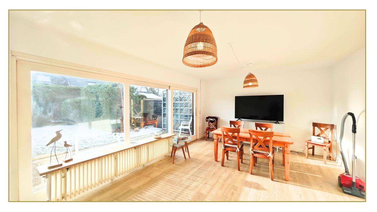 Der helle Wohnbereich lädt mit seiner geschmackvollen Einrichtung zum Ankommen und Wohlfühlen ein. Große Fenster sorgen für eine freundliche Atmosphäre, während Sie nach einem erlebnisreichen Tag zur Ruhe kommen. Die gut ausgestattete Küche bietet alles, was Sie für einen entspannten Urlaub benötigen – ob gemütliches Frühstück oder gemeinsames Abendessen. Die Terrasse mit großem Garten lädt zum entspannen ein.