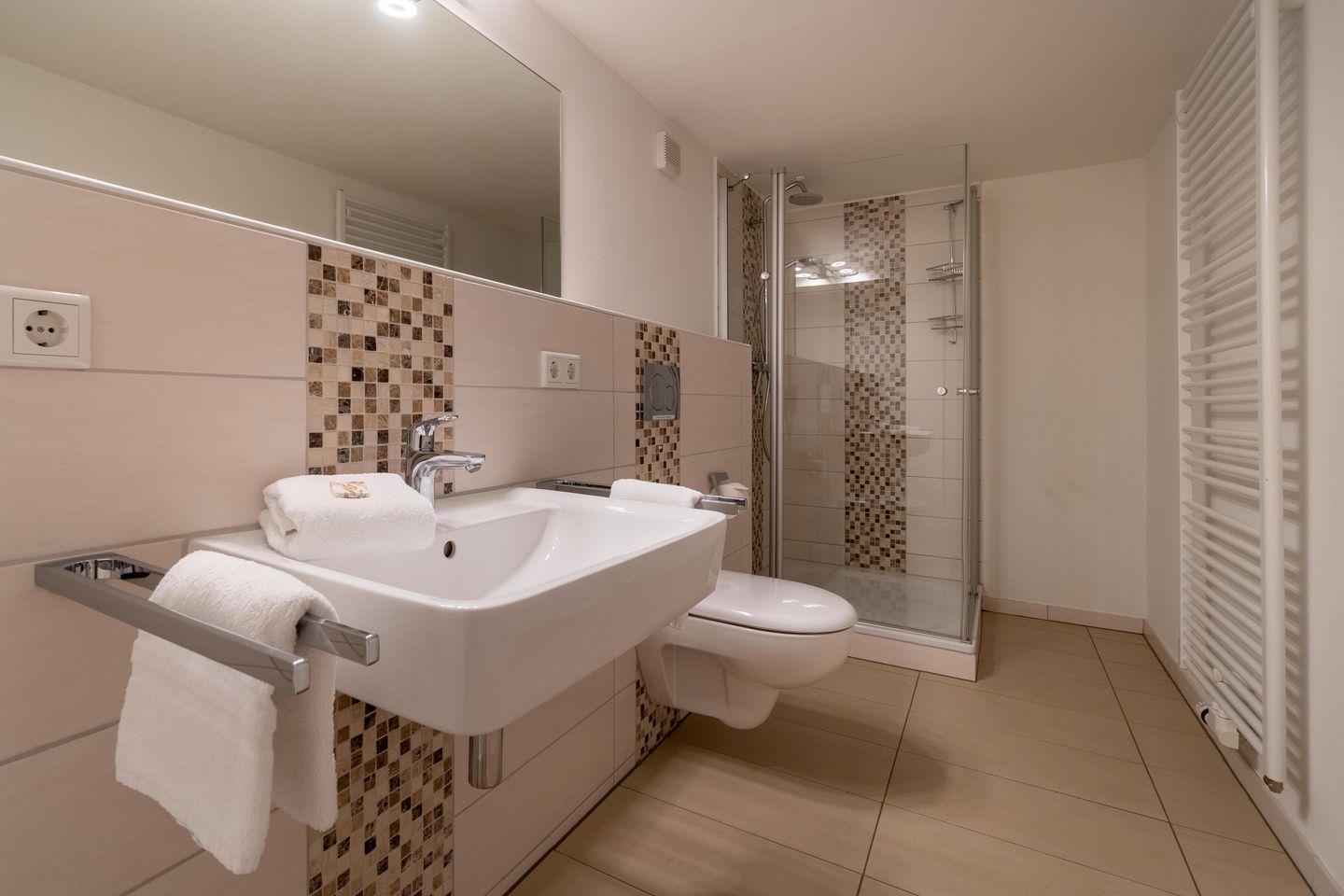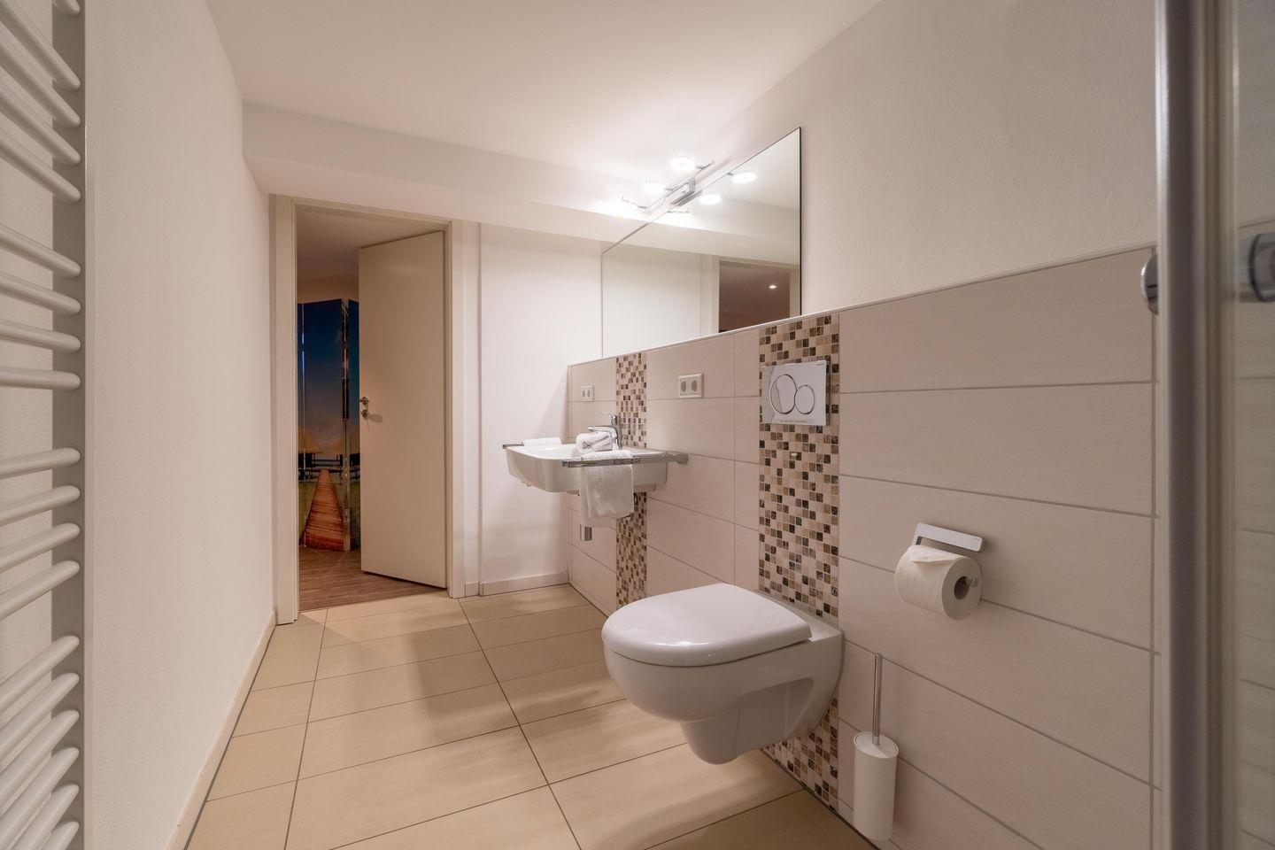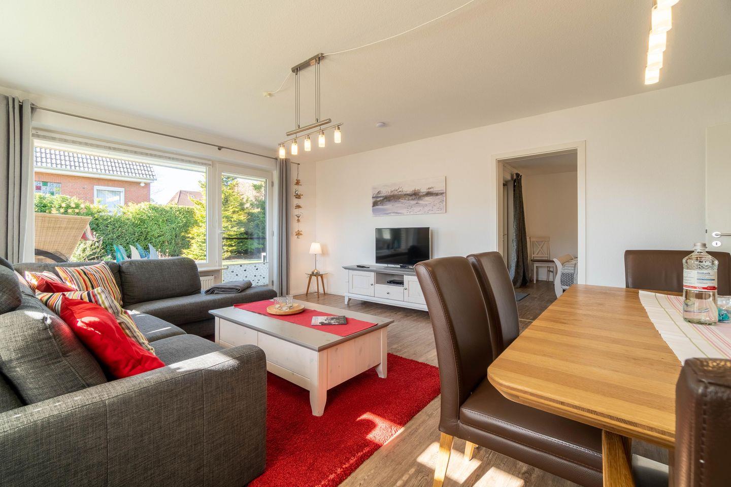 Das große Wohn-/Esszimmer bildet das Herzstück der Erdgeschosswohnung. Von hier und vom angrenzendem Schlafzimmer aus gelangen Sie auf Ihre eigene Terrasse mit Strandkorb. In der Küche steht ein weiterer Esstisch. Neben einem Bad mit bodengleicher Dusche gibt es in der Wohnung noch ein Gäste-WC. Highlight ist sicherlich, dass ein zweites kleines Wohnzimmer mit Ofen in der Wohnung vorhanden ist. Der Waschraum befindet sich im Keller und steht den Gästen beider Wohnungen gemeinschaftlich zur Verfügung.