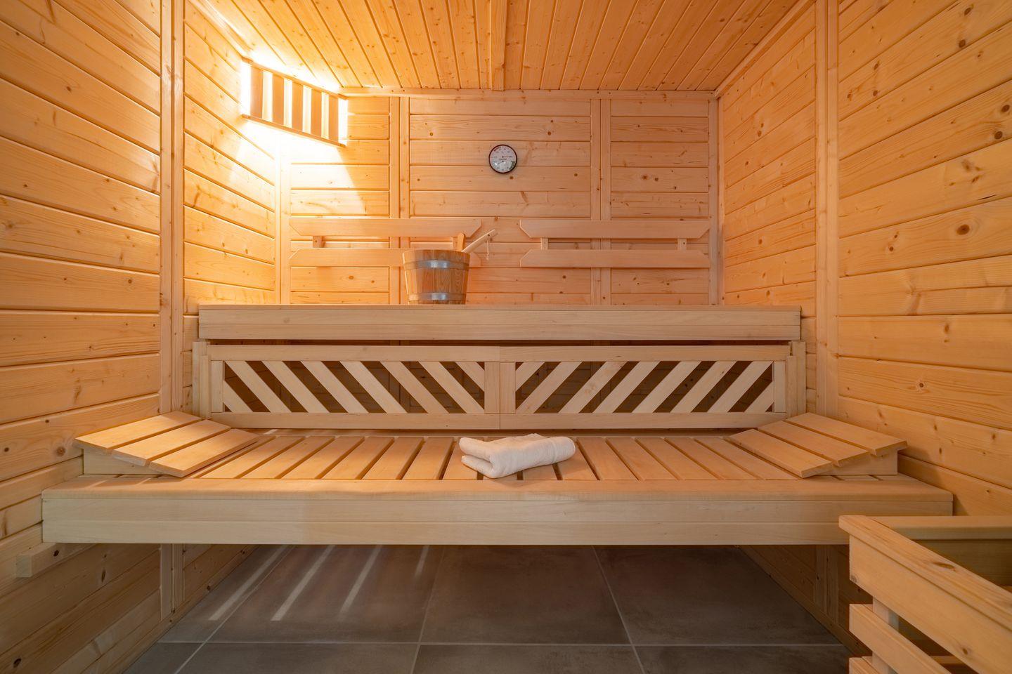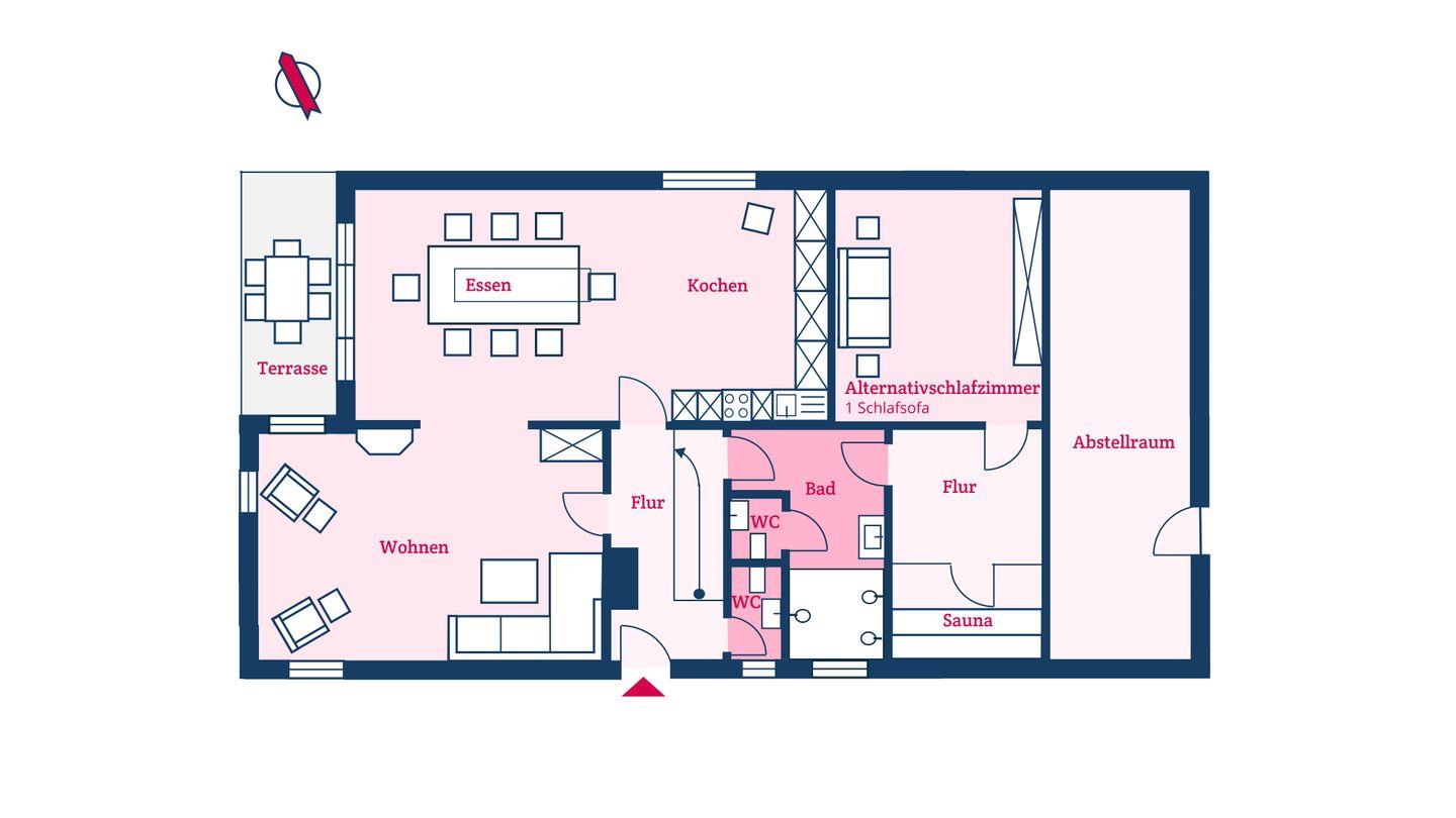 Im Erdgeschoss befindet sich der große, lichtdurchströmte Wohn- und Essbereich sowie die offene Landhausküche. Ebenfalls im Erdgeschoss gelegen ist die Sauna, ein Schlafzimmer mit Schlafsofa, ein Badezimmer mit Doppeldusche als auch ein Gäste-WC im Eingangsbereich des Ferienhauses.