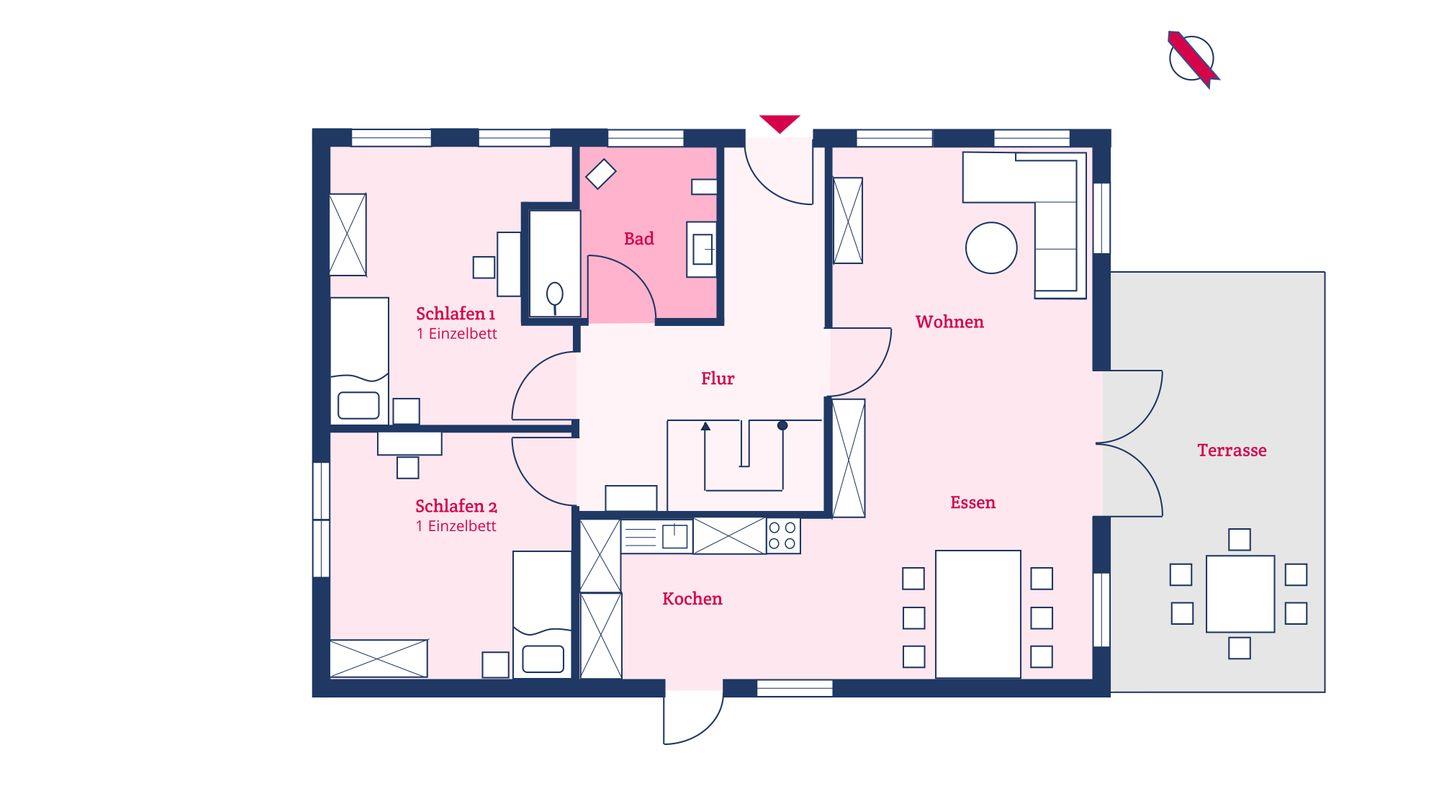 Das Haus ist modern und angenehm lichtdurchlässig. Im Erdgeschoss befindet sich ein großzügiger Wohn-, Ess-, und Kochbereich. Des weiteren sind hier zwei Schlafzimmer mit jeweils einem Einzelbett untergebracht. Im Erdgeschoss befindet sich ebenfalls ein Bad mit einer bodengleichen Dusche. Im Dachgeschoss erreichen Sie zwei weitere Schlafzimmer mit jeweils einem Doppelbett und ein großzügiges Badezimmer mit einer bodengleichen Dusche. Die Schlafzimmer im Obergeschoss bieten ausreichend Platz für eine Kleinkindaufbettung. Der schöne, ruhig gelegene Garten lädt zu ausgiebigen Sonnenstunden ein. Gartenmöbel sowie ein ganzjähriger Strandkorb stehen Ihnen hierfür zur Verfügung. Im Garten befindet sich ebenfalls ein großes, abschließbares Gartenhaus, worin sich problemlos Fahrräder, Bollerwagen und Strandspielzeuge unterbringen lassen.