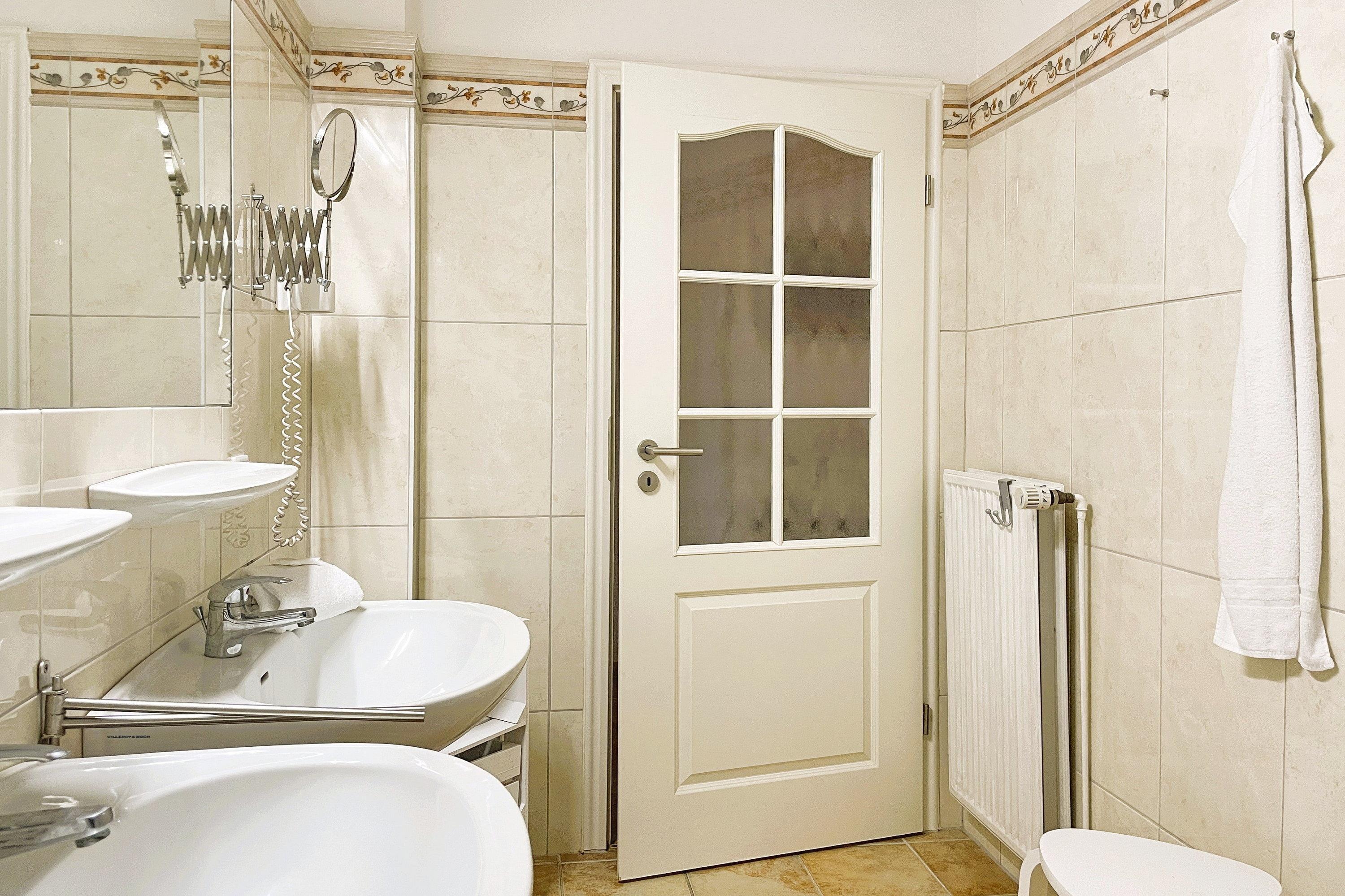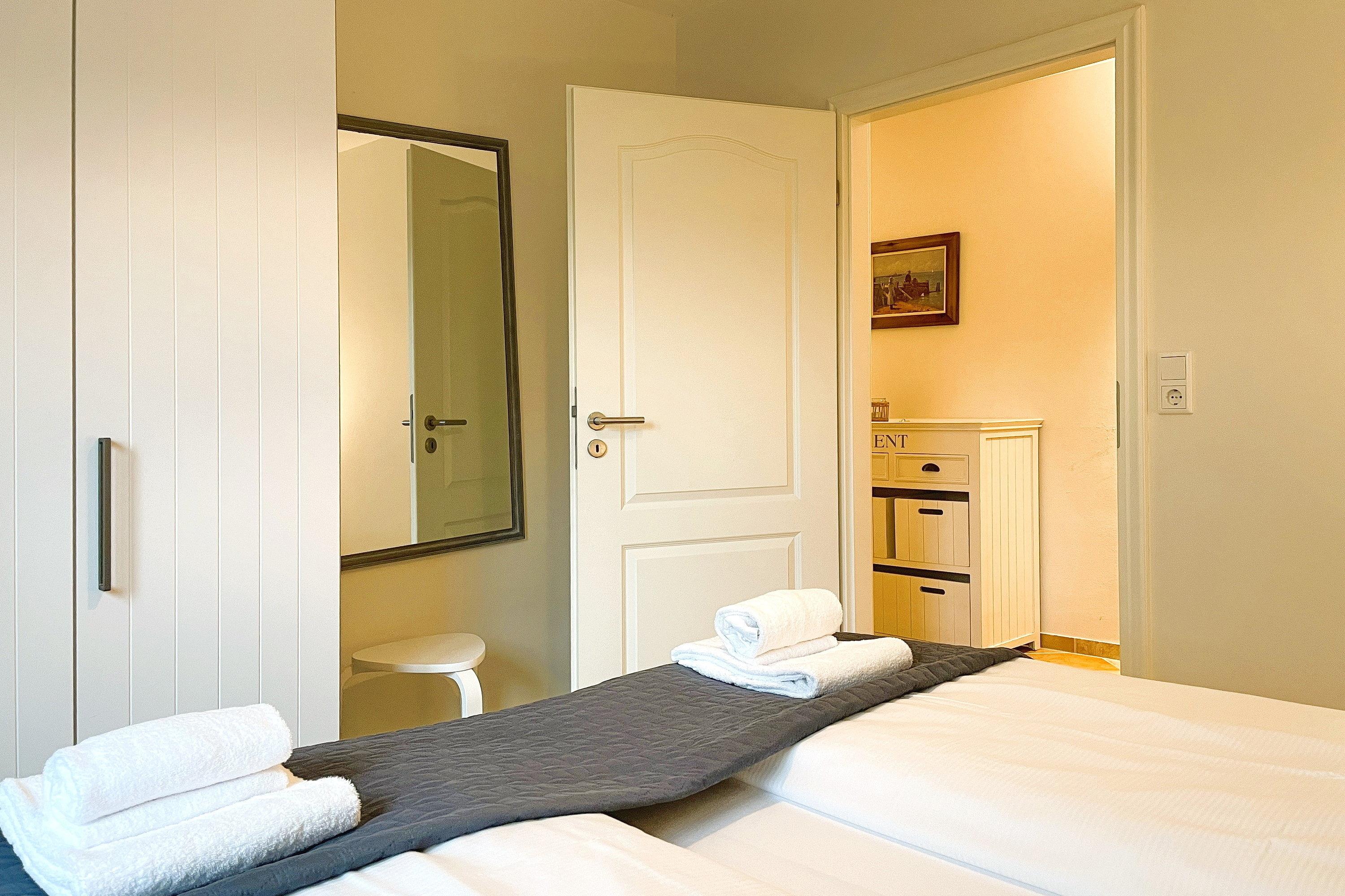 Das Hauptschlafzimmer ist mit einem Doppelbett ausgestattet, während das zweite Schlafzimmer ein Einzelbett sowie ein Etagenbett in Erwachsenengröße bietet. Das Badezimmer ist mit einem Vollbad, WC und zwei Waschplätzen ausgestattet und sorgt für zusätzlichen Komfort. Genießen Sie Ihren Aufenthalt in unserer komfortablen Ferienwohnung und erleben Sie Entspannung pur! Buchen Sie jetzt und sichern Sie sich Ihren perfekten Urlaub!