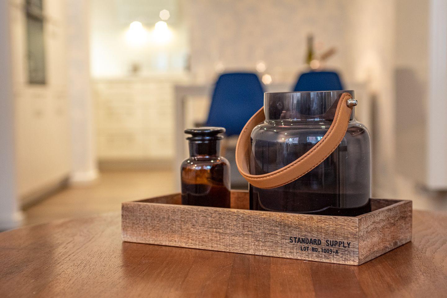 Durch die mit Efeu behangene Fassade gelangen Sie in den kleinen Flur. Dort finden Jacken und Schuhe genug Platz. In dem kombinierten Wohn-/Esszimmer mit halboffener Küche und Schlafsofa befindet sich der Esstisch mit Platz für bis zu vier Personen. Ebenfalls im Erdgeschoss befindet sich das Bad mit einer großzügigen, bodengleichen Dusche, der hauseigenen Sauna und einer Waschmaschine. Im Obergeschoss befindet sich ein Schlafzimmer mit Doppelbett.