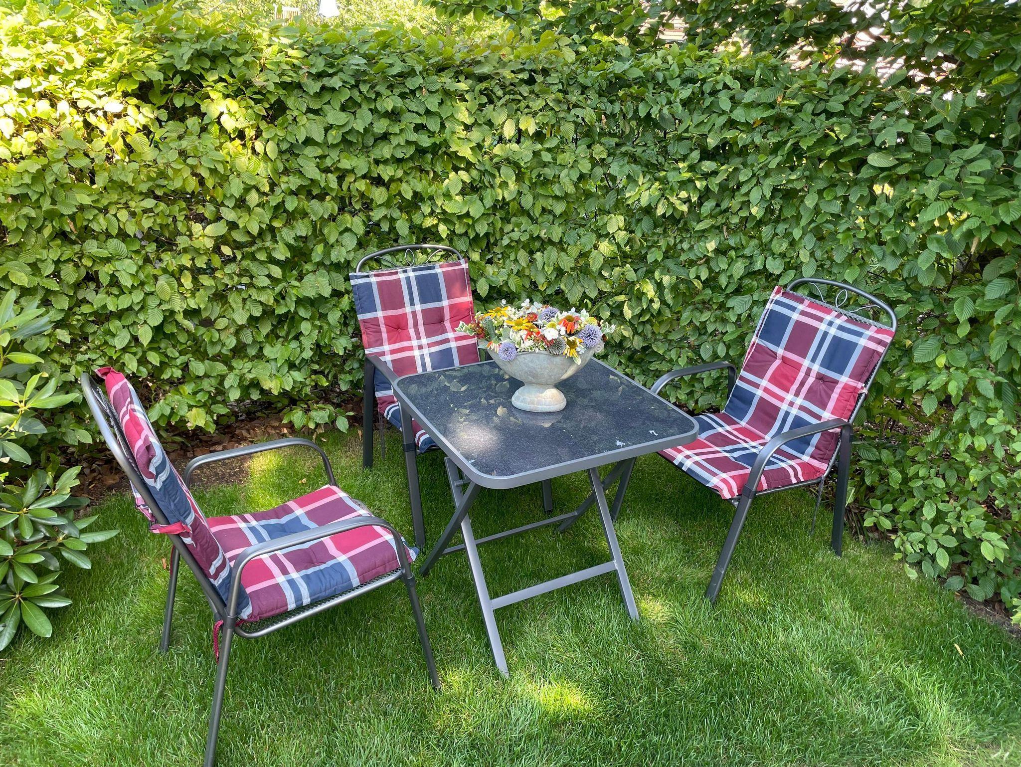 teils überdachter Balkon ca. 9 m² mit Tisch und Stühlen , Aussicht auf Garten