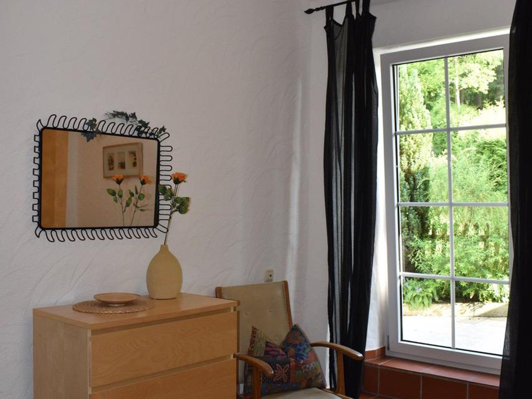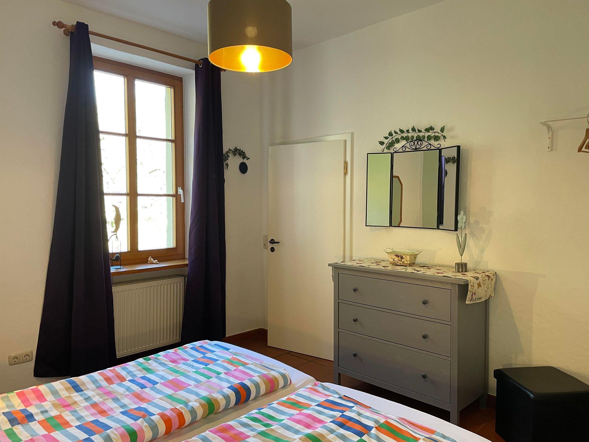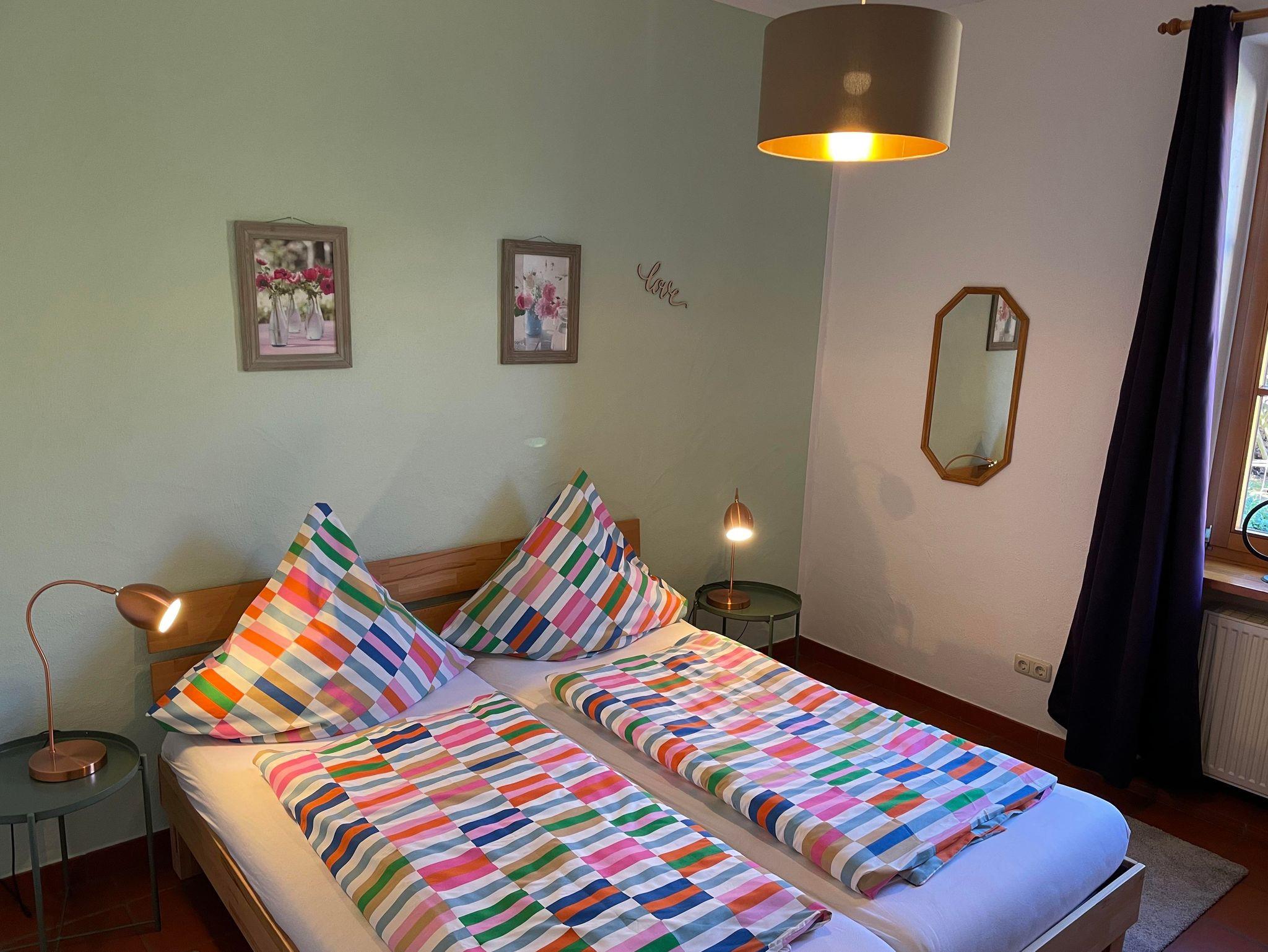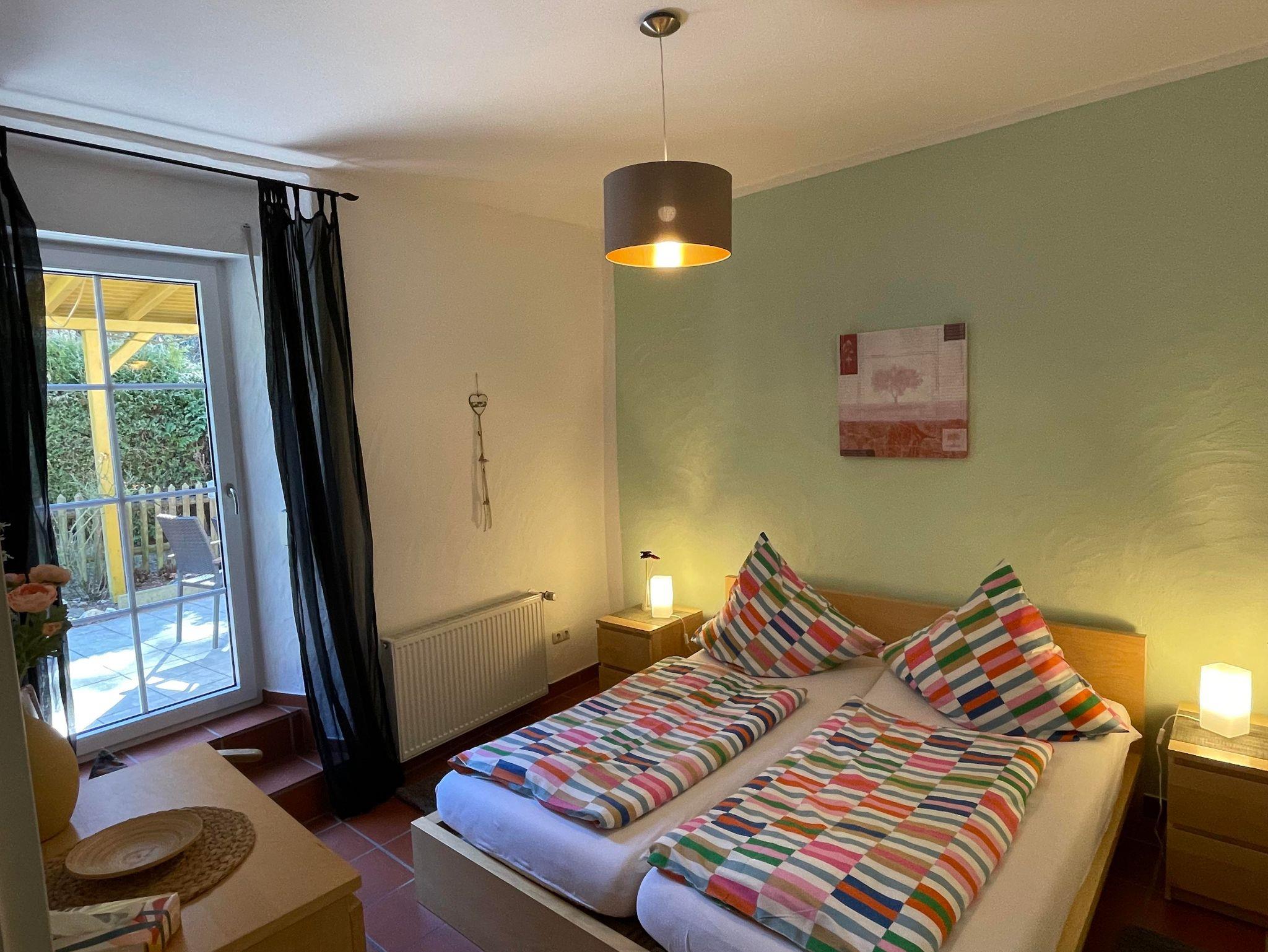 Sehr schöne Ferienwohnung für 2 - 4 Personen ist ca. 60 qm groß. Sie verfügt über einen separaten Eingang, Terracottaboden, zwei separate Doppelschlafzimmer, Wohnraum mit kleiner Küchenzeile (Kaffeemaschine, Toaster, Wasserkocher, Eierkocher), gemütliche Sitzgruppe und Sofaecke, Sat-TV und HIfi-Anlage.Bad mit DU/WC/Kosmetikspiegel und Fön, Terrasse mit herrlichem Blick in die Natur und Balkon zum Hofgarten.