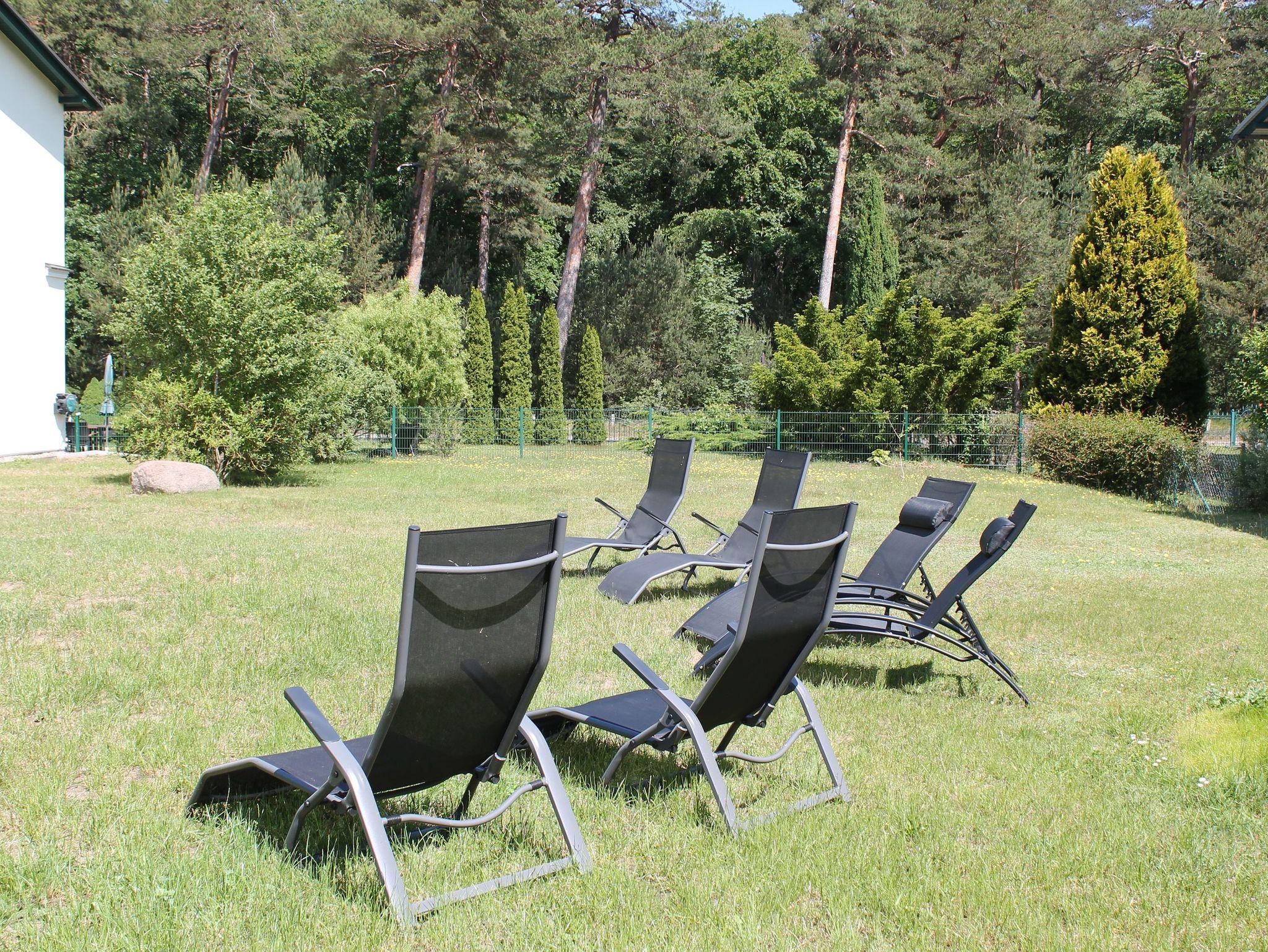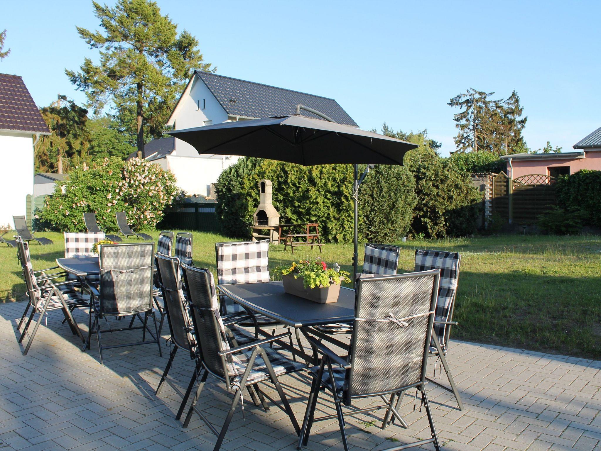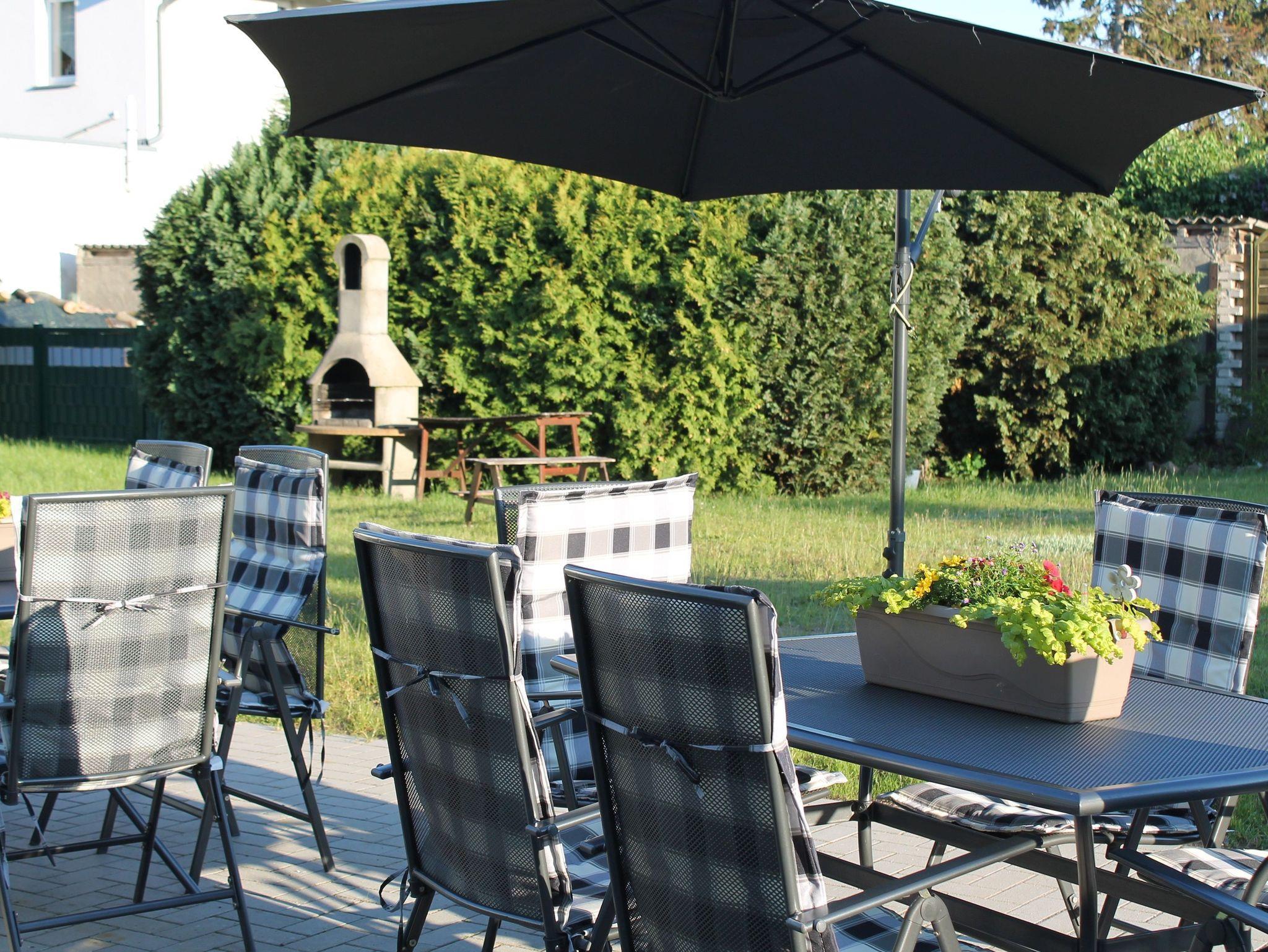 Zur großen Ferienwohnung gehört eine Außenterrasse mit Tischen, Stühlen und einem Sonnenschirm. Darüber hinaus stehen Ihnen Sonnenliegen auf der Wiese zur Verfügung.