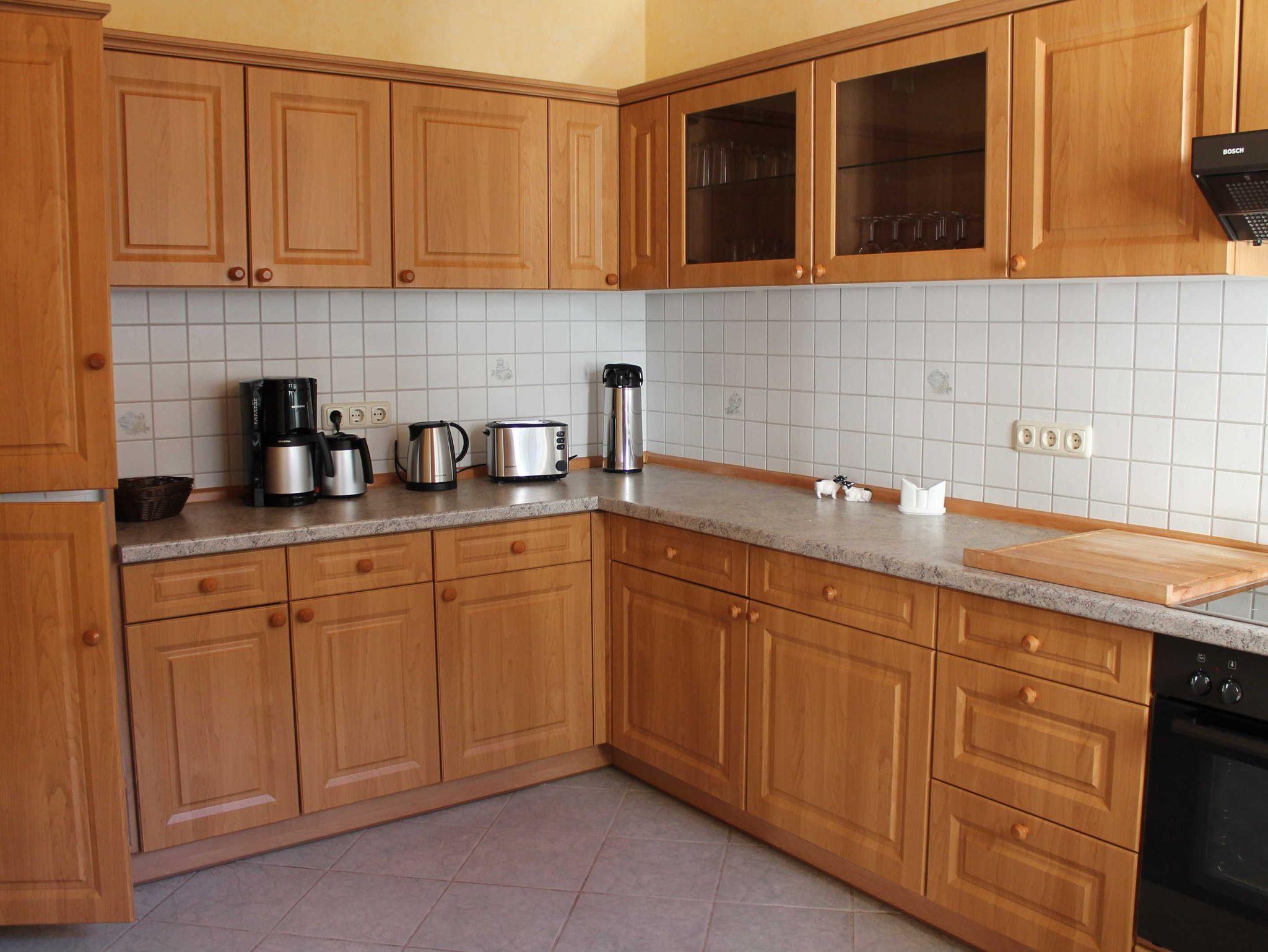 Die große voll ausgestattete Küche verfügt neben Wasserkocher, Kaffeemaschine, Toaster, Herd mit Ceranfeld und Geschirrspüler auch über einen Kühlschrank mit Gefrierfächern. Auch hier finden Sie Platz zum Sitzen.