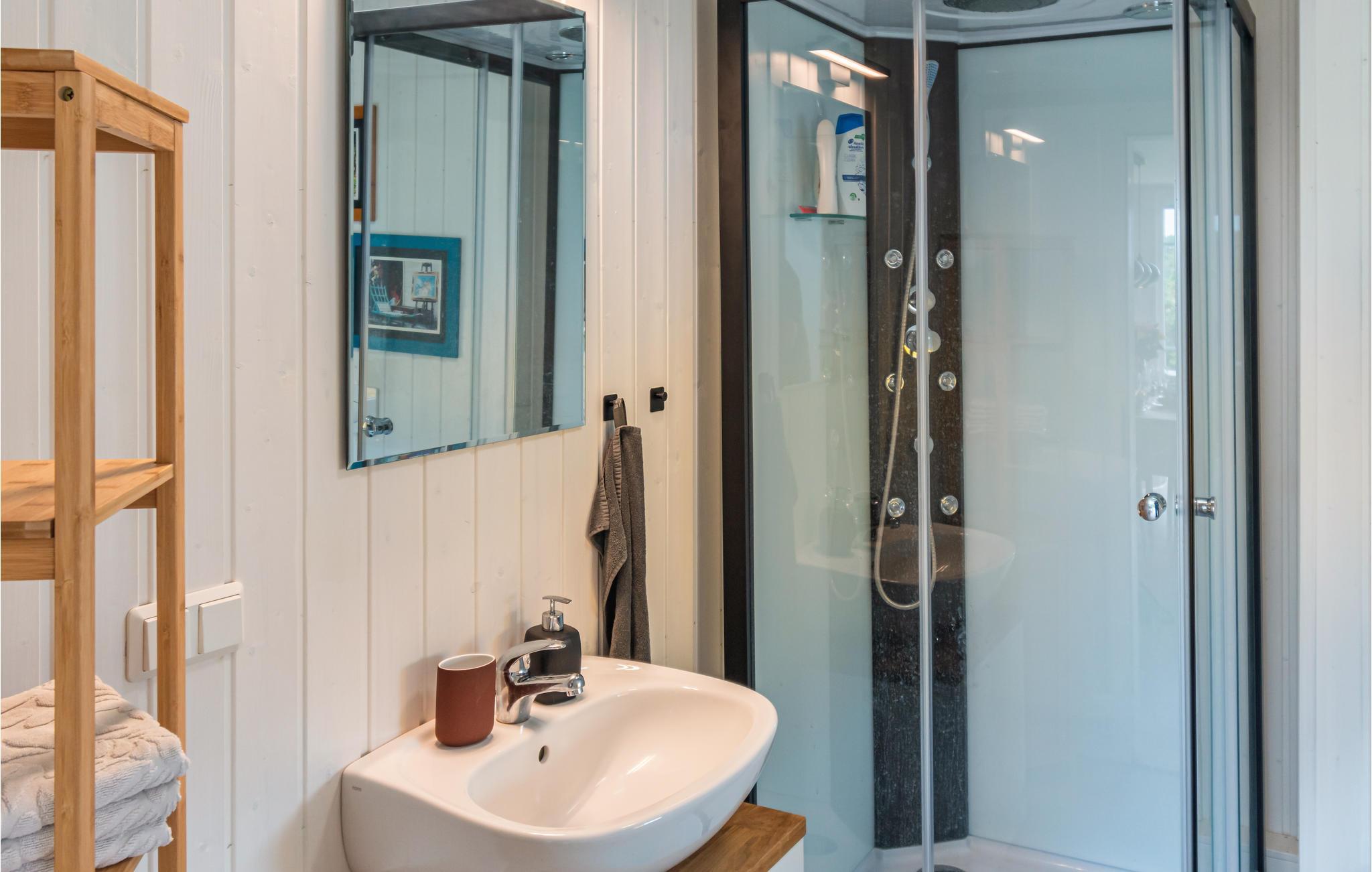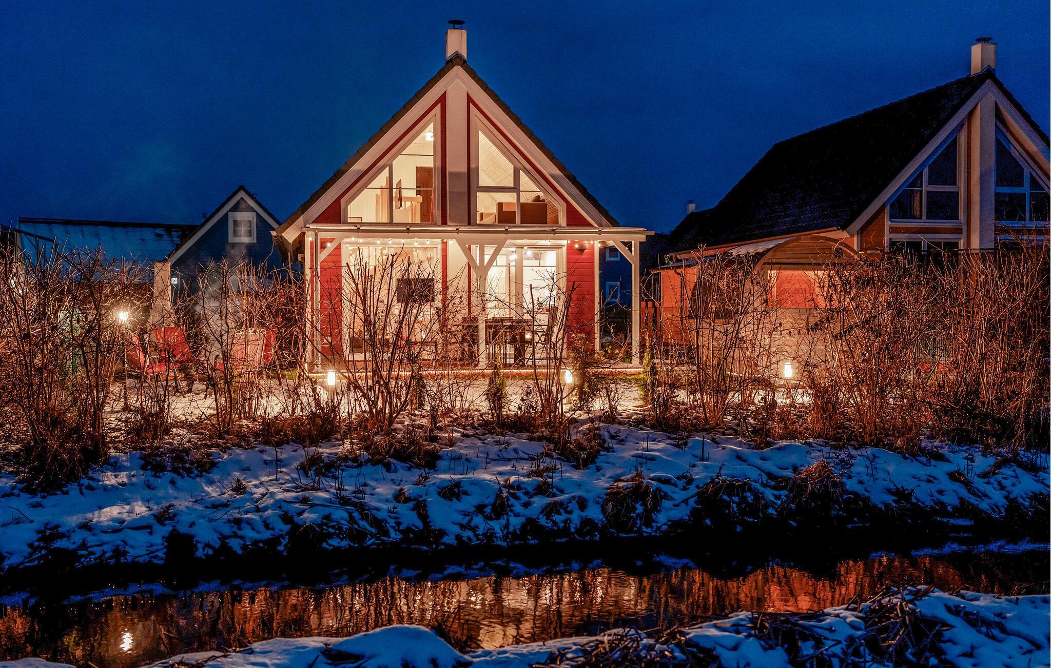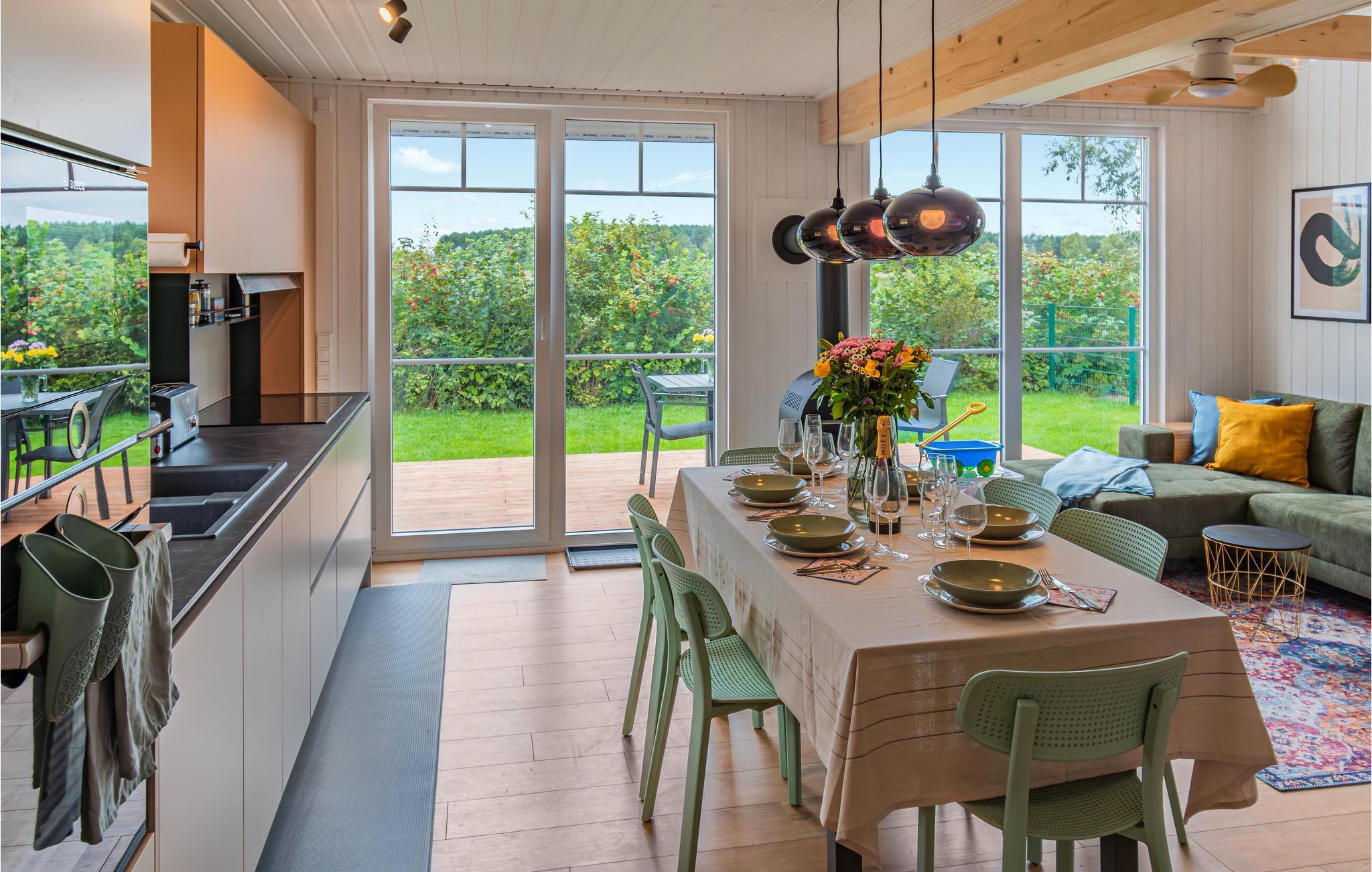 Det koselige og smakfullt innredede feriehuset i tre ligger like ved vannet og gir deg en fantastisk utsikt over landskapet. Gjennom de store panoramavinduene, som strekker seg fra gulv til tak, faller utsikten igjen og igjen og fra overalt på det fortryllende landskapet. Når som helst på året kan du sette deg godt til rette i den koselige stuen i første etasje etter lange dager i naturen. Når temperaturen synker, er det ingenting som er mer koselig enn å lese en bok, lage mat sammen med familien eller spille brettspill. Takket være den høye takhøyden og det åpne galleriet i 1. etasje er huset spesielt lyst og innbydende. Her kan du slappe av og trekke pusten dypt hele året.