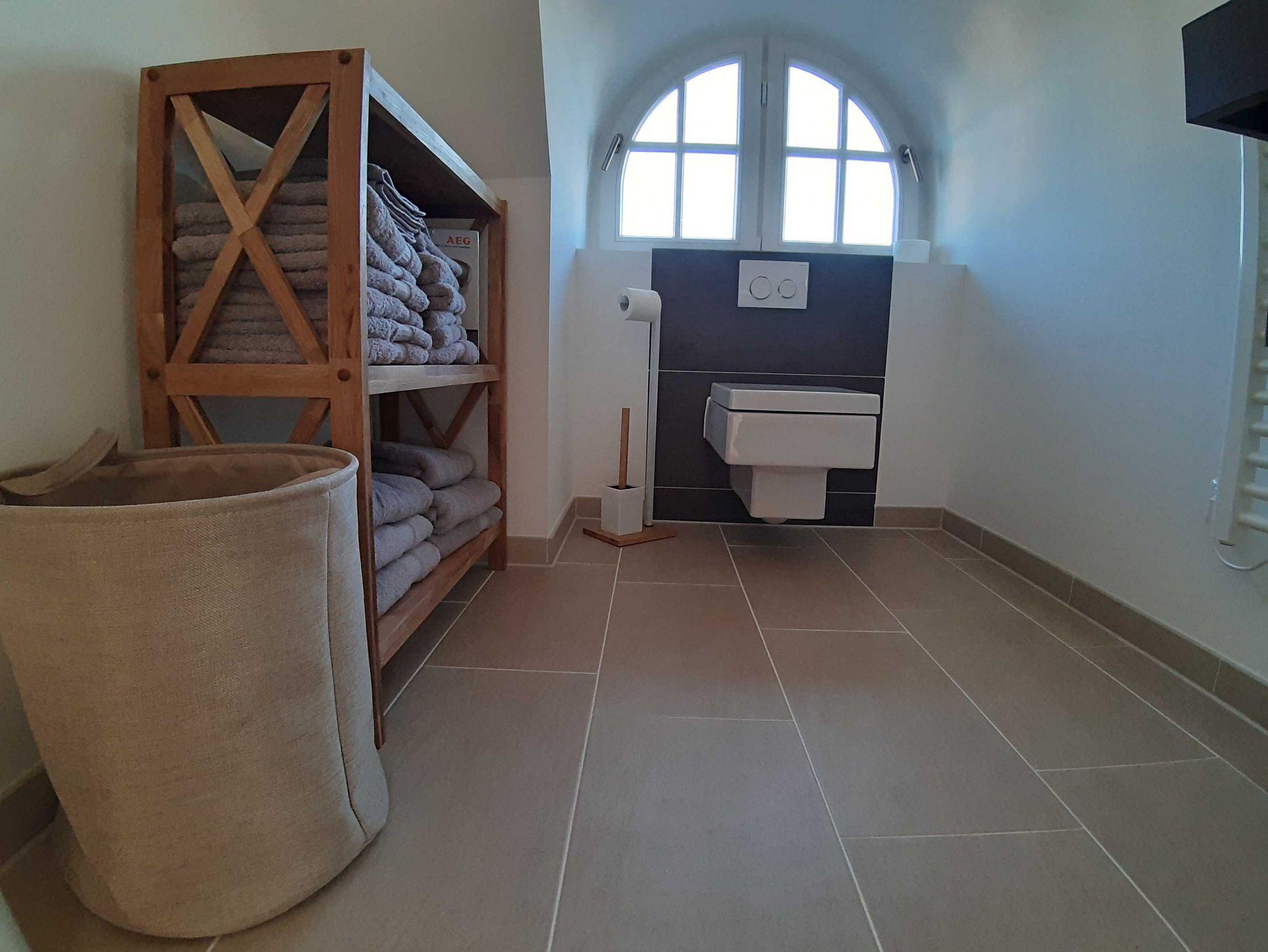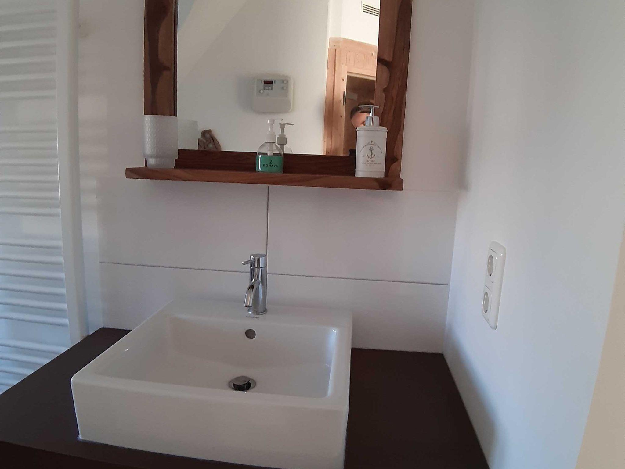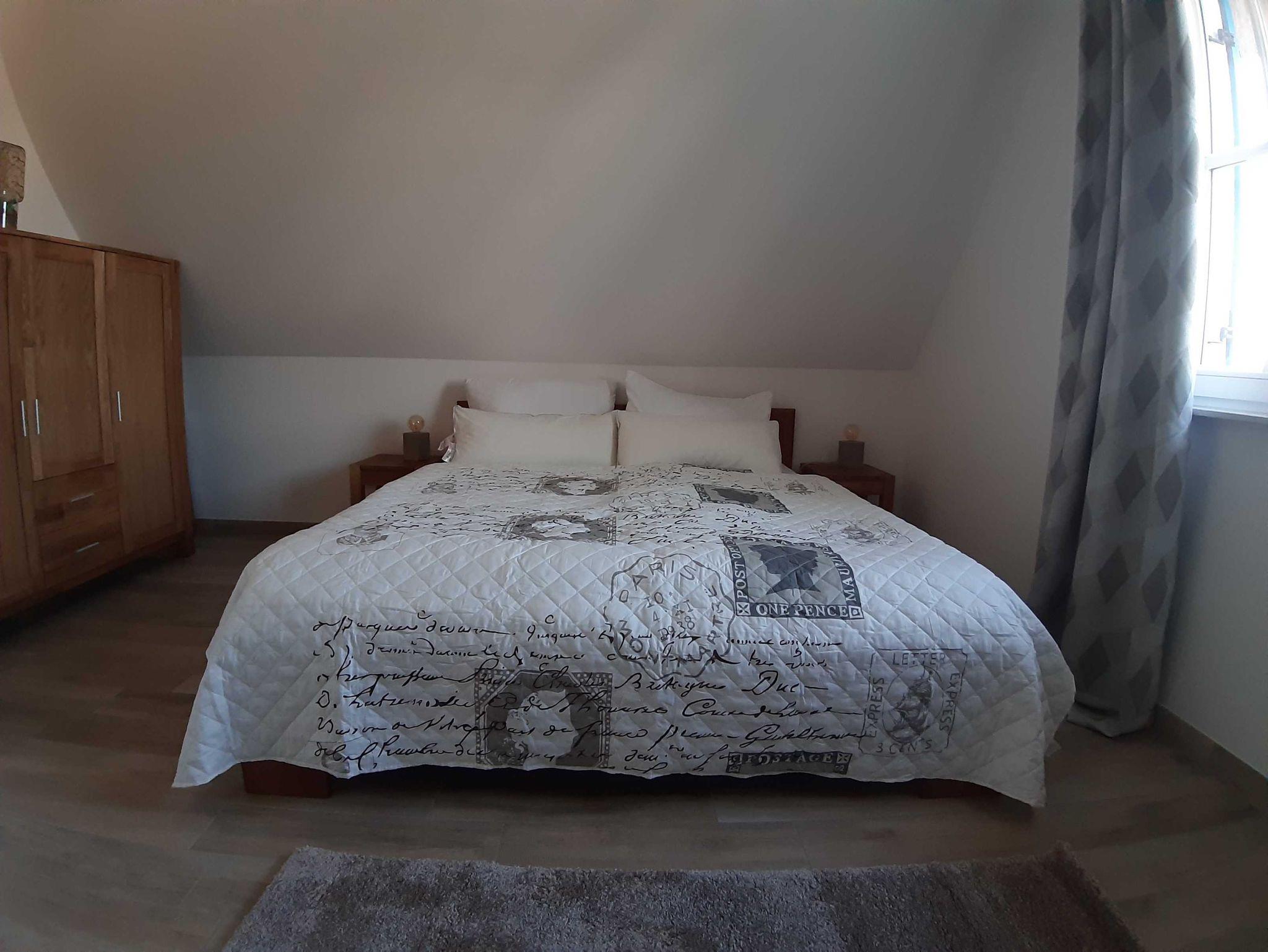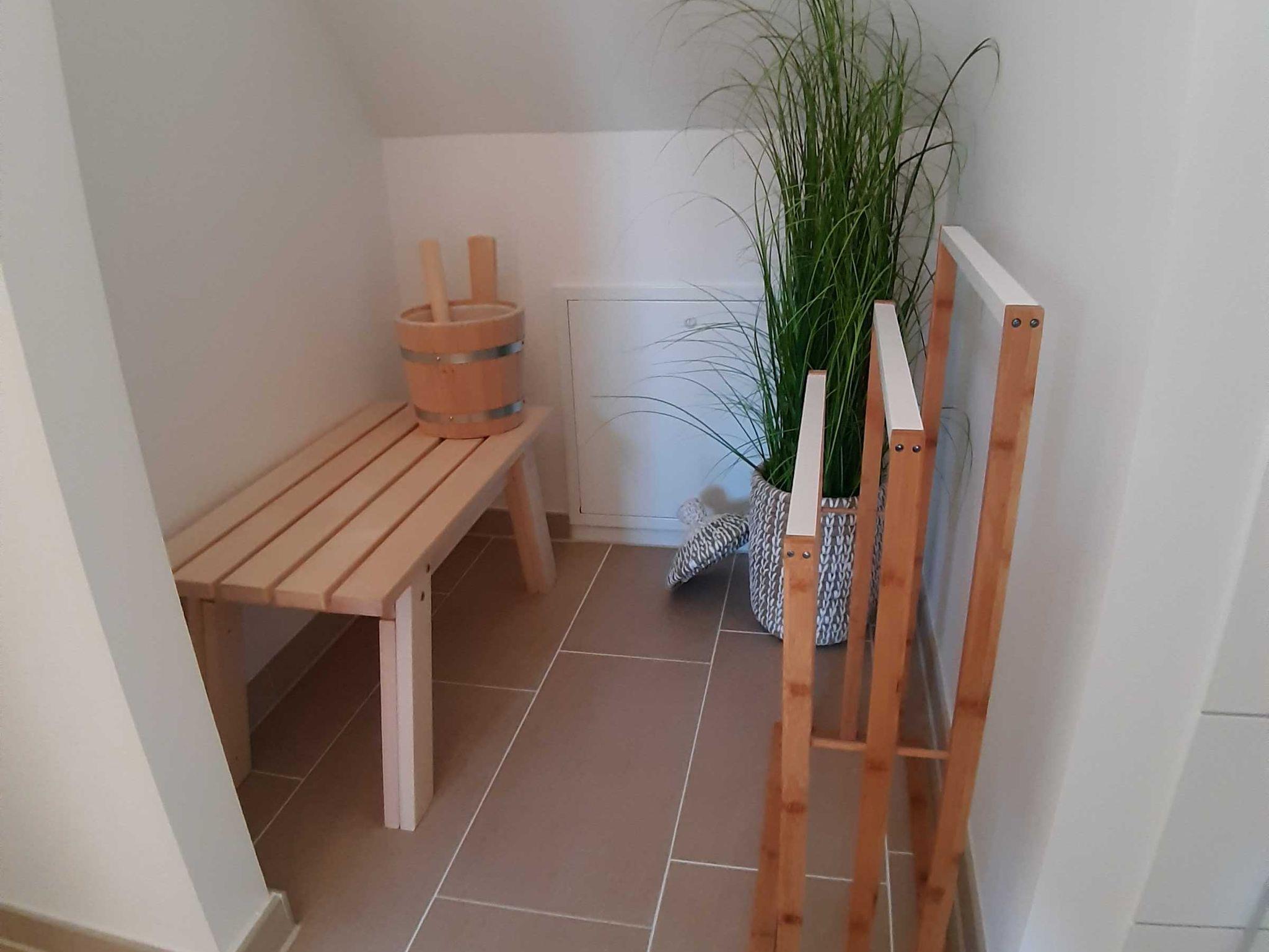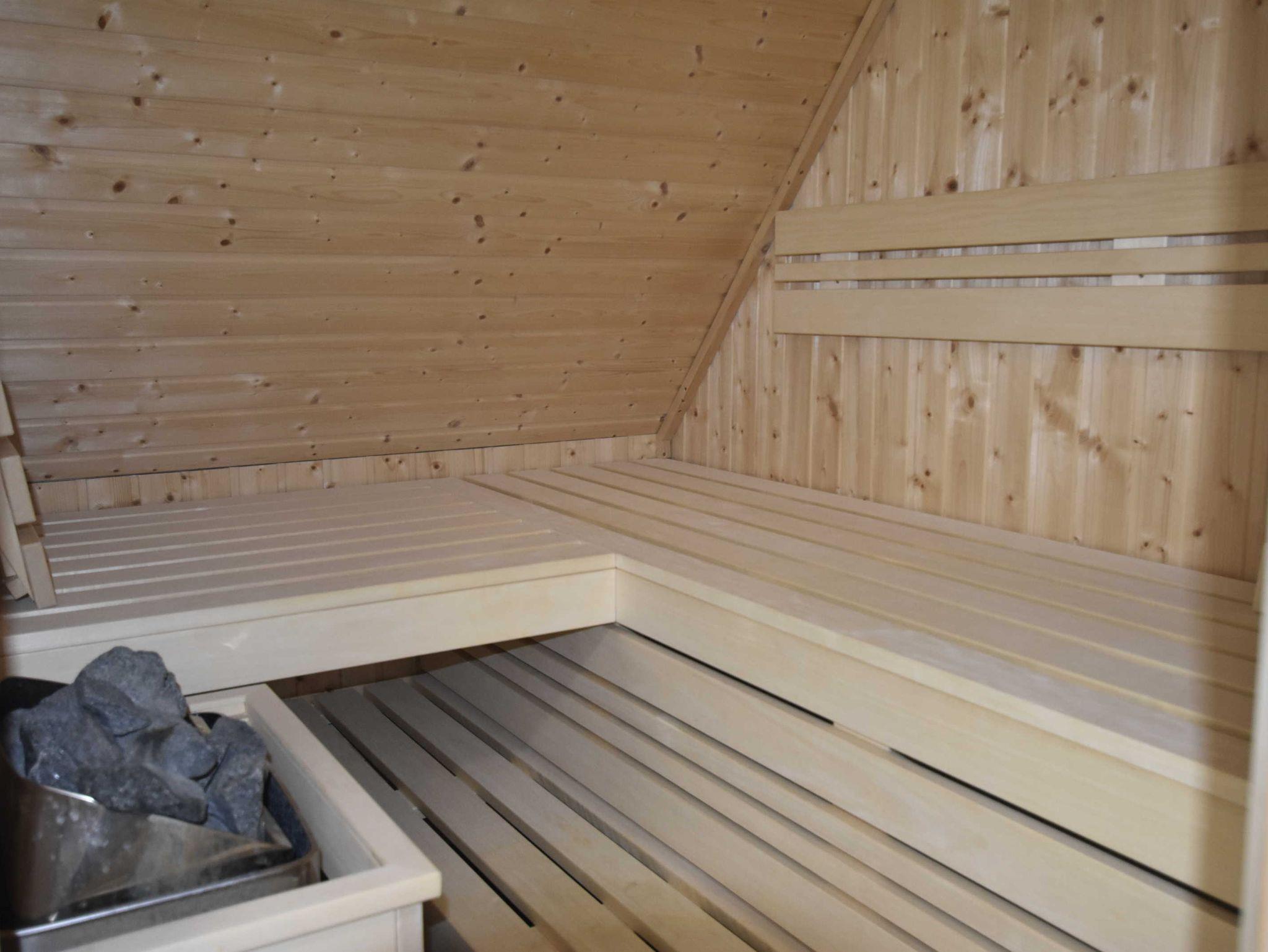 Obergeschoß: ein Schlafzimmer mit Doppelbett und Kommode und ein modernes Badezimmer mit Dusche / WC und eine private Sauna für die kalten Wintertage.