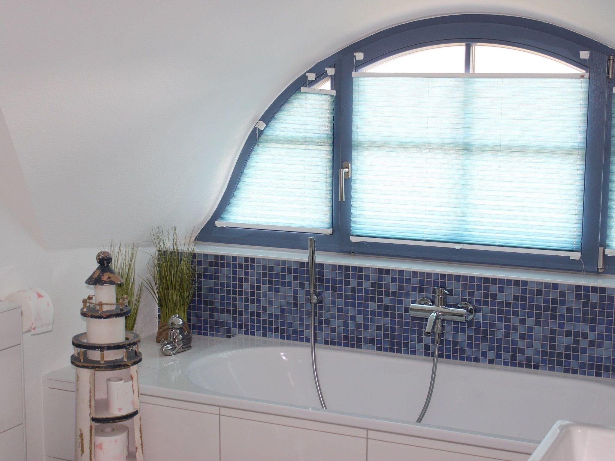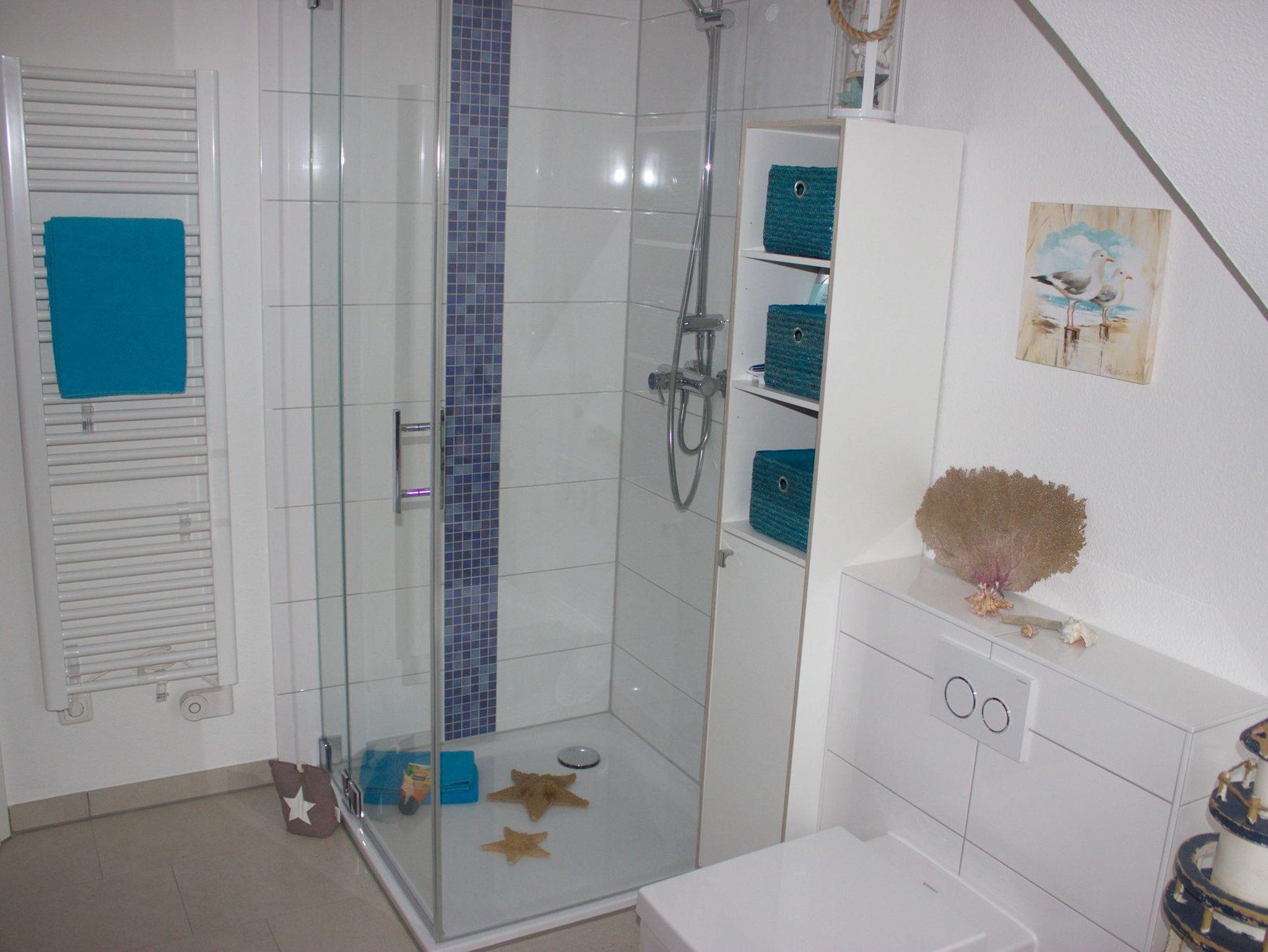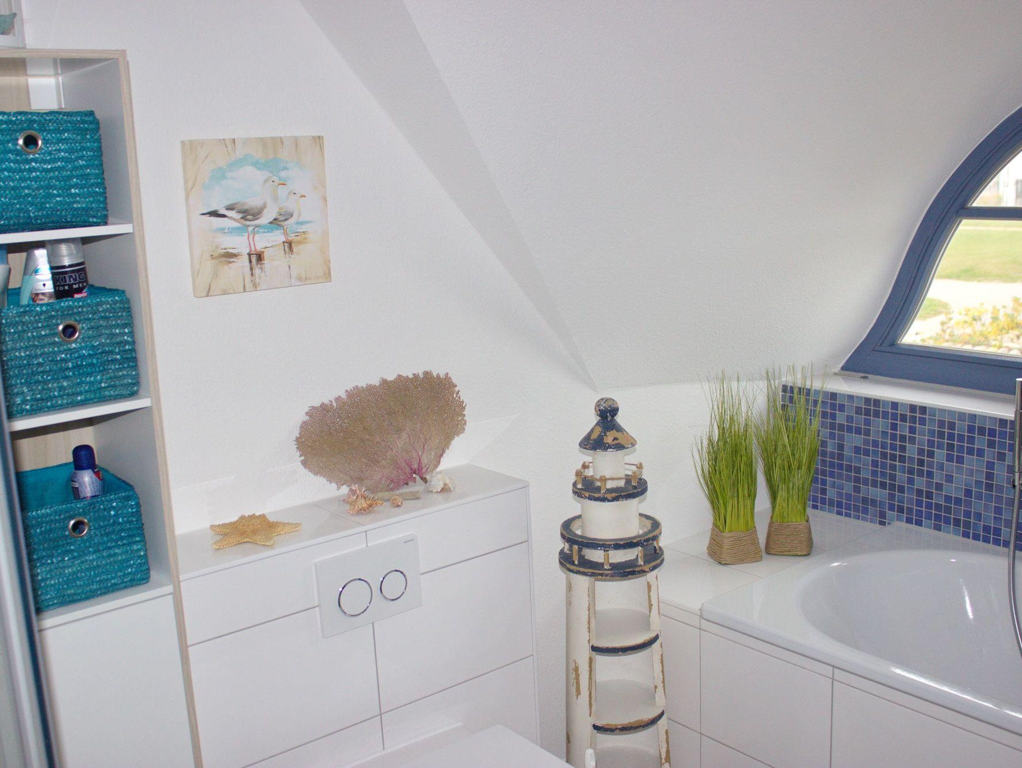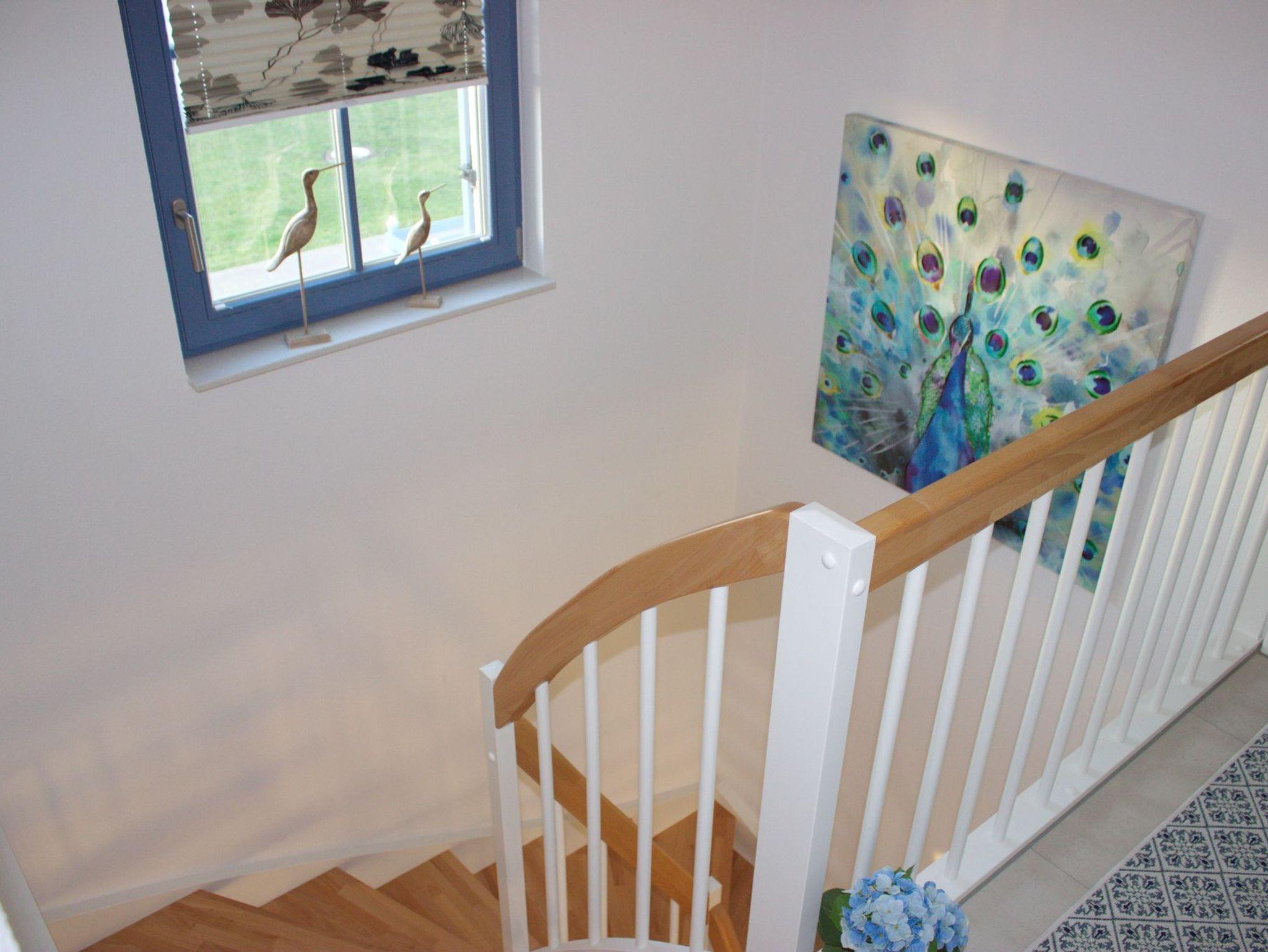 Im Obergeschoss des Ferienhauses befinden sich die drei Schlafzimmer und das Vollbad mit Badewanne und Dusche.