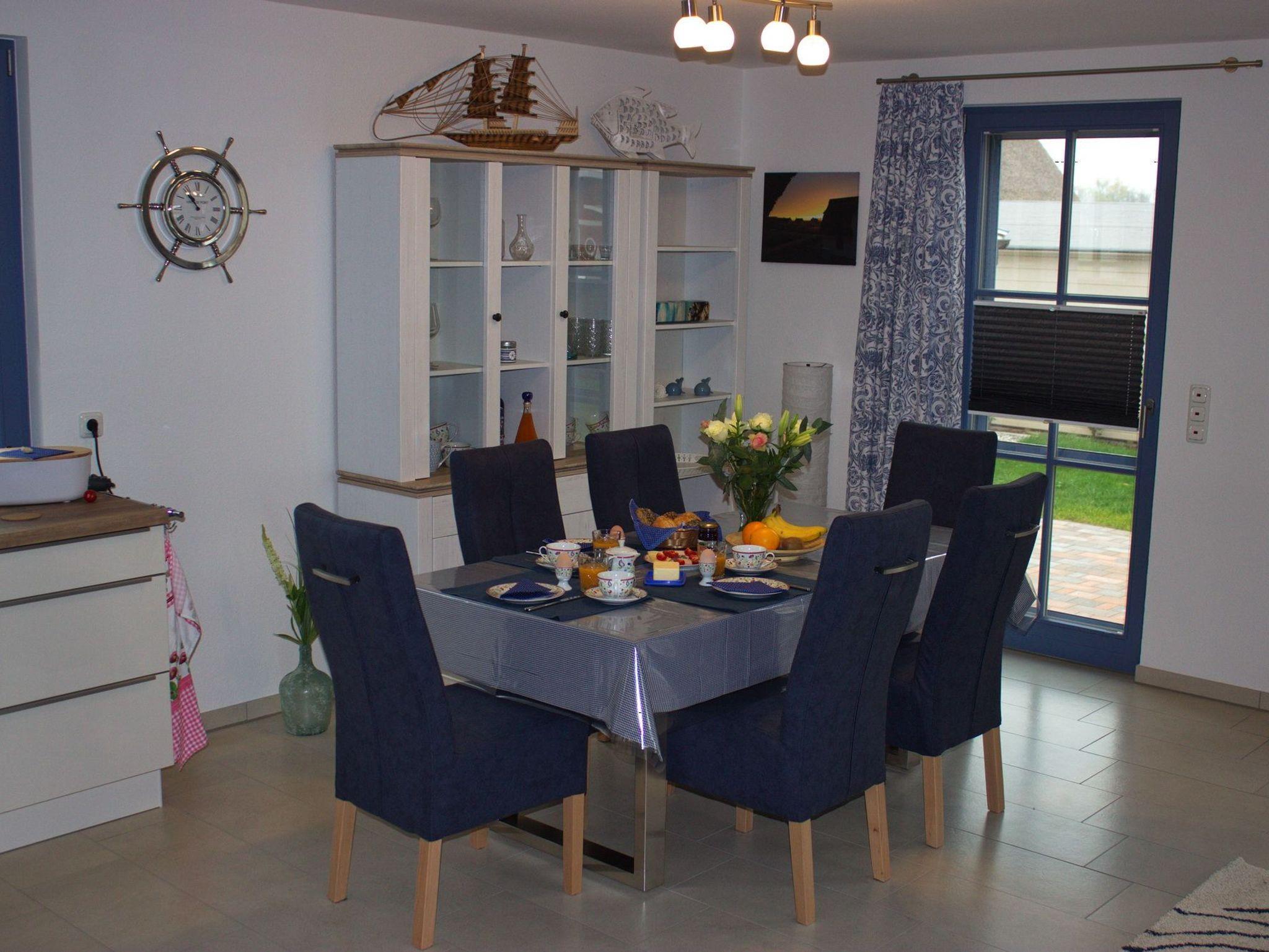 Am Esstisch haben bis zu 6 Personen Platz zum Speisen. Ein Kinderhochstuhl für die Kleinen steht bereit.