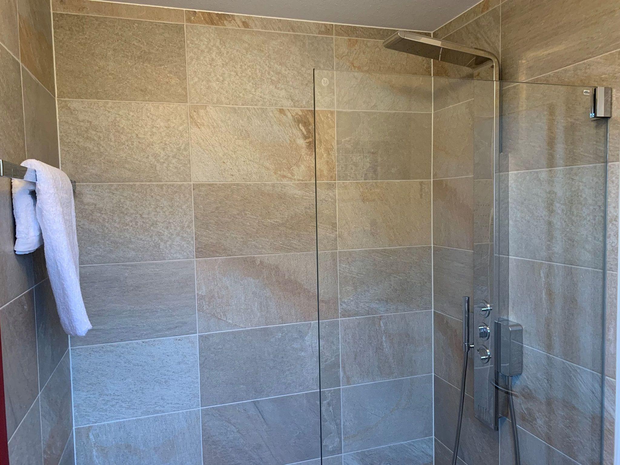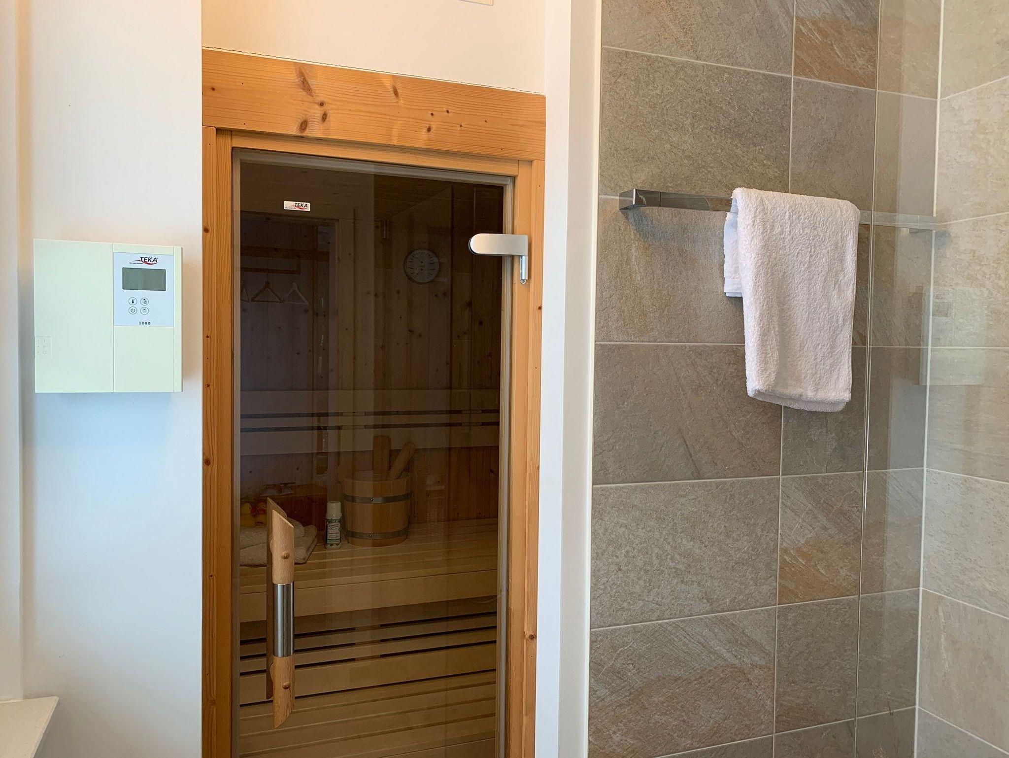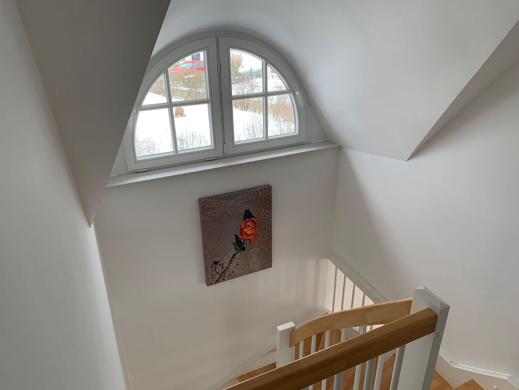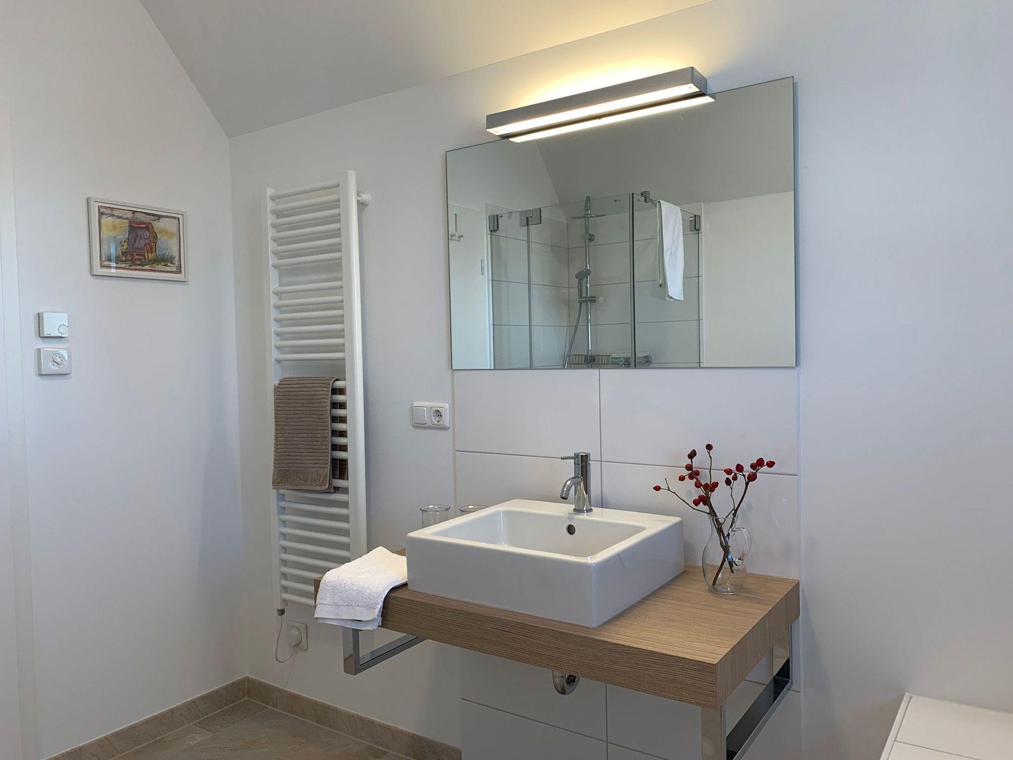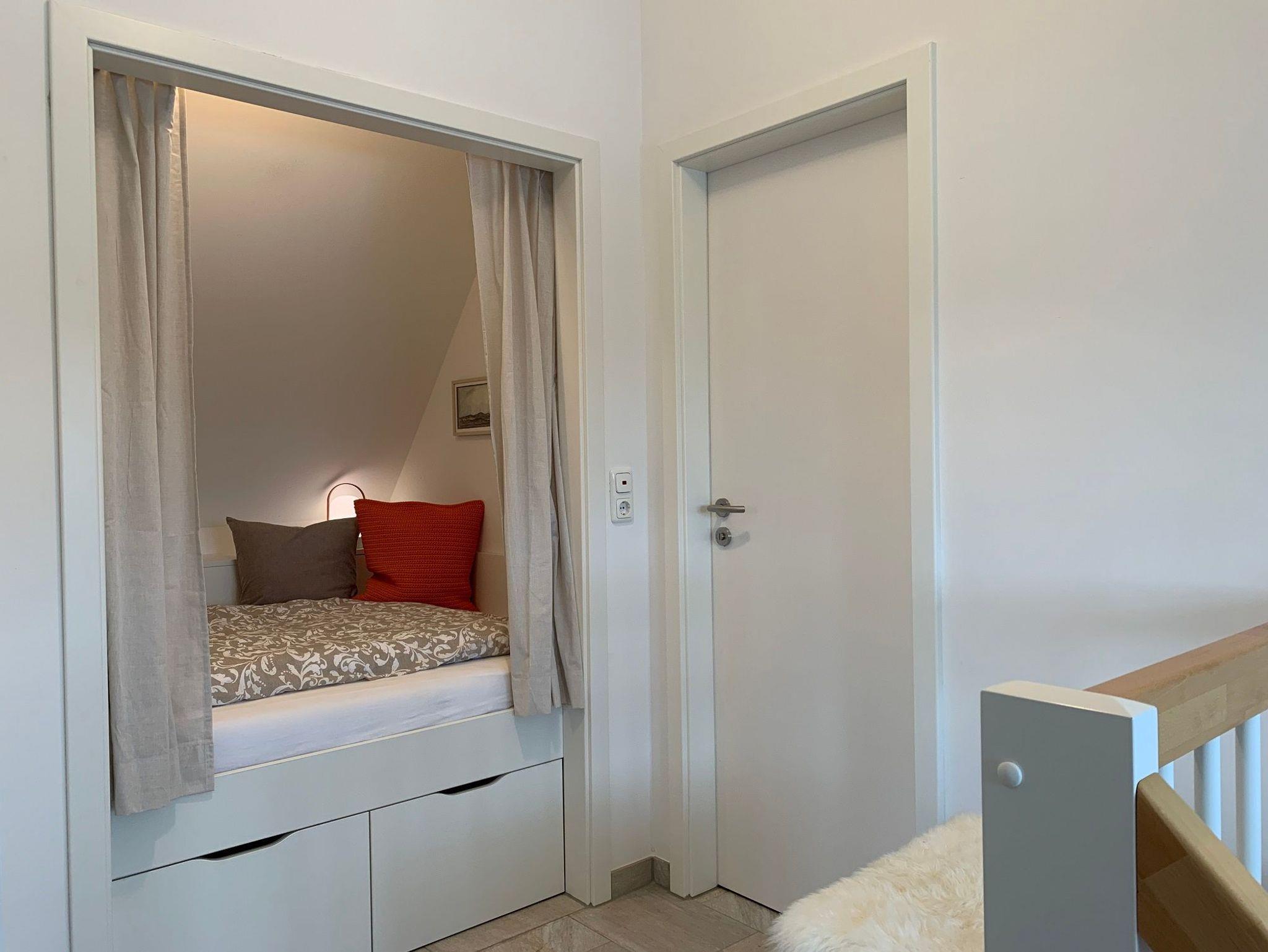 Das Erdgeschoss bietet einen Eingangsbereich mit Garderobe und massiver Sitzbank, einen Essplatz für 4-5 Personen und einen Wohnbereich mit Kaminofen, Bücherecke, TV und Musikanlage. Außerdem finden Sie hier eine separate, voll ausgestattete Küche, einen Hauswirtschaftsraum mit Waschmaschine und eine kleine Sauna mit Wellness-Dusche.