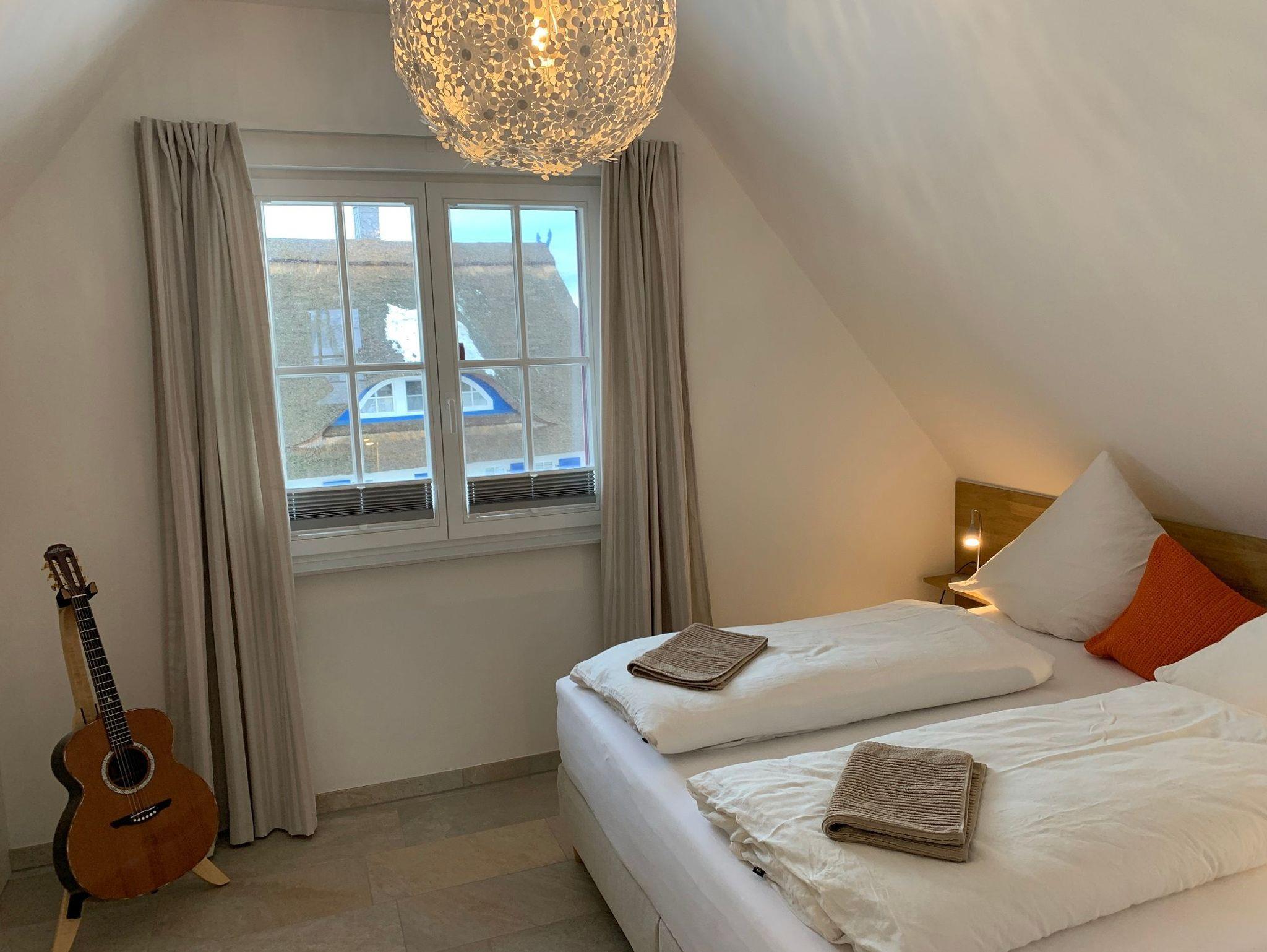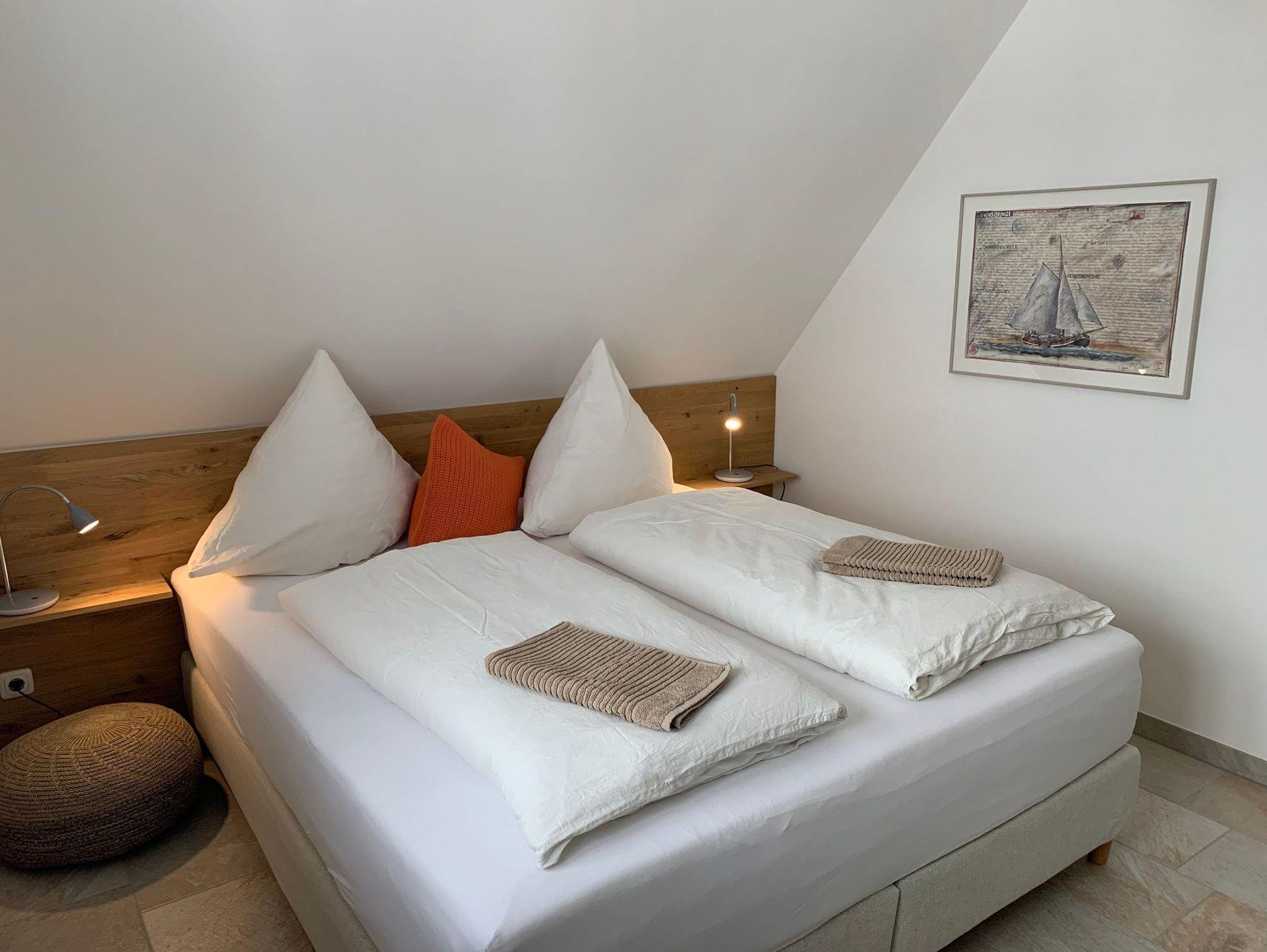Im Obergeschoss verbringen Sie im Schlafzimmer mit Doppel-Boxspringbett unter dem ?atmenden Reetdach? erholsame Nächte und finden in der kuscheligen Lounge-Koje weitere Ruhe- bzw. Schlaf-Möglichkeiten. Ein großzügiges Vollbad mit Dusche und einer Badewanne mit Blick auf das Reetdachdorf De Poeler Drift komplettiert das Wellness Vergnügen. Die Zimmer bieten durch maßgefertigte Einbaumöbel ausreichend Stauraum für persönliche Dinge und können durch Plissees, Vorhänge und Fensterläden abgedunkelt werden.