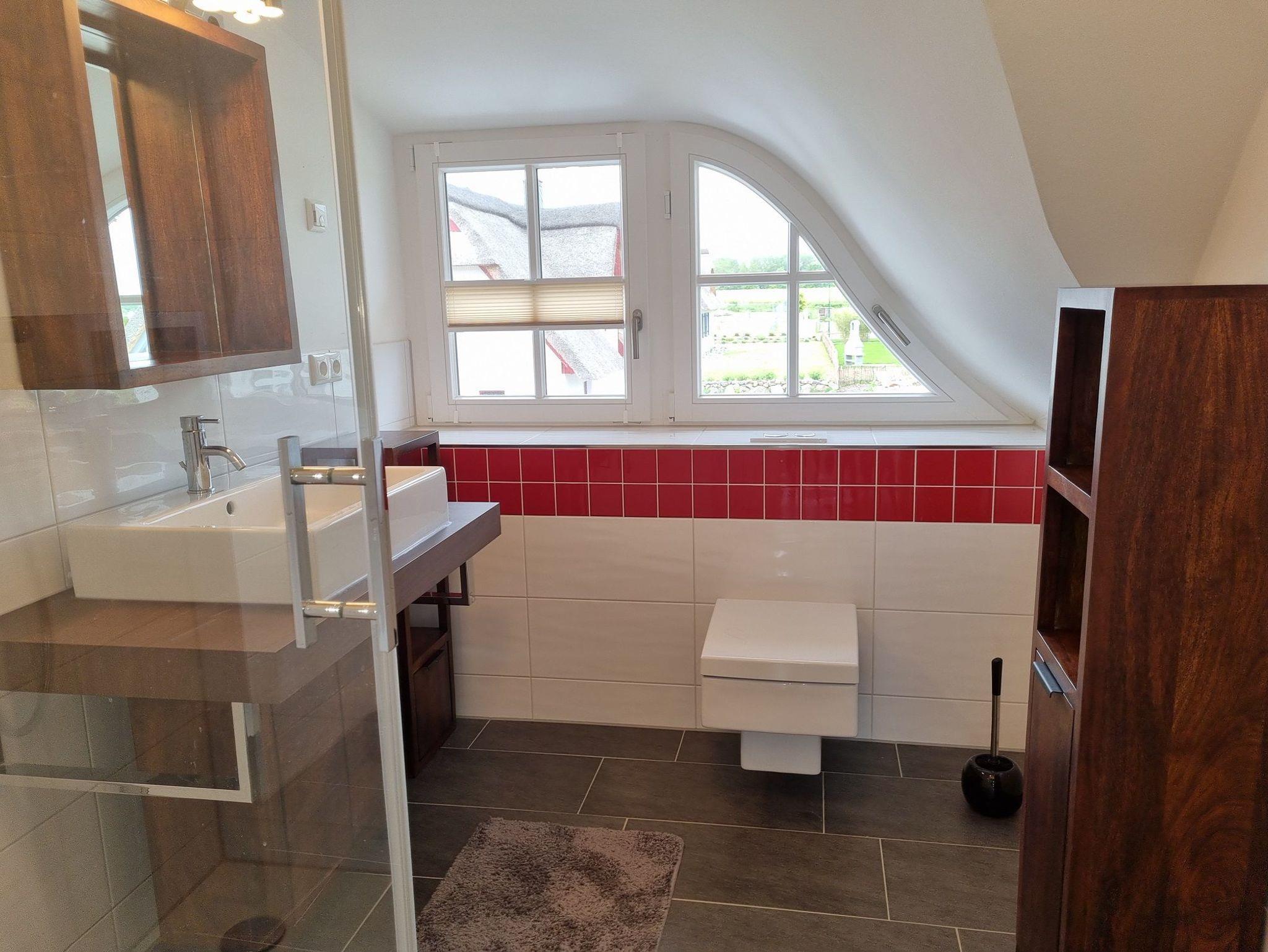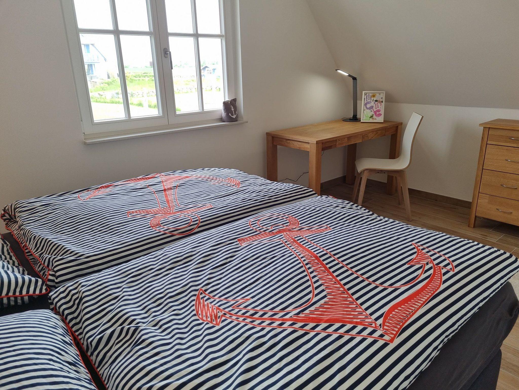 Im Obergeschoss finden Sie zwei Schlafzimmer, jedes mit hochwertigen Boxspring-Doppelbetten und eines zudem mit einem weiteren Einzelbett ausgestattet. In beiden Schlafzimmern hat ein Babybett zusätzlich Platz. Treppauf im rechten Schlafzimmer ist ein kleiner Arbeitstisch eingerichtet. Aus diesem Zimmer können Sie sogar den ?Utkiek? über die Felder auf die Ostsee der Wismarer Bucht genießen ? gerne auch aus dem Bett. Das linke Schlafzimmer ist ausgestattet mit einem Smart-TV mit Satellitenanschluss und einer Bücherecke mit Kinderbüchern für unsere jüngeren Gäste. Zwischen den beiden Schlafzimmern befindet sich das zweite Badezimmer mit Waschbecken, Dusche und Toilette.