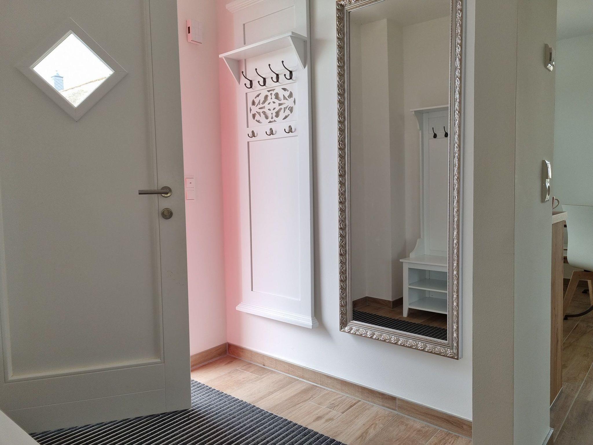Im Erdgeschoß des Reethauses befindet sich der Eingangsbereich mit Sauberlauf und separater Gästetoilette mit Waschbecken.
