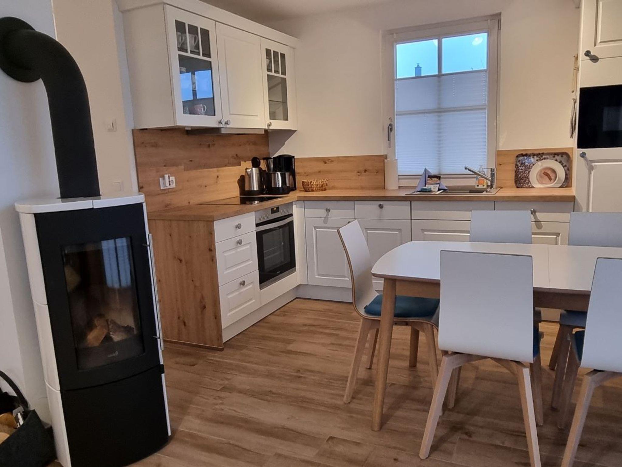 Vom Eingangsbereich gelangen Sie über einen kleinen Flur links in den Küchen- und Wohnbereich mit einem Holz-Kaminofen. Kaminholz kann im Hagebaumarkt Gägelow erworben werden.