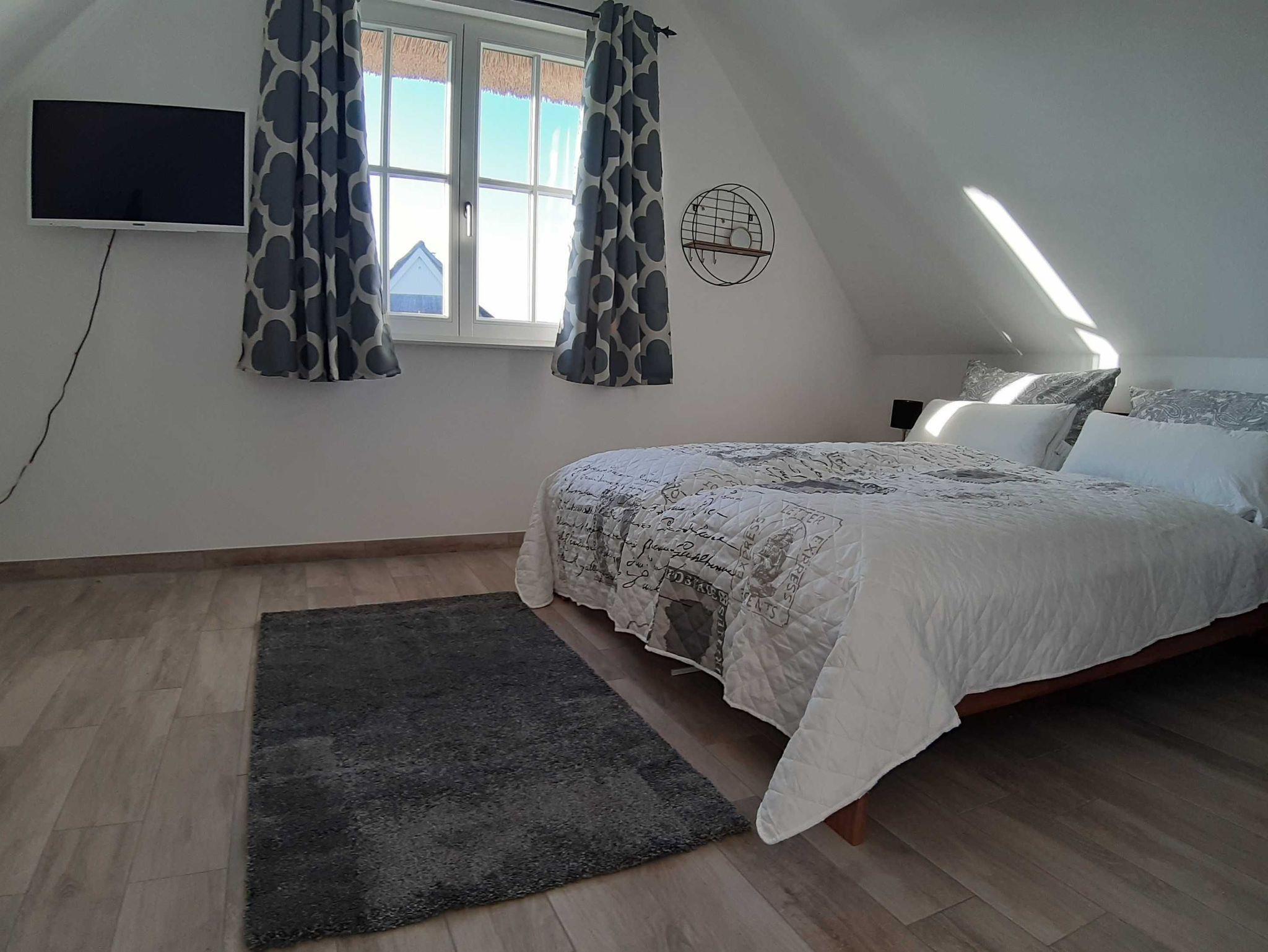 Obergeschoß: ein Schlafzimmer mit Doppelbett und Kommode und ein modernes Badezimmer mit Dusche / WC und eine private Sauna für die kalten Wintertage.