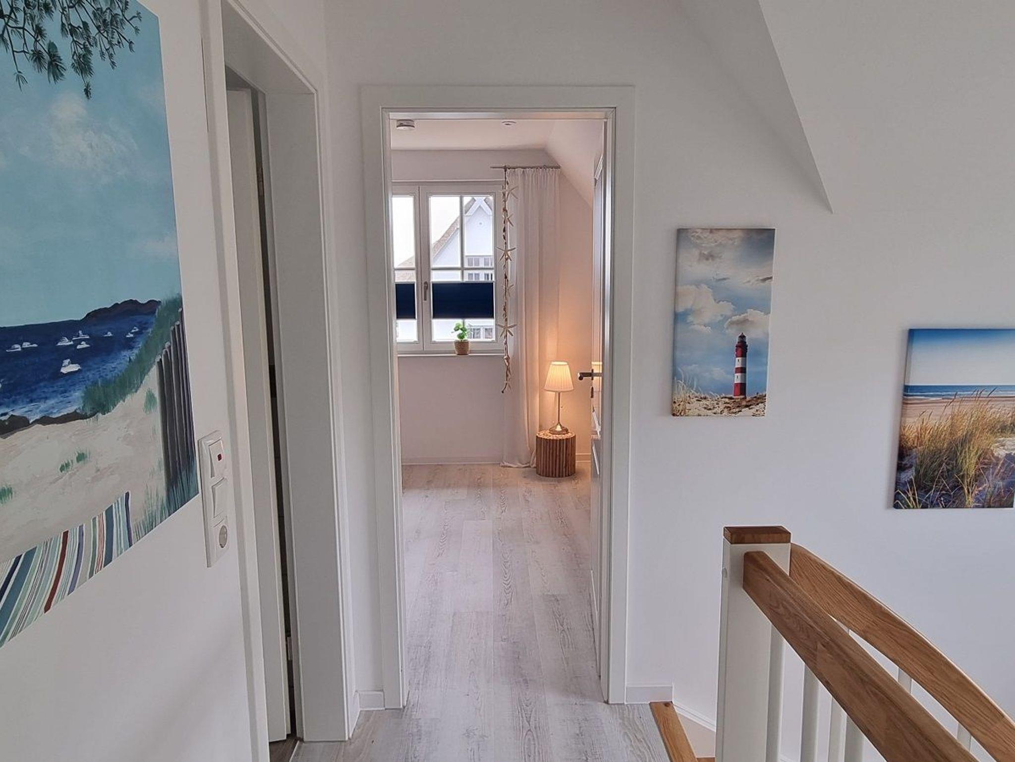 Der helle Treppenaufgang führt ins Übergeschoss mit zwei Schlafzimmern und modernen Duschbad.