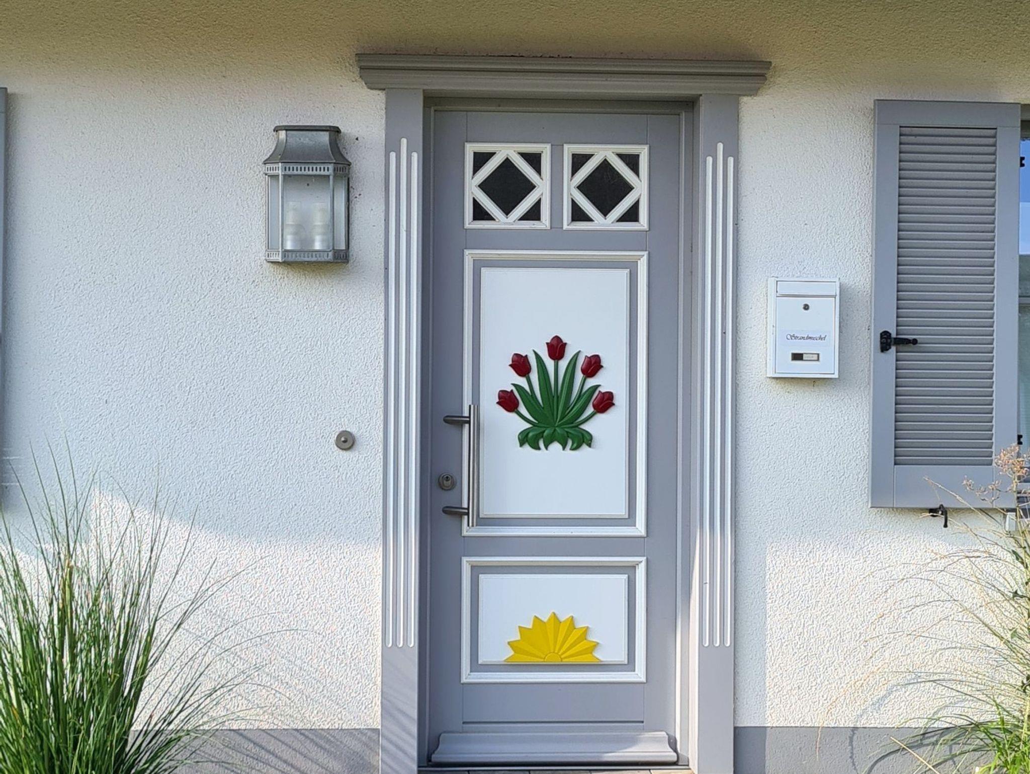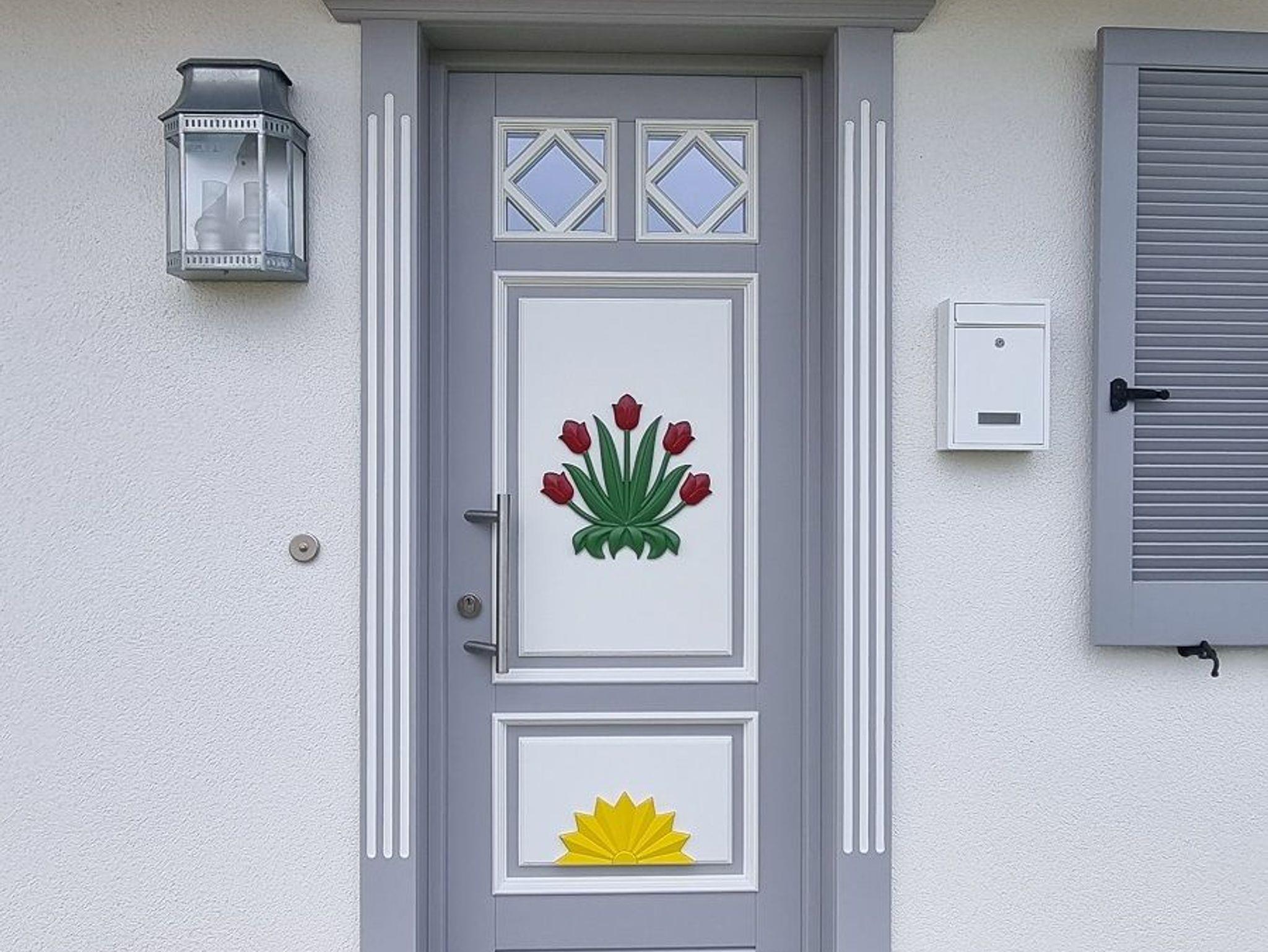 Die typische Seemannstür mit den schönen Ornamenten heißt Sie willkommen im Haus Strandmuschel.