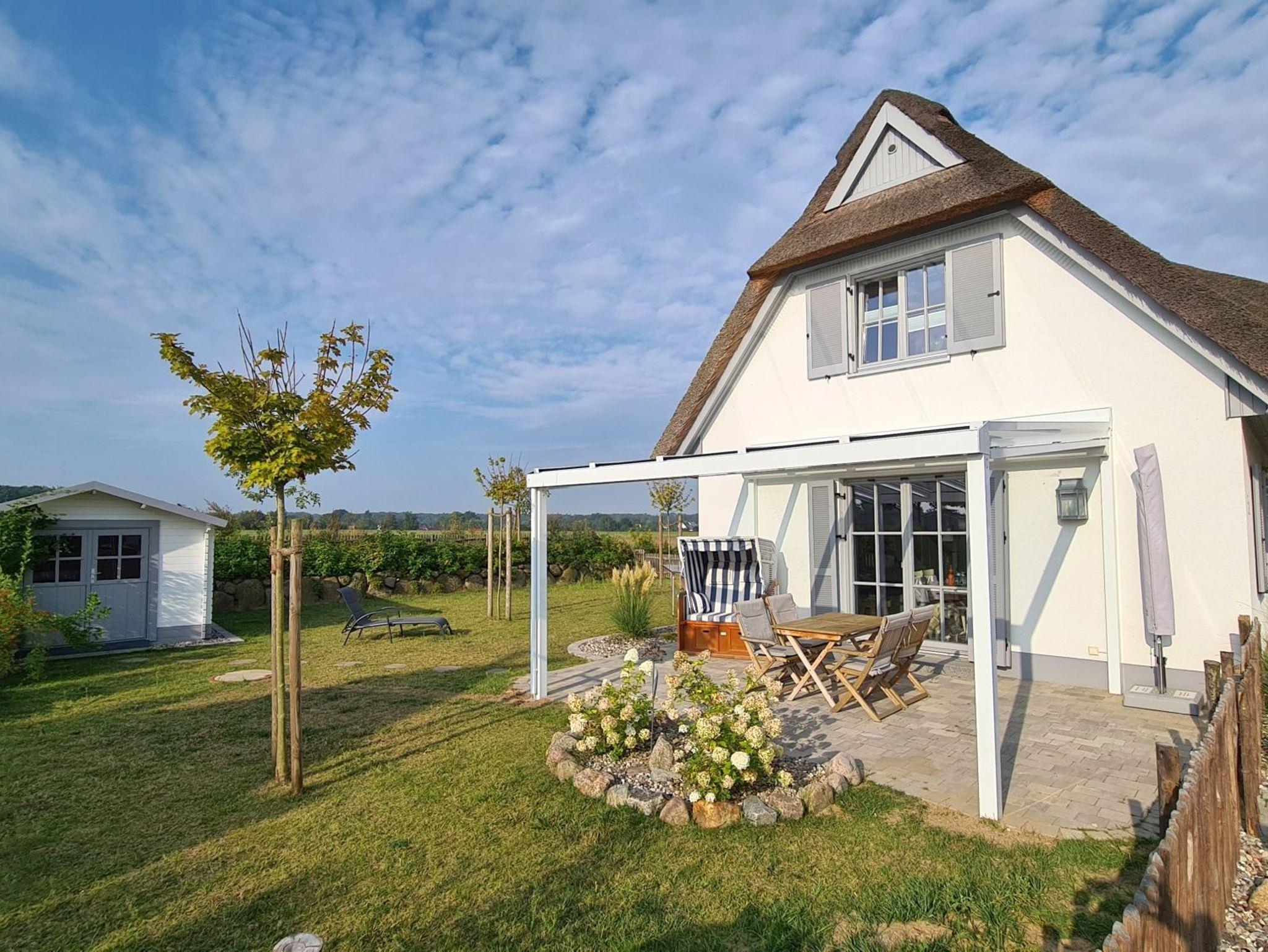 Das Gartenhäuschen im Garten bietet nicht nur Unterstellmöglichkeit für mitgebrachte Räder. Ein elektrischer Grill und Holzmöbel für die umlaufende Terrasse finden dort Ihren Platz. Genießen Sie den Wiesenblick vom hauseigenen Strandkorb.