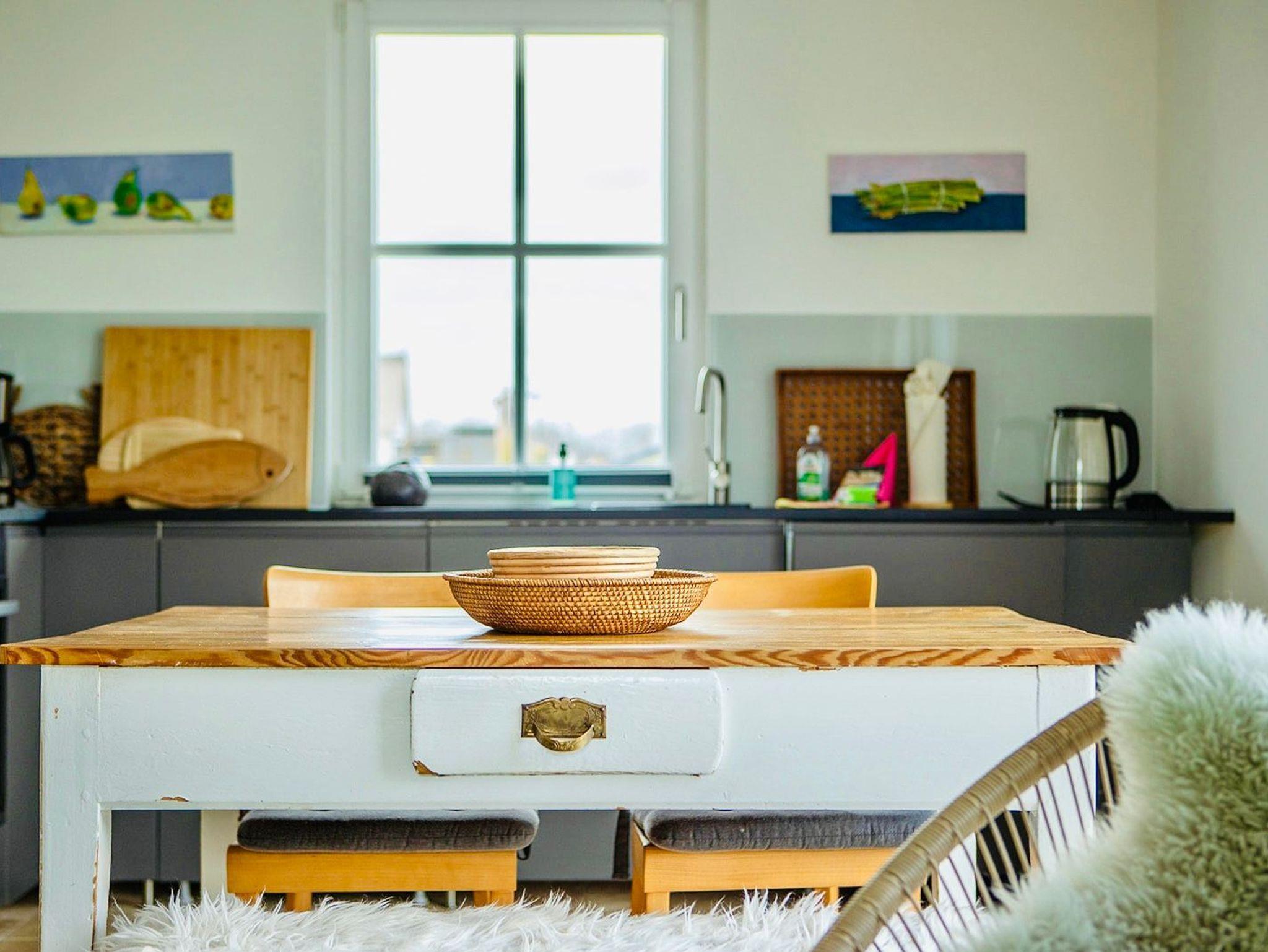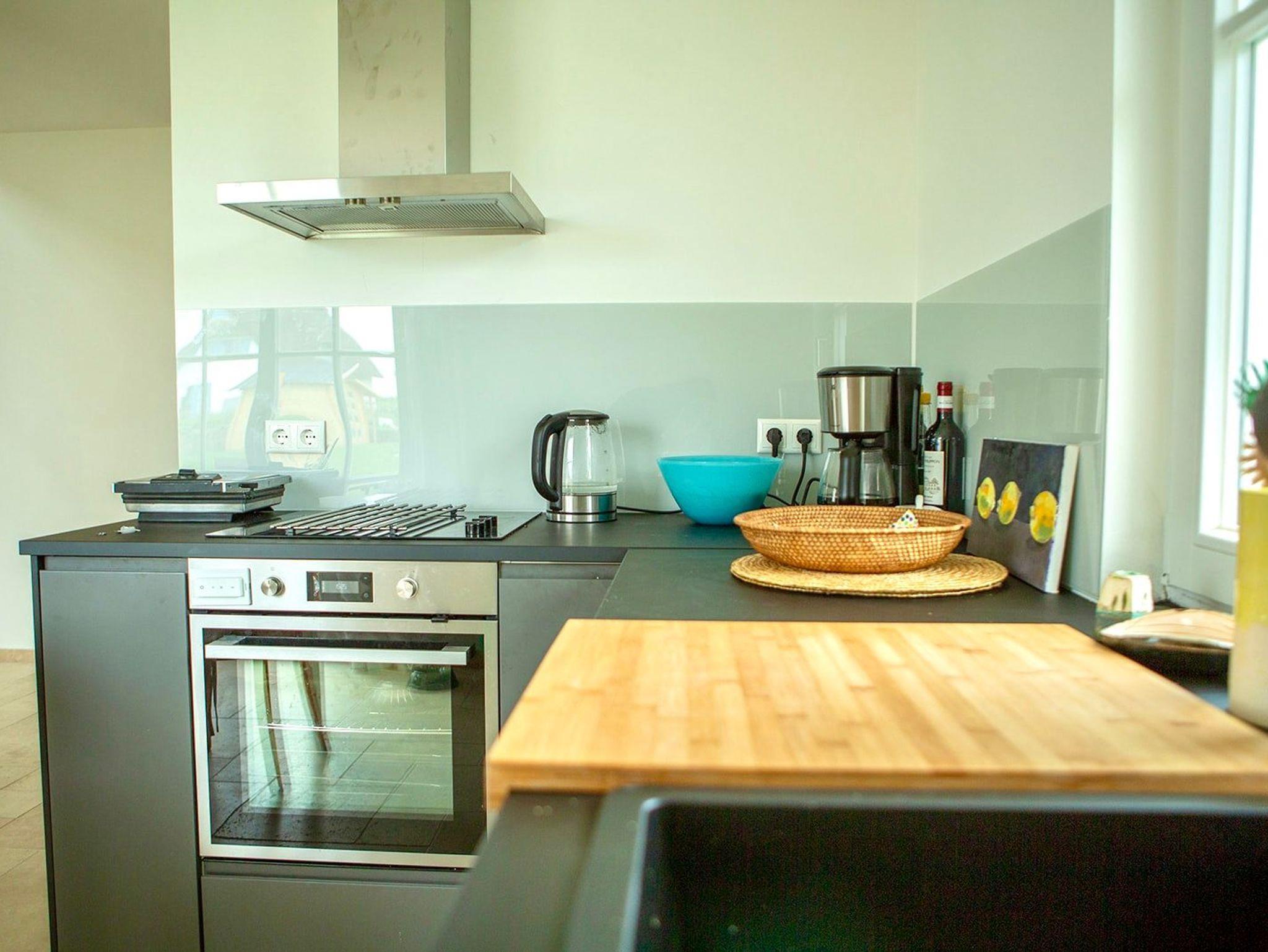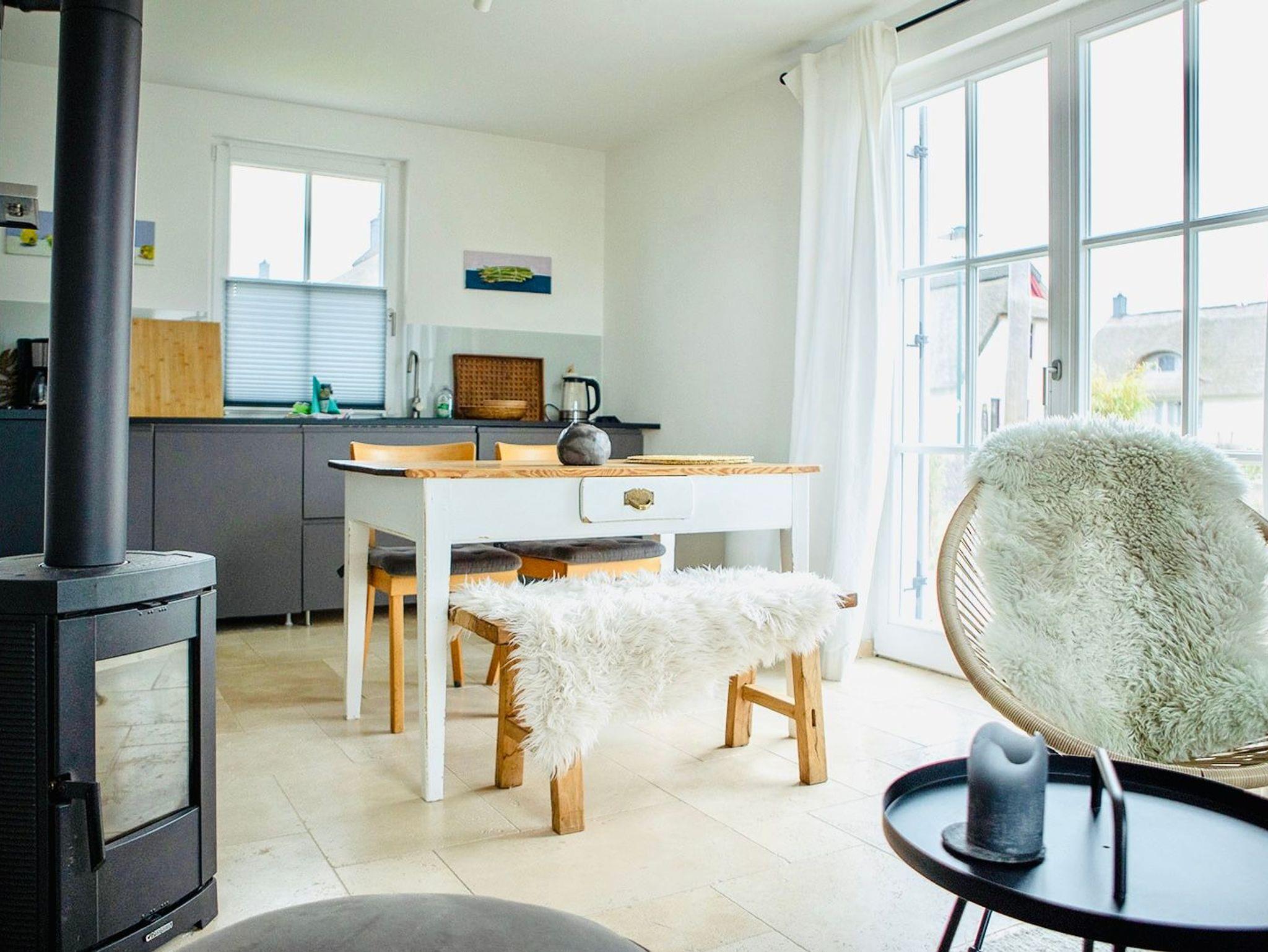 Die 2021 fertiggestellte Reetdach-Doppelhaushälfte wurde von uns liebevoll eingerichtet und ausgestattet. Im Erdgeschoss empfängt Sie die offen gestaltete Wohnküche mit einer voll ausgestatteten Küchenzeile (Backofen, Cerankochfeld, Geschirrspüler, Kaffeemaschine, SodaStream, Toaster, Wasserkocher u.v.m.), einem wunderbaren Essplatz mit Blick in den Garten und eine gemütliche Sofaecke mit Kaminofen. Hier finden Sie alles, um gemeinsam den Tag zu beginnen oder mit einem Kochabend und einem Glas Wein vor dem Kamin ausklingen zu lassen. Eine Auswahl an Gesellschaftsspielen, Spielzeug und (Kinder)Büchern ist ebenfalls vorhanden. Auf derselben Ebene befindet sich auch ein Hauswirtschaftsraum mit Waschmaschine sowie kleinem Gefrierschrank, ein separates WC und ein kleiner, aber feiner Wellnessbereich mit Sauna und begehbarer Rainshower-Dusche.