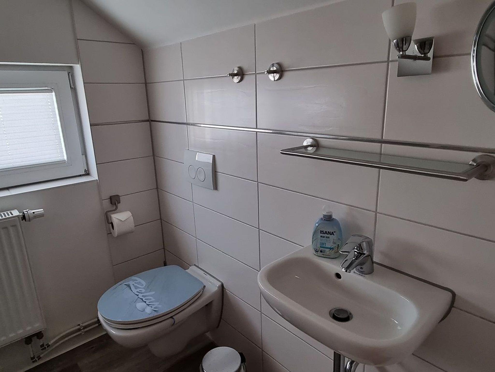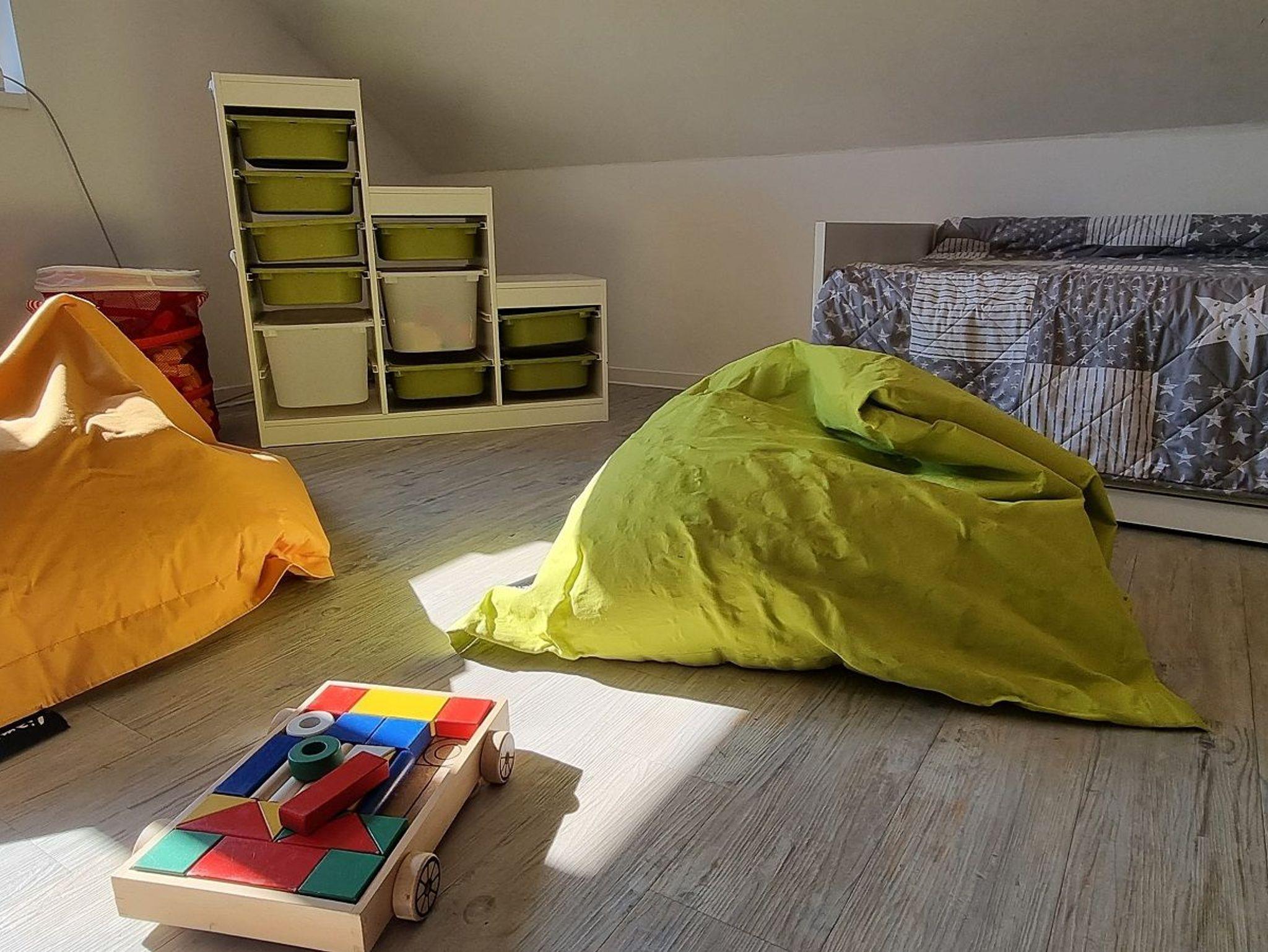 Eine Holztreppe führt in den ausgebauten Dachboden. Dort befindet sich ein weiteres großes Schlafzimmer mit Einzelbetten und ein Gäste-WC. Das Kinderzimmer ist ebenfalls mit einem TV und vielen Spielsachen eingerichtet.