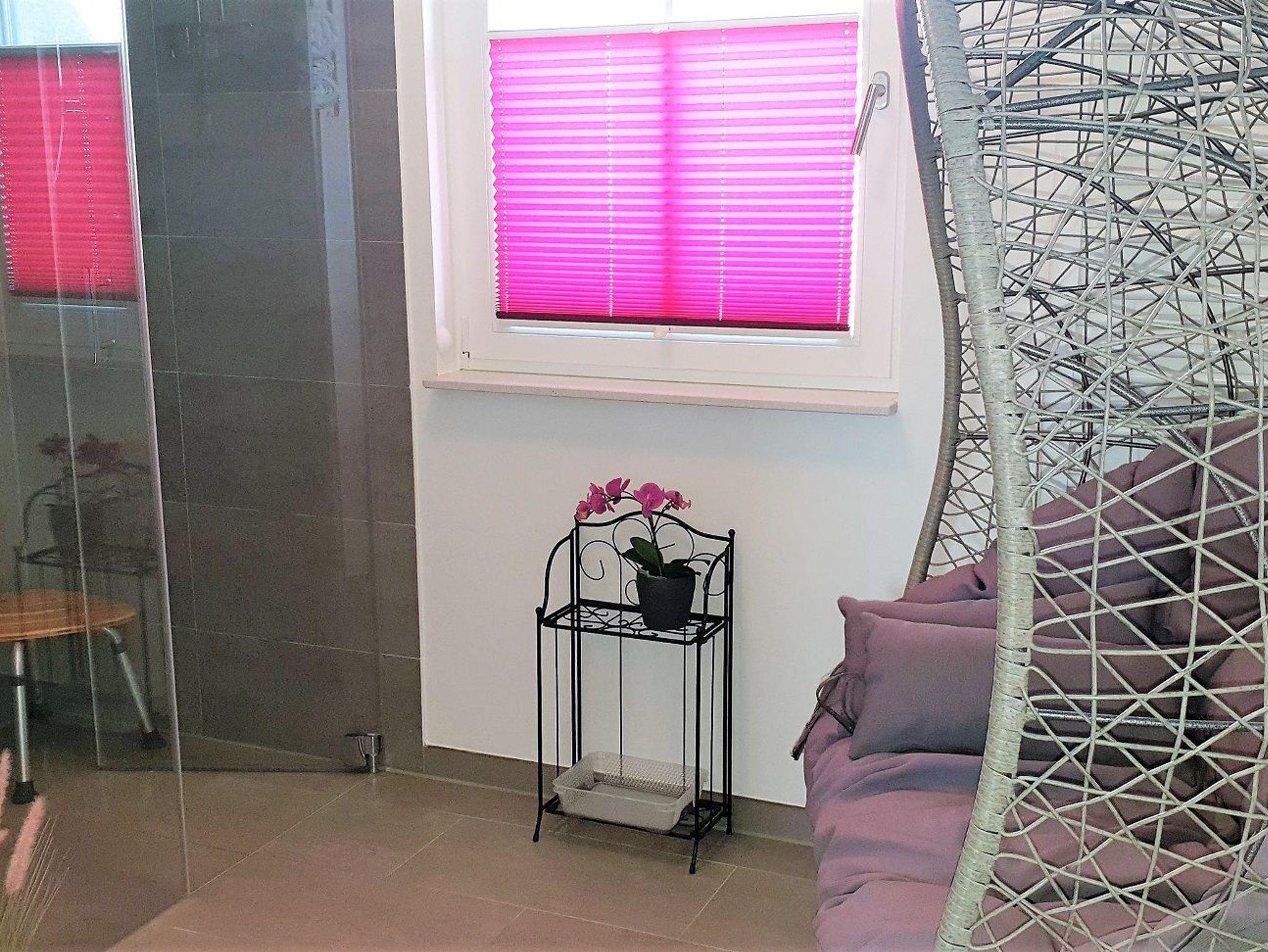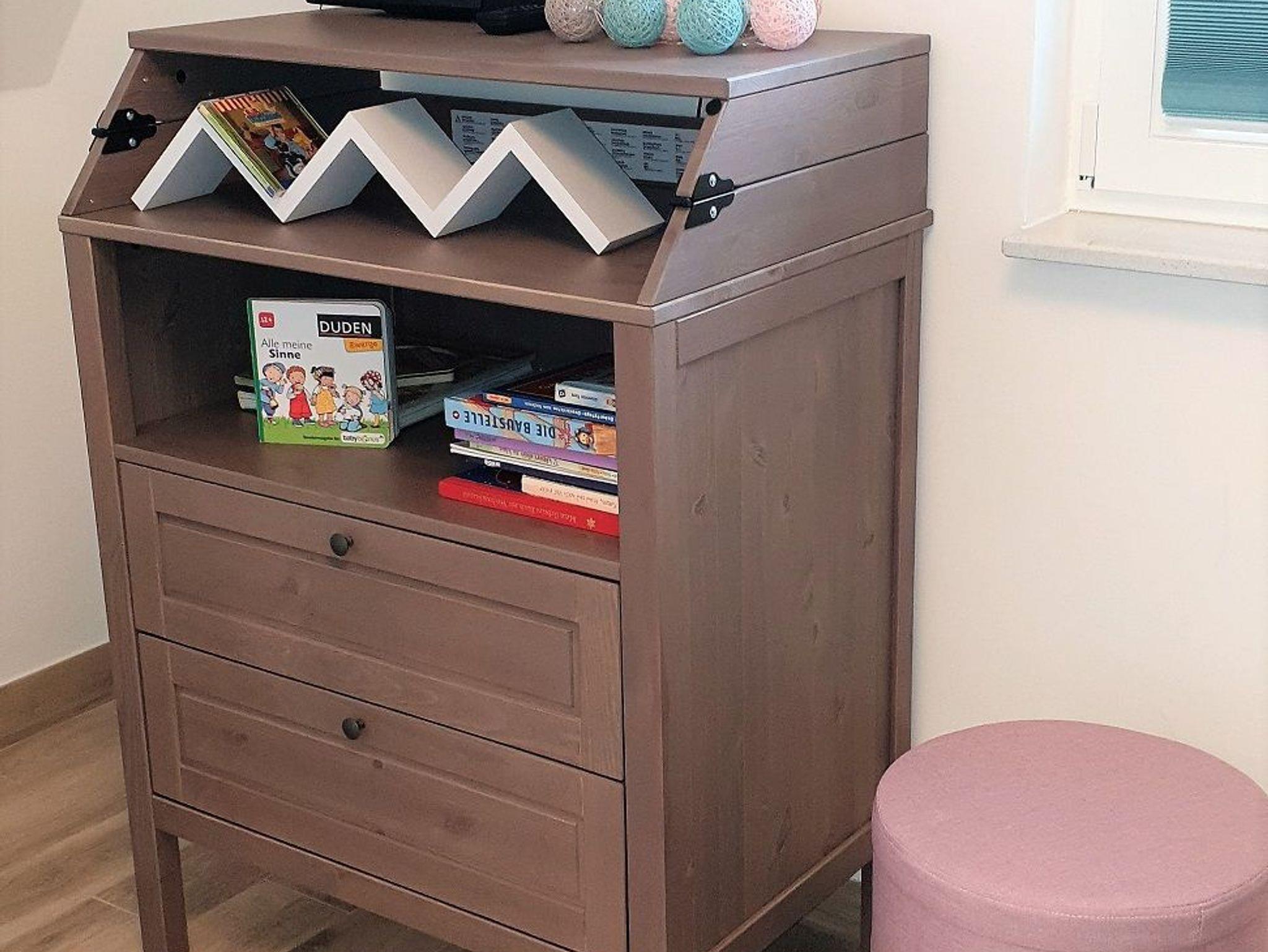 Zusätzlich ist eine Wickelkommode mit Spielzeug und Büchern, ein Kinderreisebett und ein Kinderhochstuhl für die ganz kleinen Gäste vorhanden.