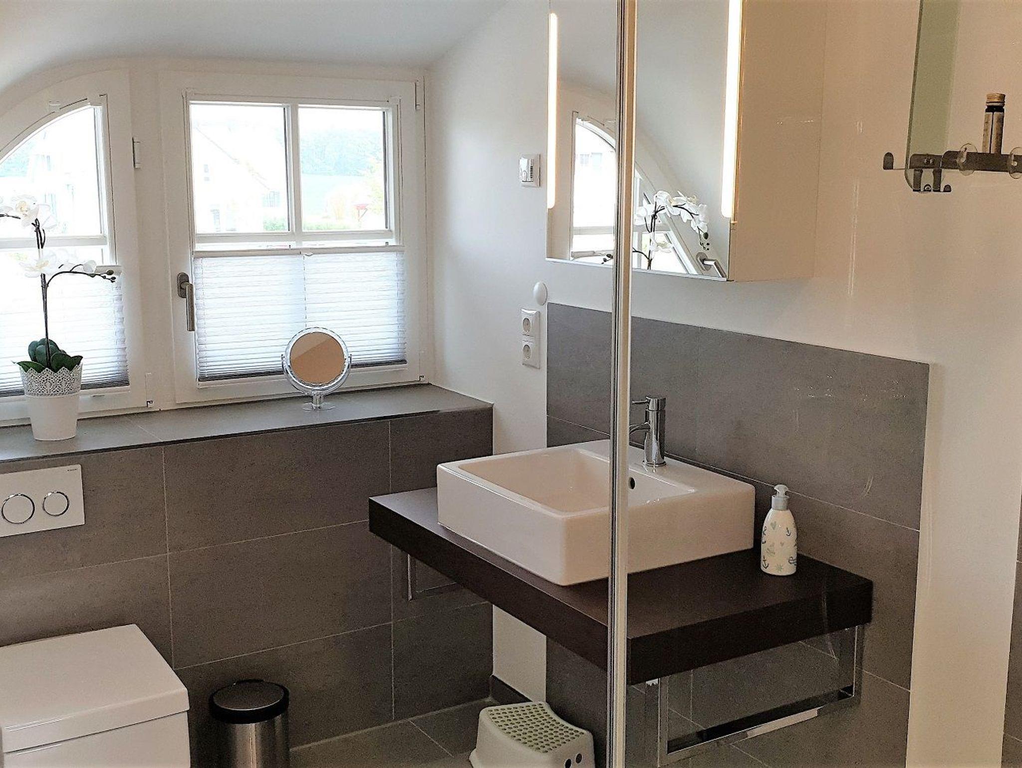 Im Obergeschoss befindet sich das zweite Badezimmer mit Regendusche und wundervollem Blick auf die Ostsee.