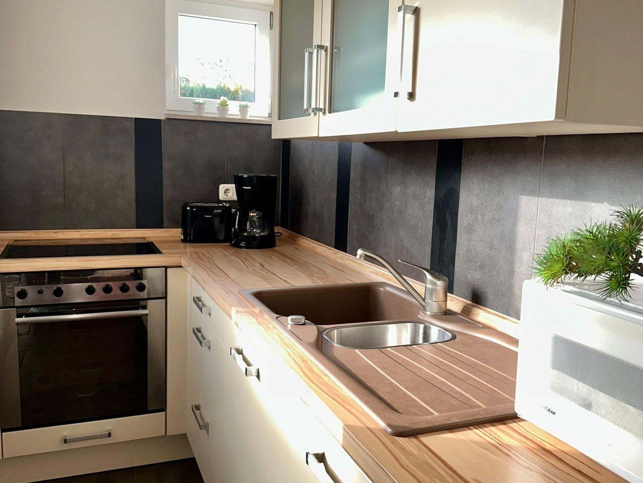 - separate Küche ausgestattet u.a. mit Geschirrspüler, Backofen, Ceranfeld, Kaffeemaschine, Geschirr, Besteck, Gläser, Kühlschrank, Mikrowelle ua.