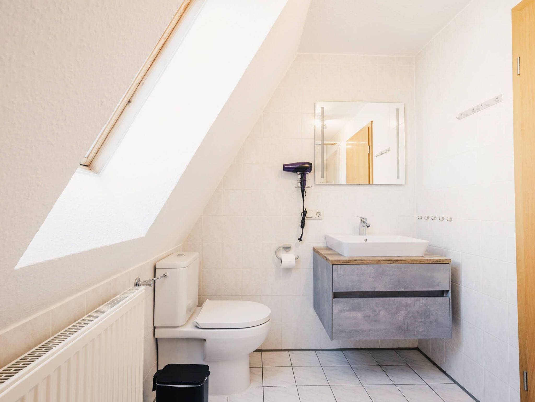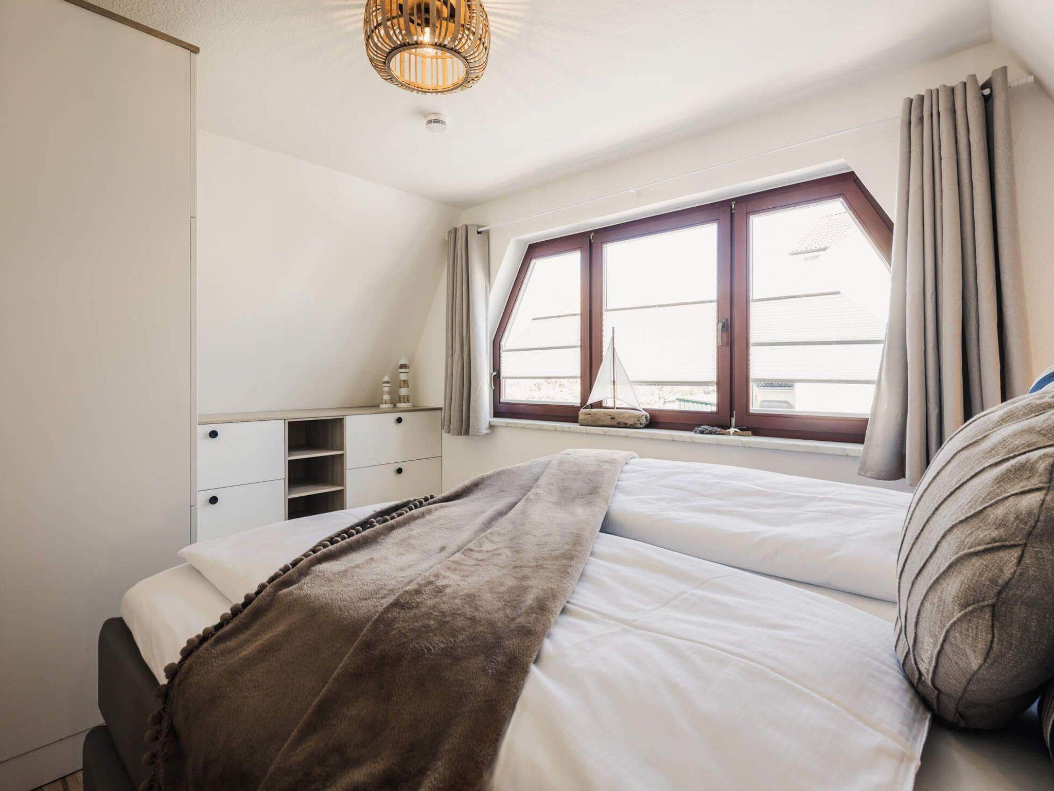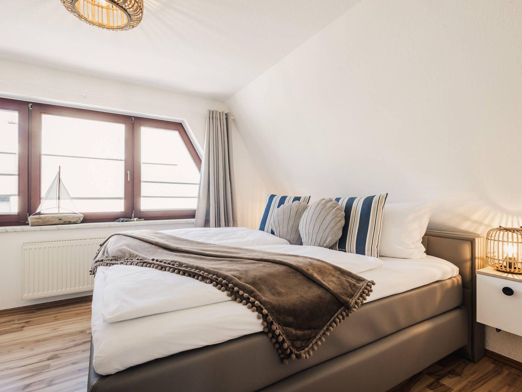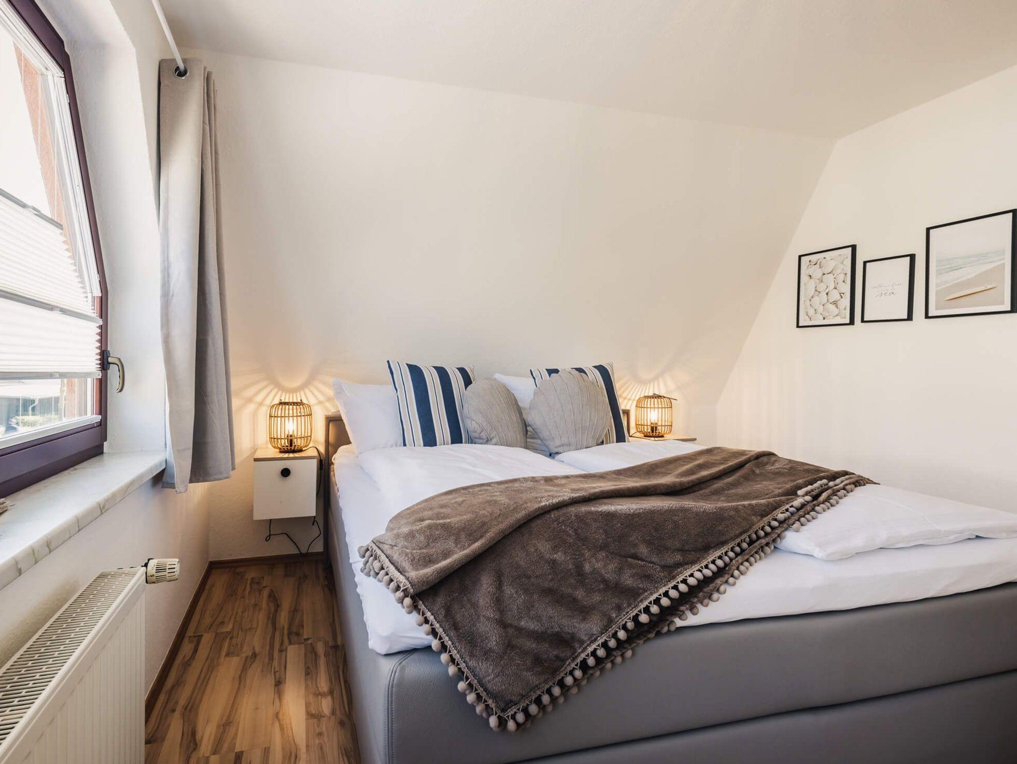Ebenfalls im Obergeschoss befindet sich das Schlafzimmer mit einem hochwertigen Boxspringbett und einem Bad mit Fenster.