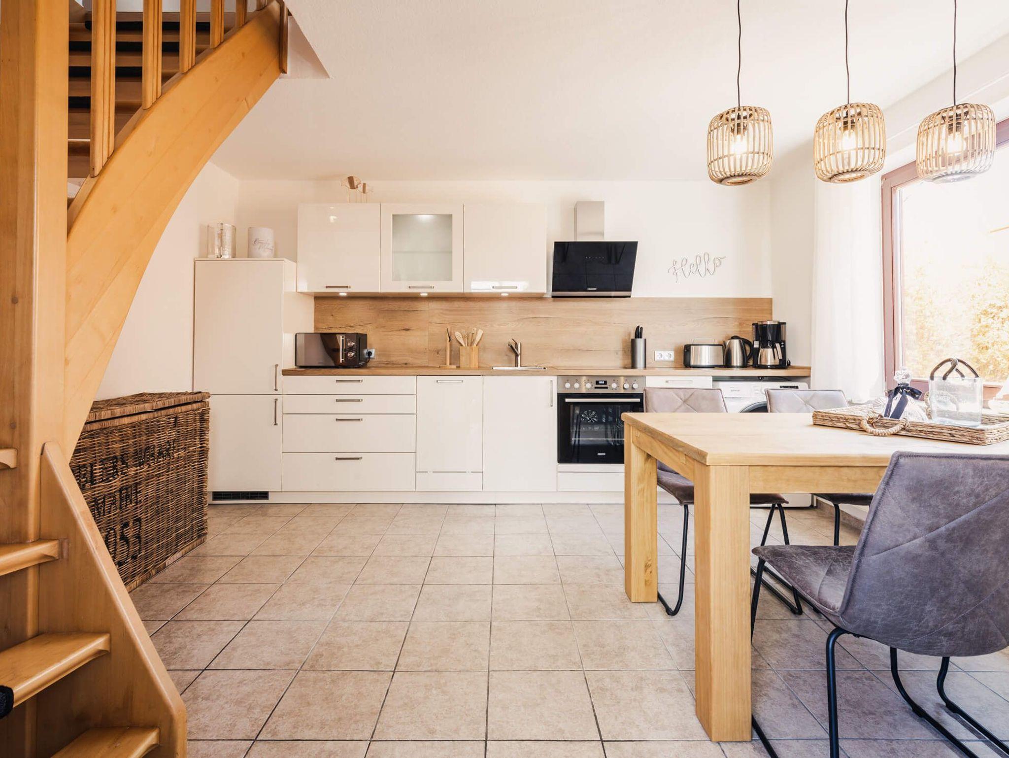 Aus der neu eingebauten Wohnküche im Erdgeschoss gelangt man über eine offene Treppe in die zum Verbleiben animierende Wohngalerie.