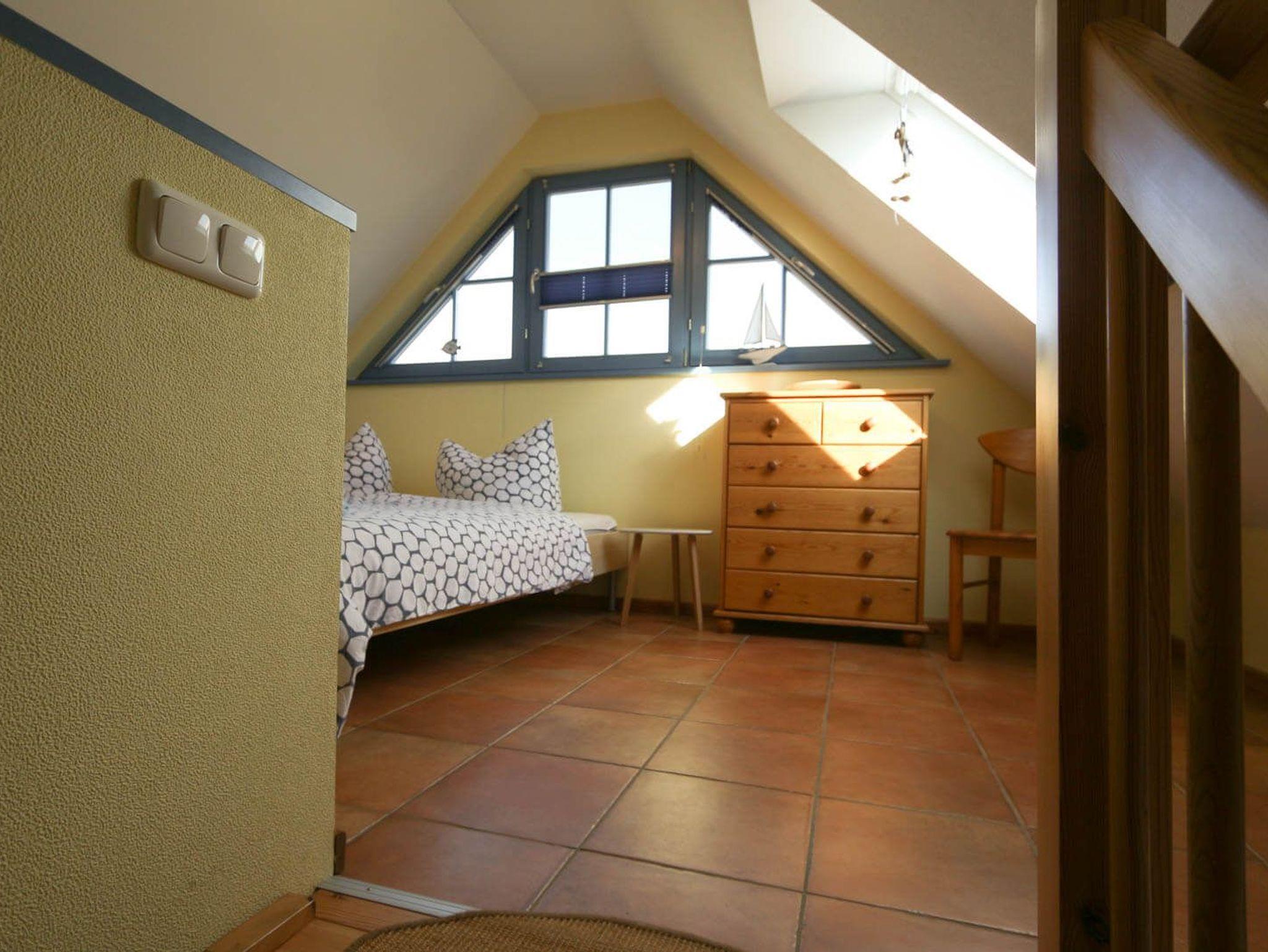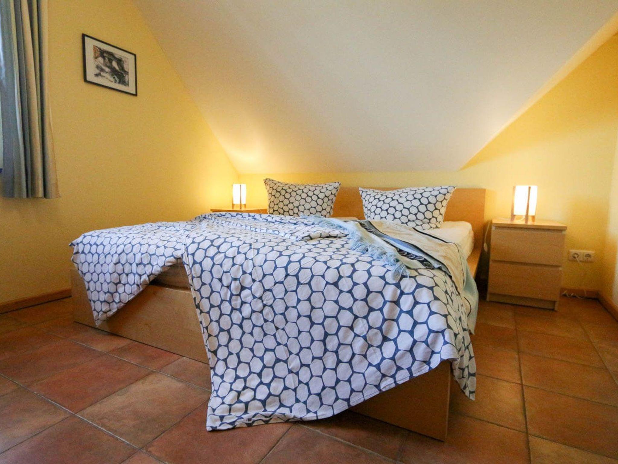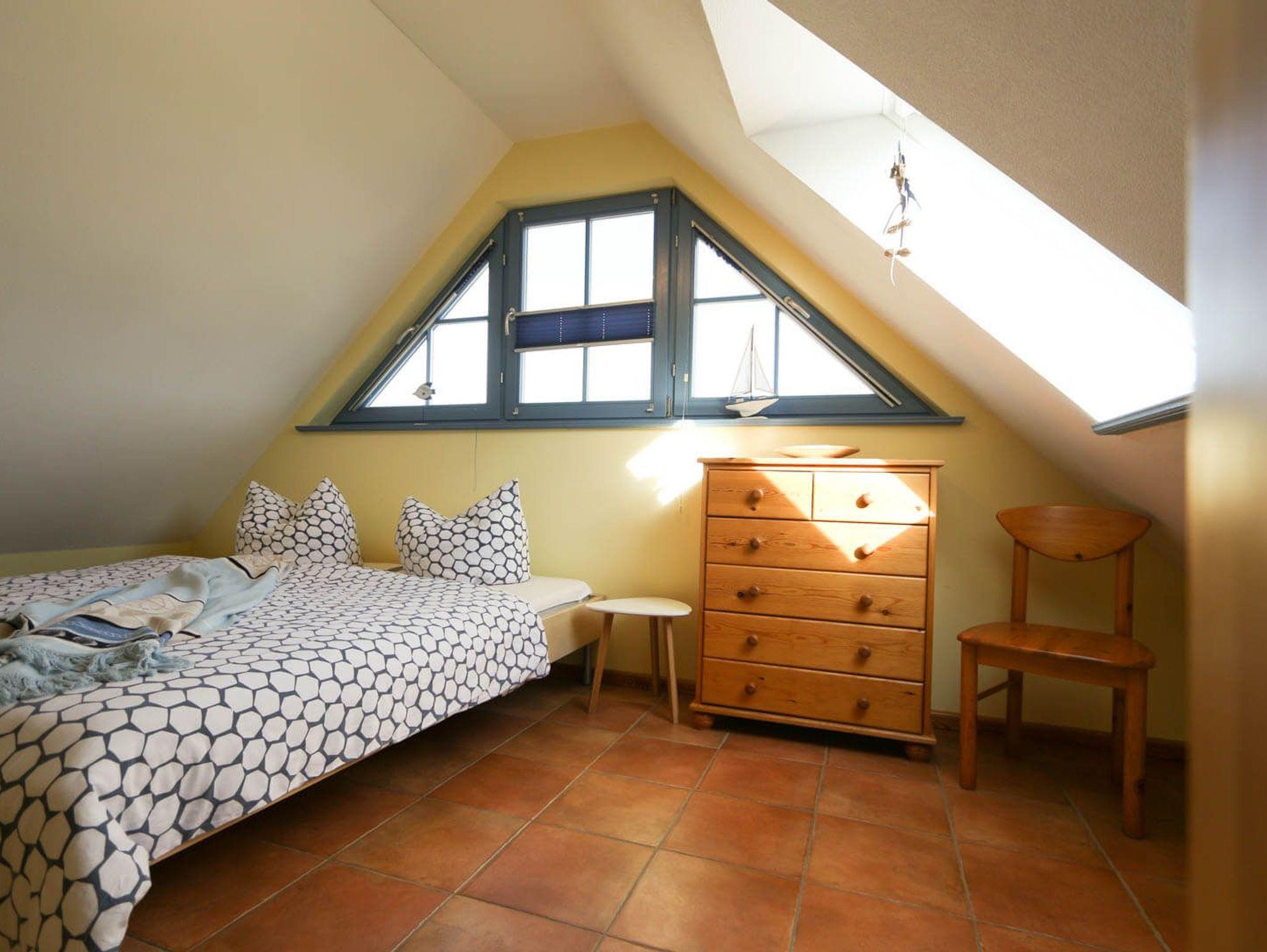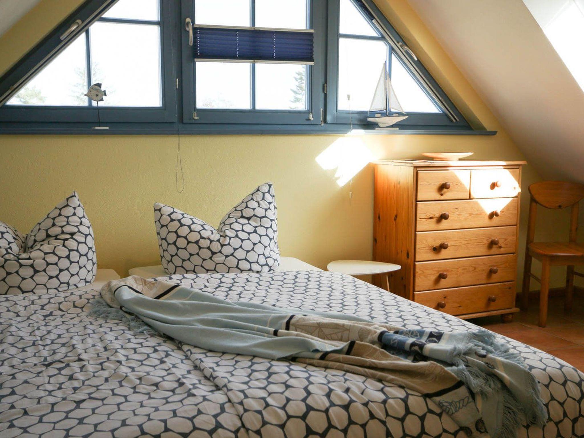 Genießen Sie den Blick auf den Barther Bodden vom Balkon aus. In der Kranichsaison können Sie den atemberaubenden Vogelzug hautnah erleben. Die Wohnung ist auf zwei Etagen verteilt, verfügt über zwei Schlafzimmer im ersten Geschoss und eine halboffene Galerie mit weiteren Schlafmöglichkeiten. Im geräumigen Wohn-/Essbereich können Sie gemeinsam entspannen und den Urlaub genießen.