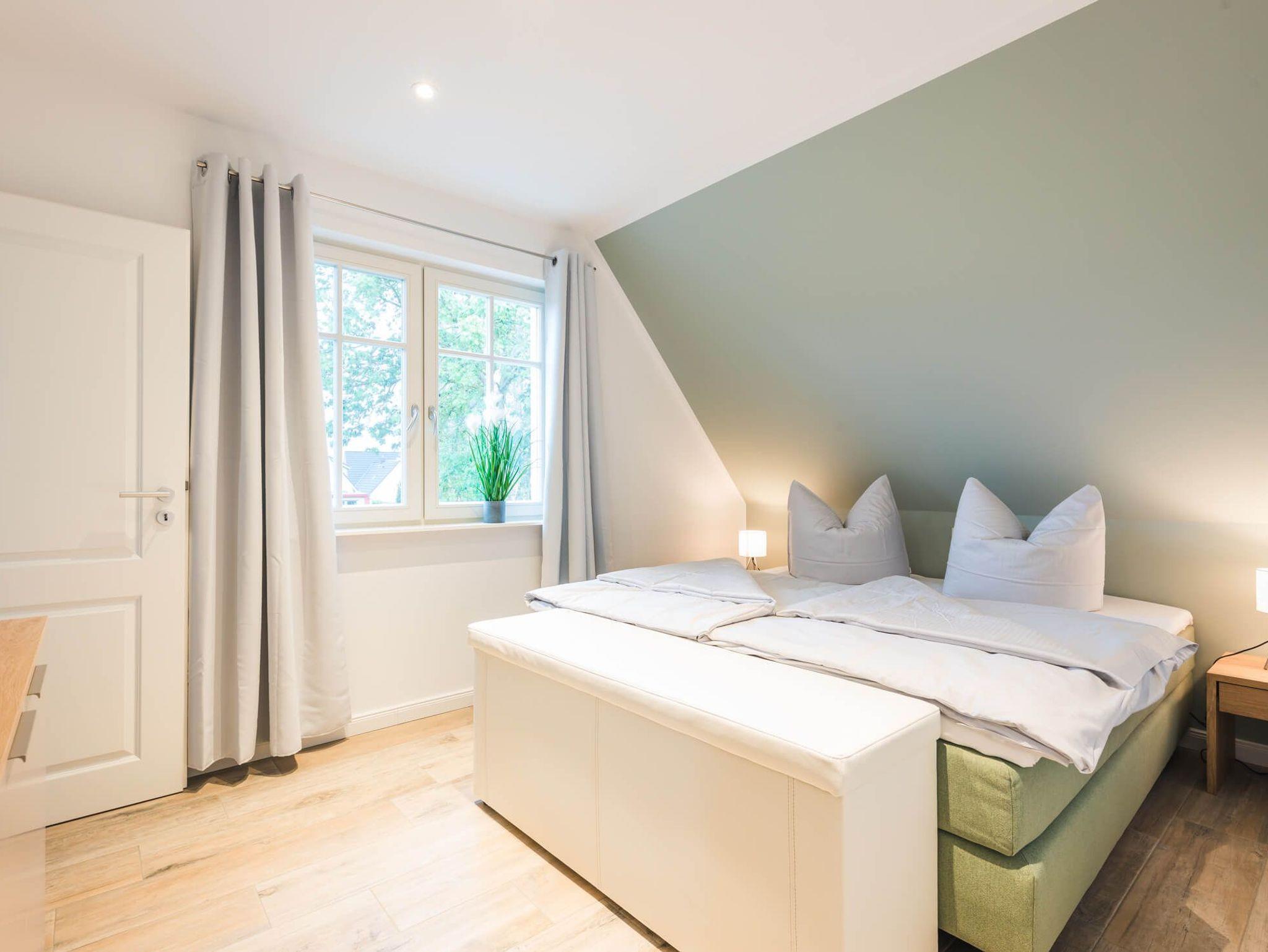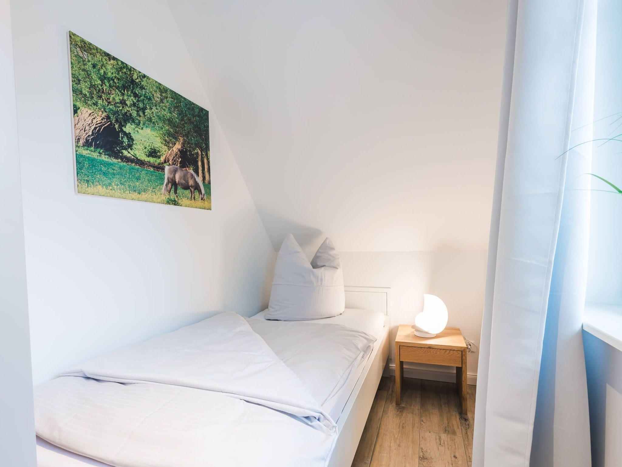 Im Obergeschoss des Ferienhauses befinden sich zwei Schlafzimmer für je zwei Personen. Eines der Hauptschlafzimmer hat Zugang zu einem separaten kleinen Zimmer mit einem Einzelbett. Die Doppel-Schlafzimmer sind mit hochwertigen Boxspringbetten sowie mit einem Flatscreen TV ausgestattet. Der ausgebaute Spitzboden verfügt über zwei weitere Einzelbetten.