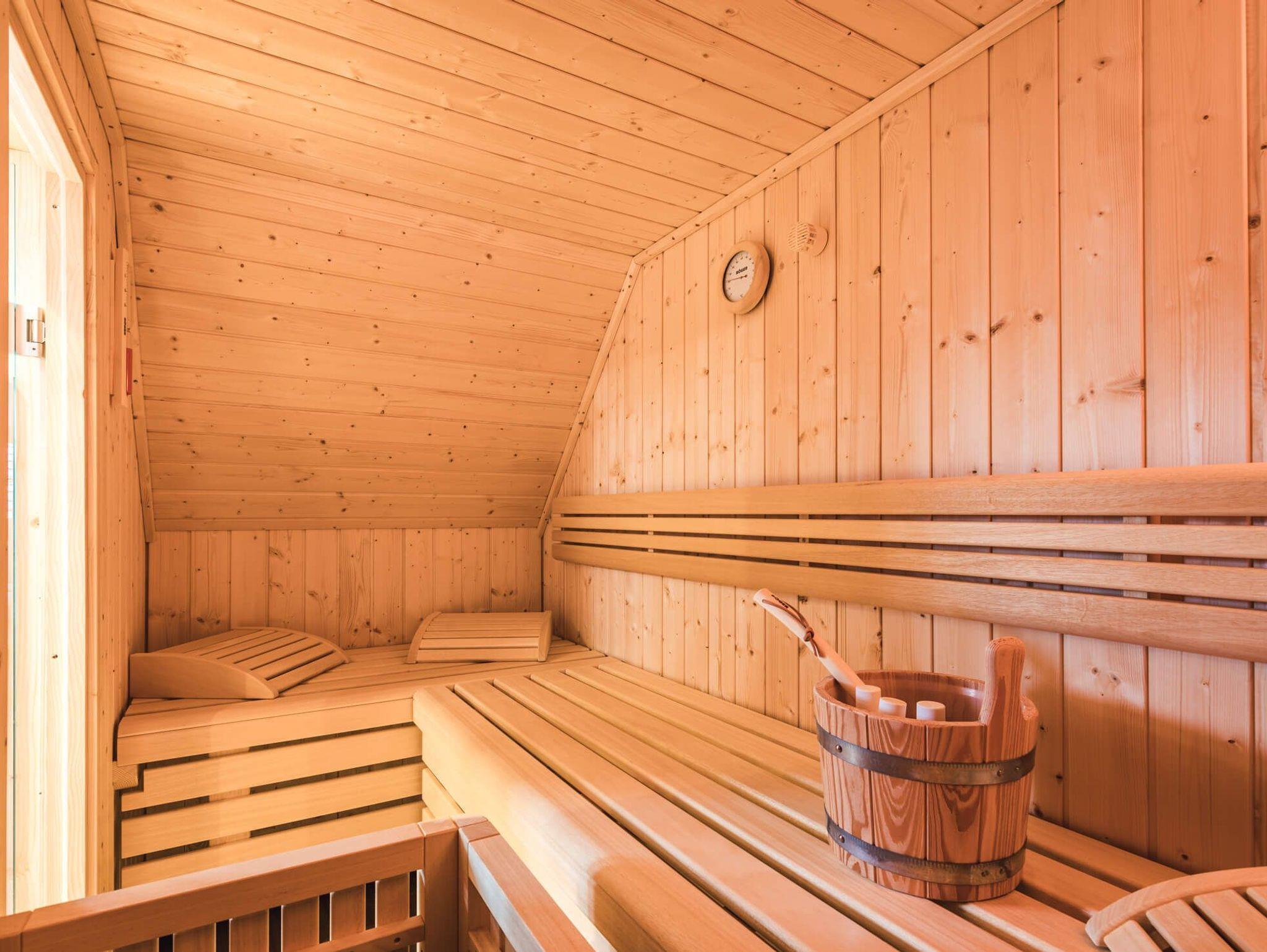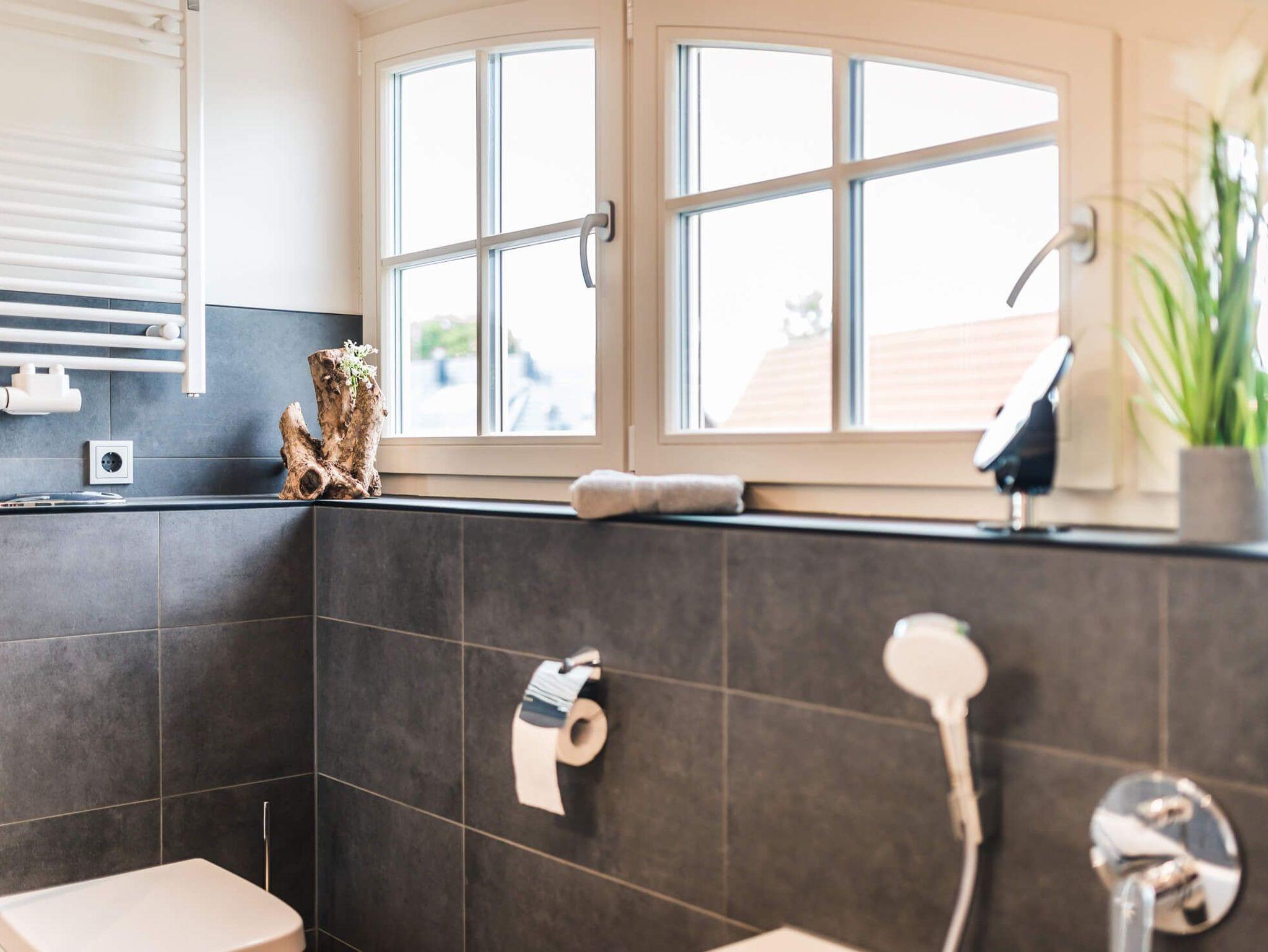 Auf der zweiten Ebene befindet sich das Badezimmer mit bodengleicher Dusche sowie einer Badewanne und finnischer Sauna.