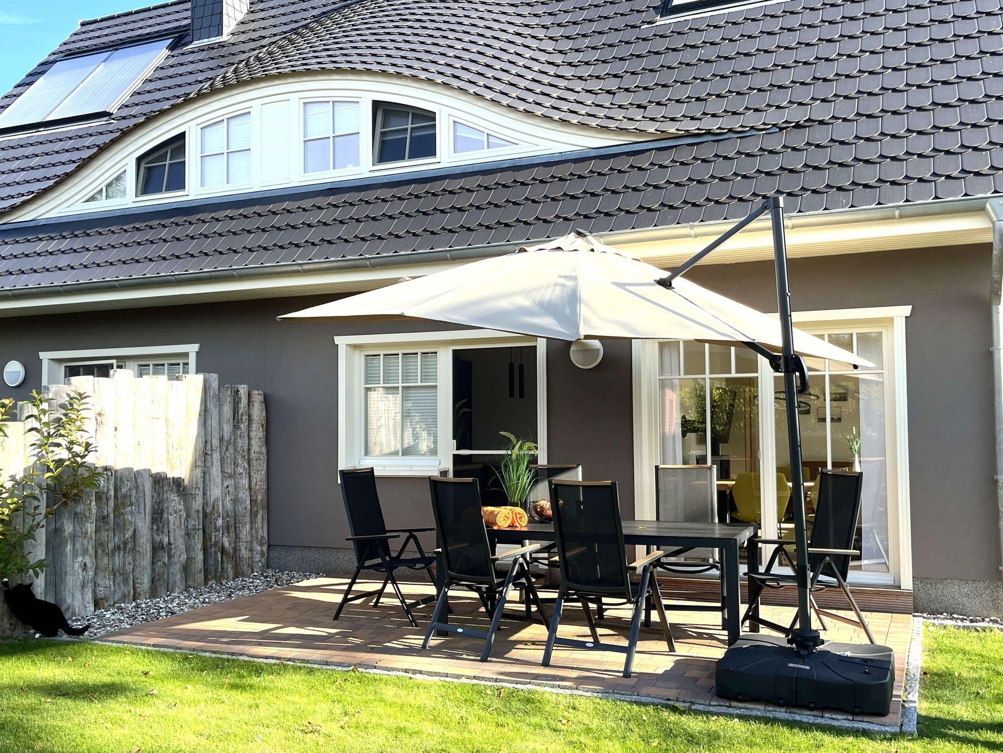 Die Terrasse mit angrenzenden begrüntem Gartenanteil verspricht entspannte Stunden an frischer Luft. Als Sichtschutz wurden original Buhnen verbaut, die bis vor kurzem noch in der Ostsee standen.