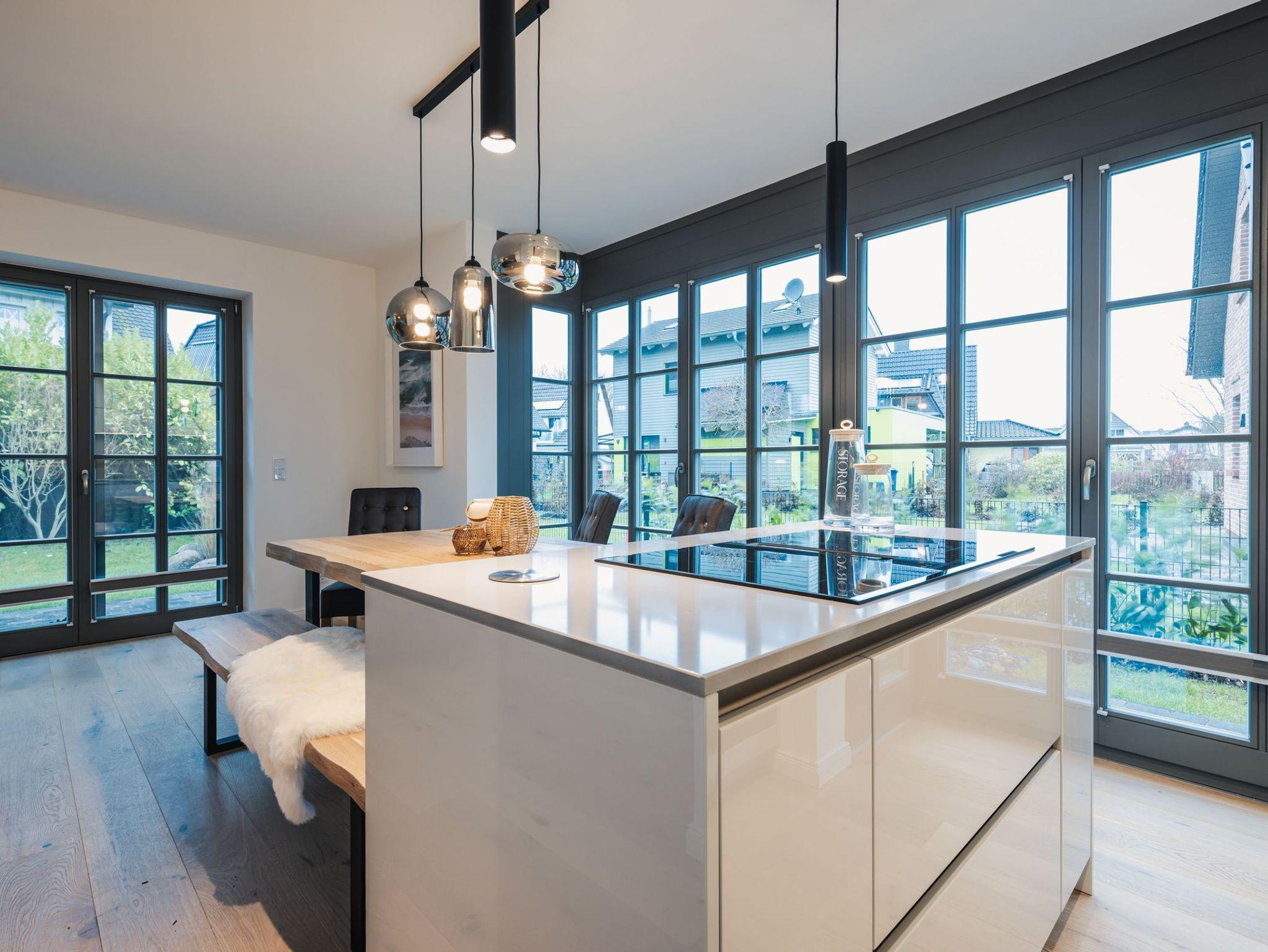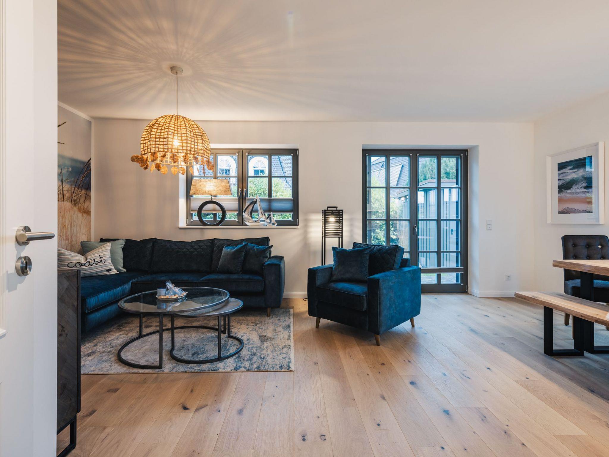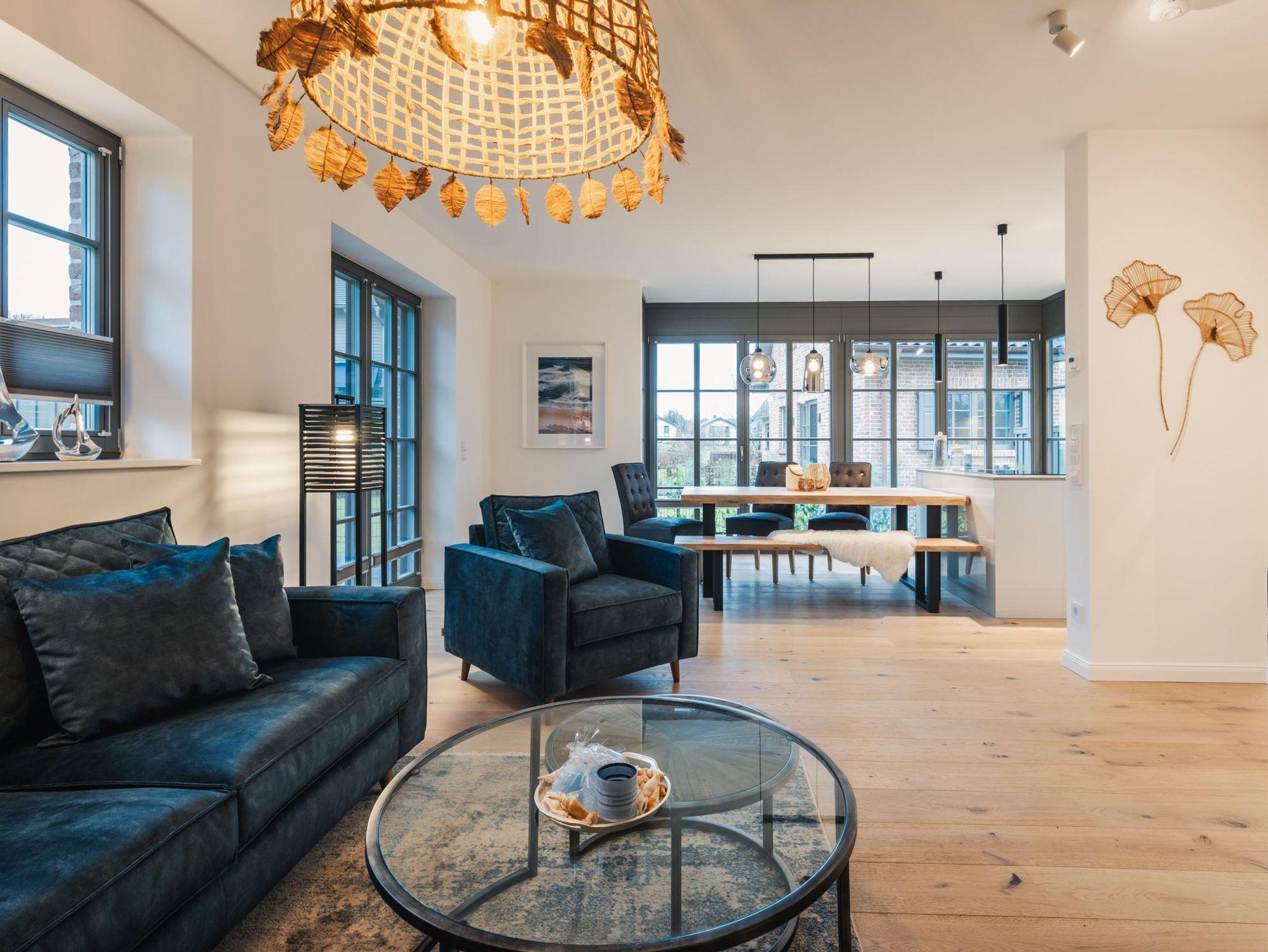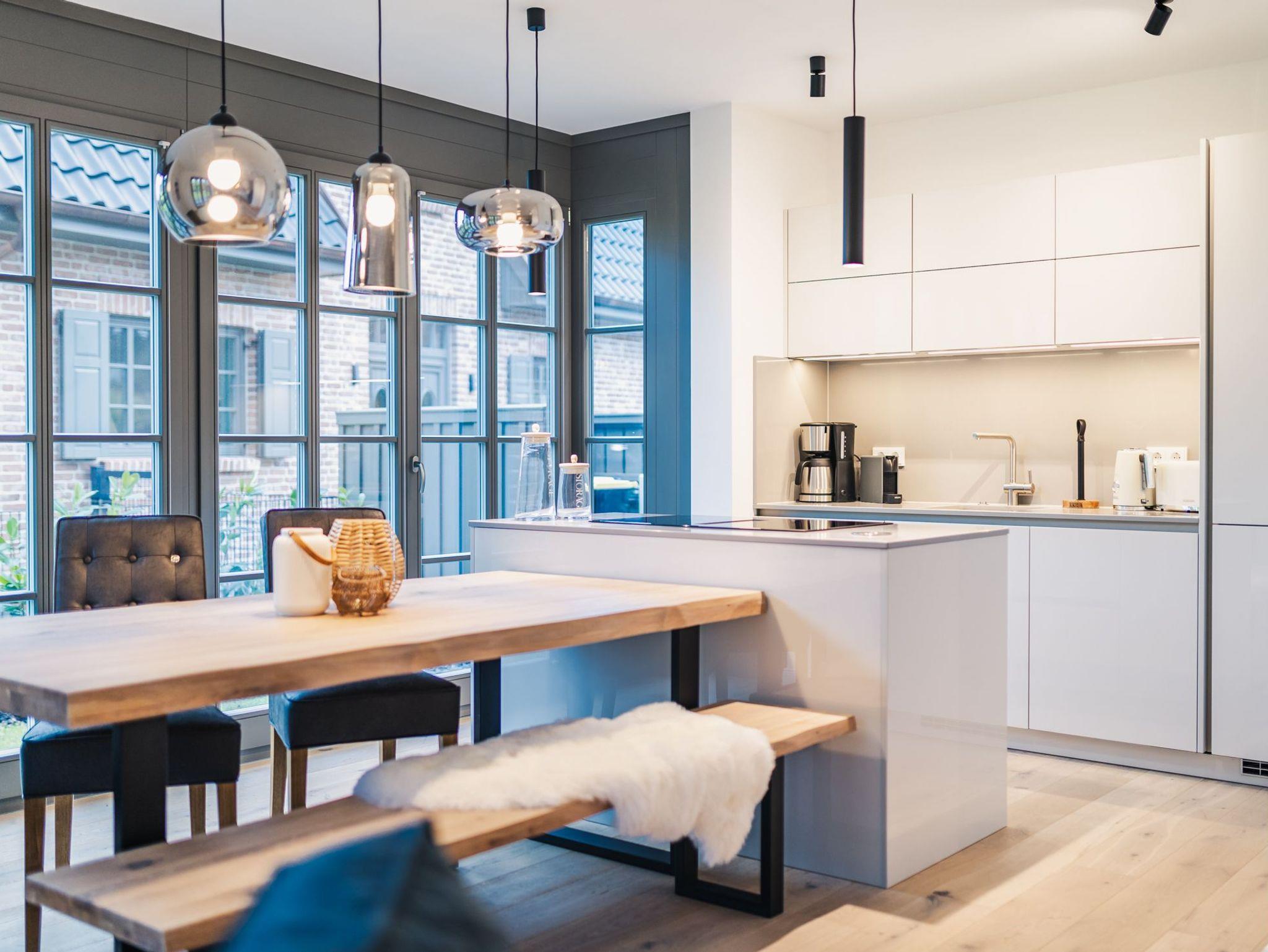 Das Ferienhaus ist gemütlich und komfortabel eingerichtet, um Ihren Aufenthalt so angenehm wie möglich zu gestalten. Der offene Wohnbereich verfügt über eine einladende Sofalandschaft, einen Esstisch und große Fenster, die viel Tageslicht hereinlassen. Die Küche ist mit einer Kochinsel versehen und bietet somit gesellige Kochabende mit Blick ins Grüne. Selbstverständlich ist die Küche mit modernen Markengeräten wie einem Geschirrspüler, Backofen und einer Kaffee Kapselmaschine ausgestattet.