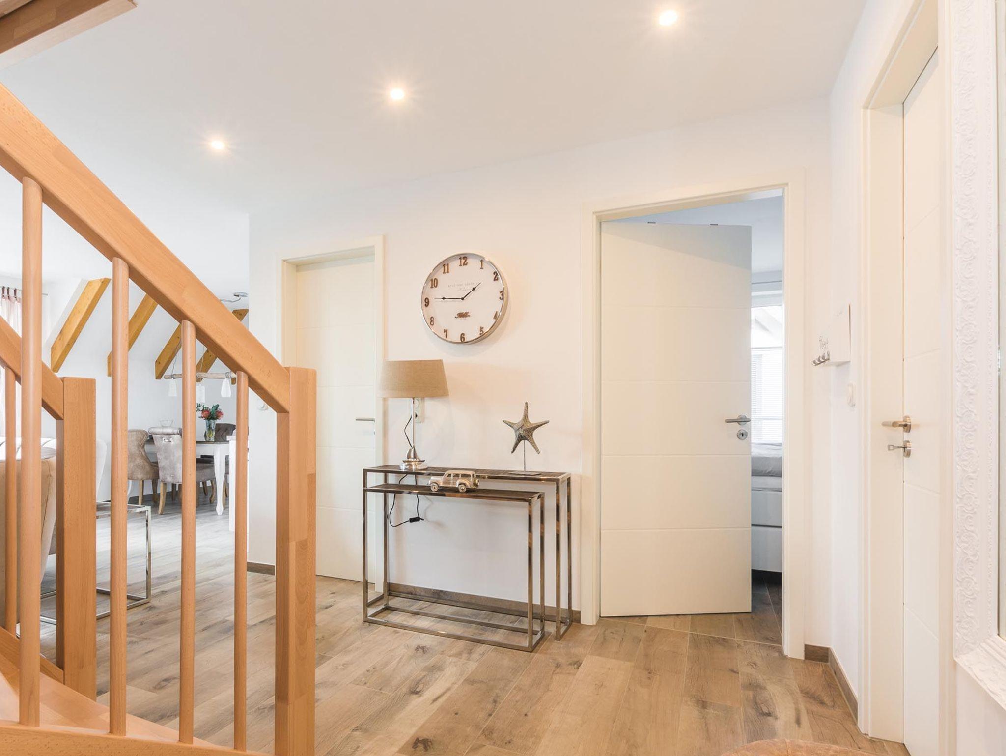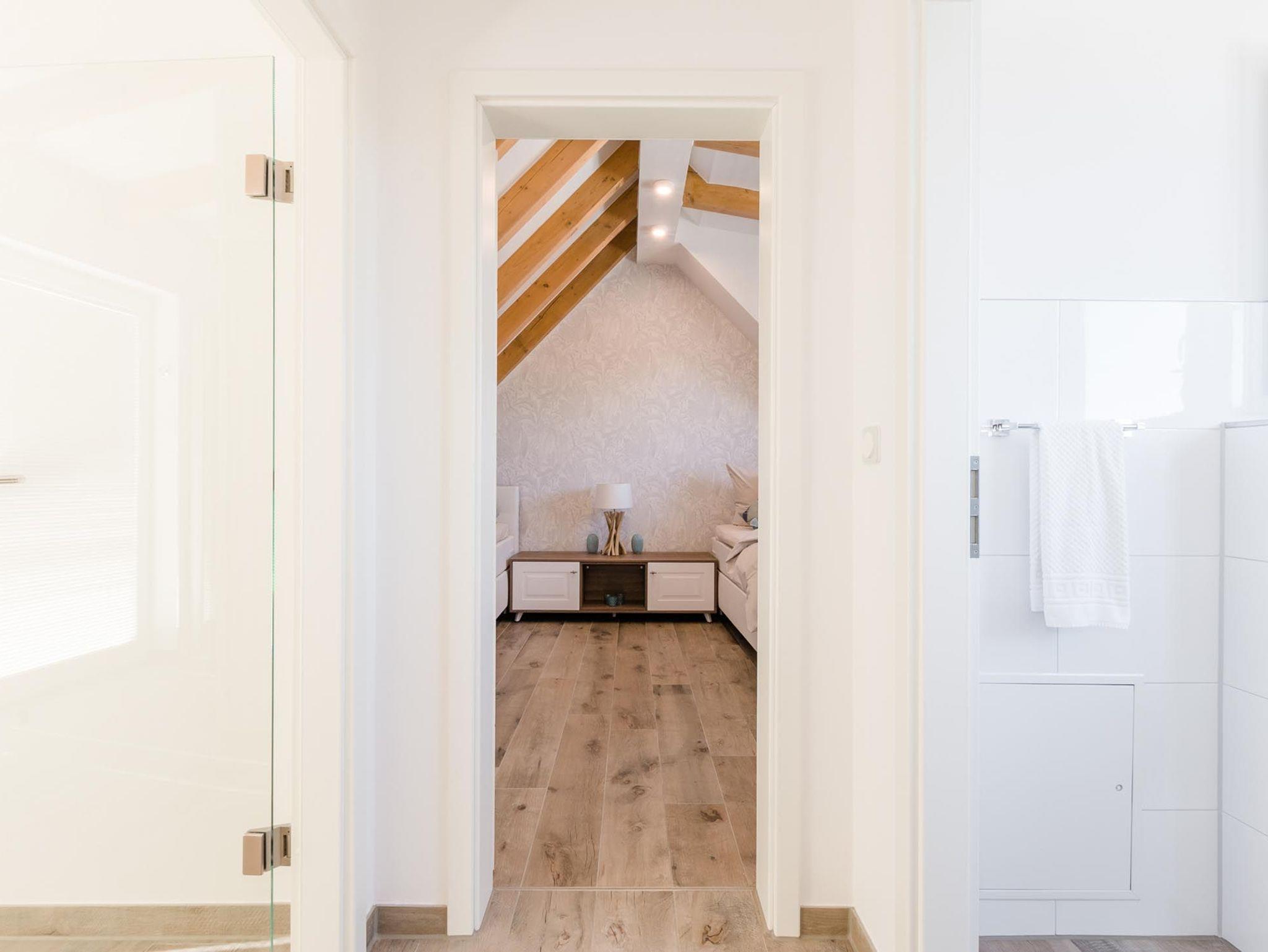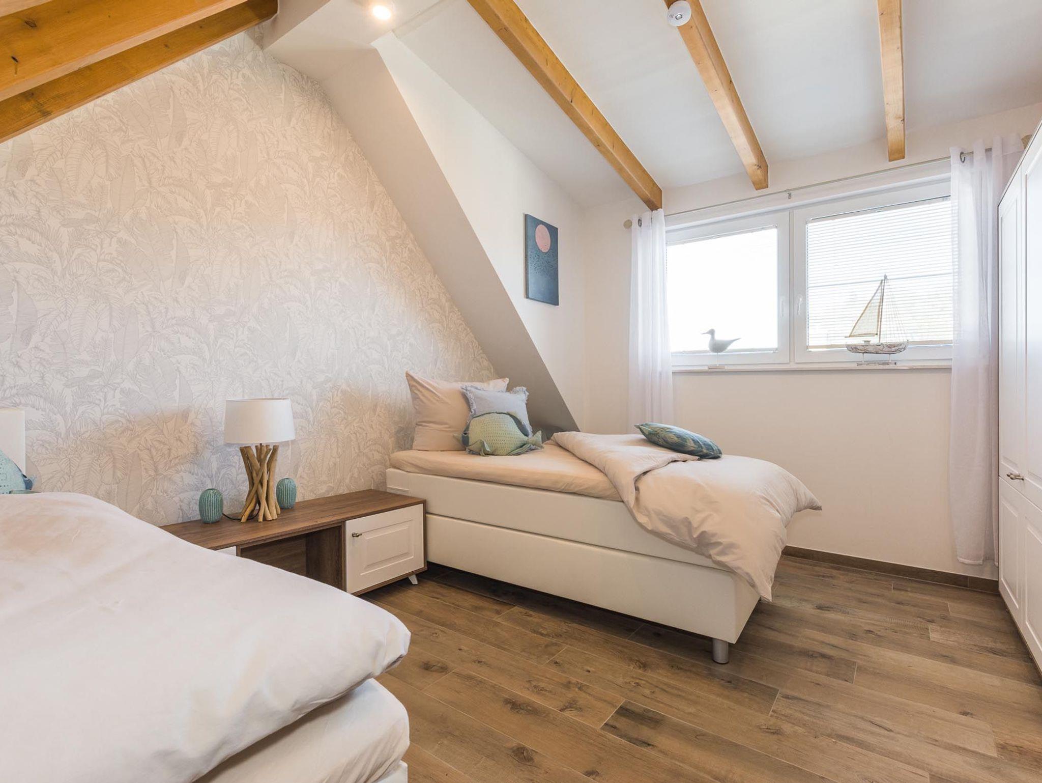 Der offene Wohn-Essbereich ist geräumig und mit hochwertigen Möbeln ausgestattet. Die Küche lässt keine Wünsche offen - Backofen, Mikrowelle, Geschirrspüler u.v.m. Einen gemütlichen TV-Abend genießen Sie auf der modernen Sitzgarnitur. Auf dem nach Süd-West aufgerichteten Balkon genießen Sie die Abendsonne und lassen den Tag ausklingen. Das Schlafzimmer ist mit einem hochwertigen Boxspringbett ausgestattet. In das Dachgeschoss gelangen Sie über eine offene Holztreppe. Hier erwartet Sie ein weiteres Highlight: eine Sauna mit Ruheraum, Dusche und direktem Zugang zur 2. Terrasse. Ebenso auf der Etage ist das 2. Schlafzimmer mit 2 Einzelbetten (Boxspringbetten) und Flatscreen-TV sowie das 2. Bad mit WC.