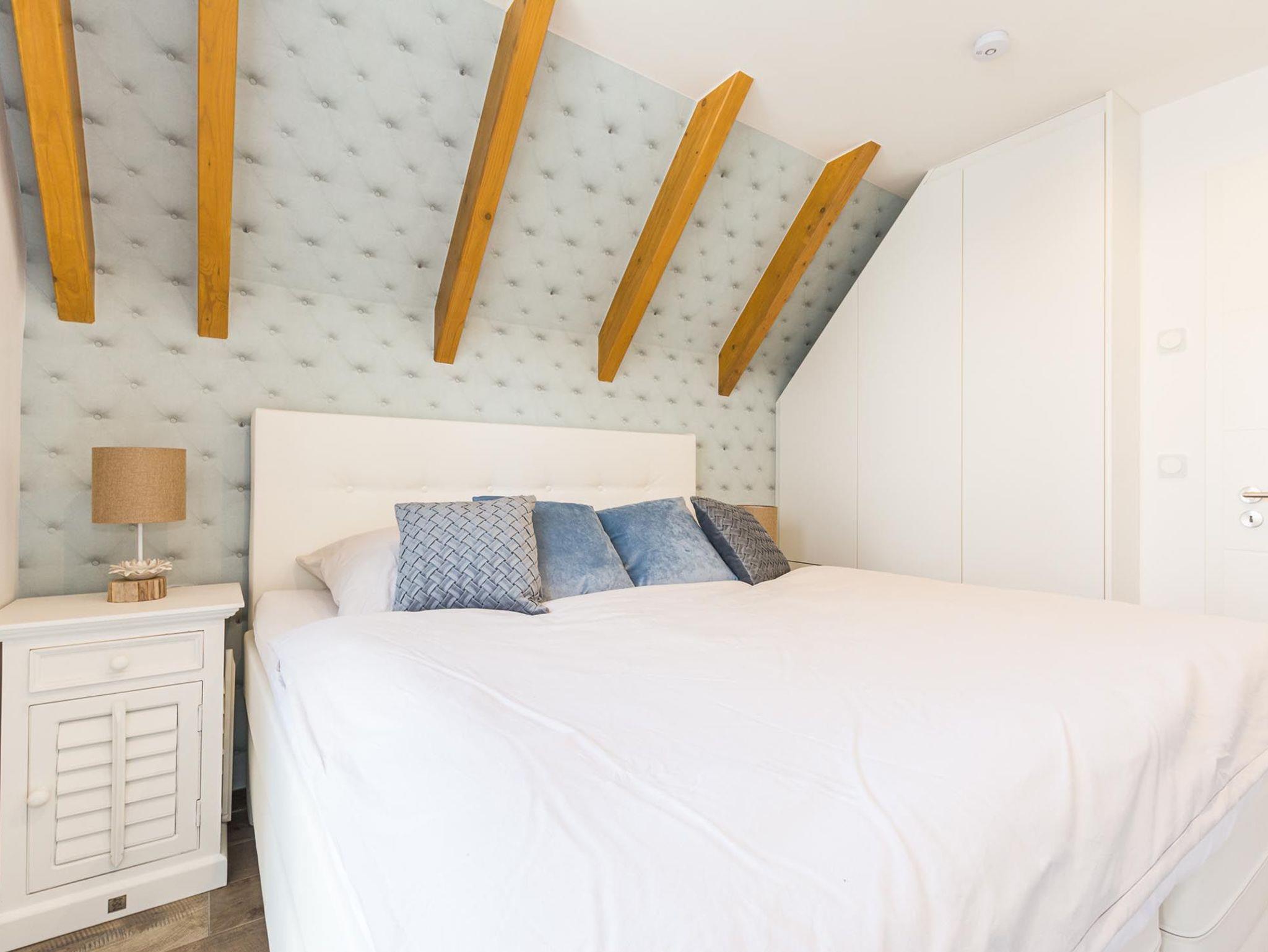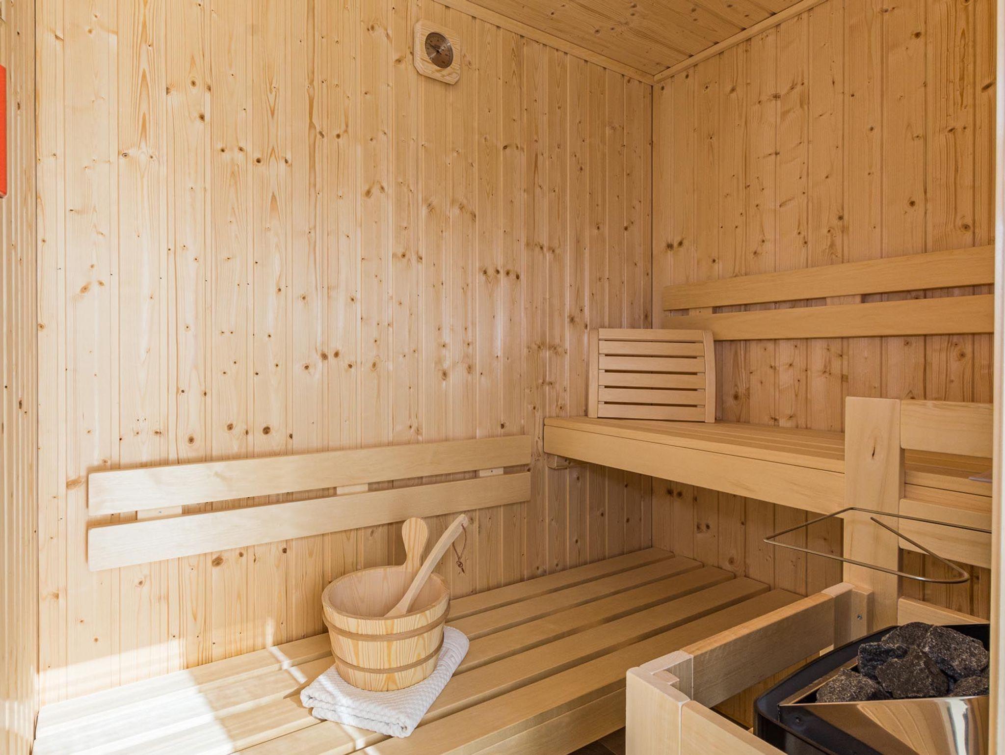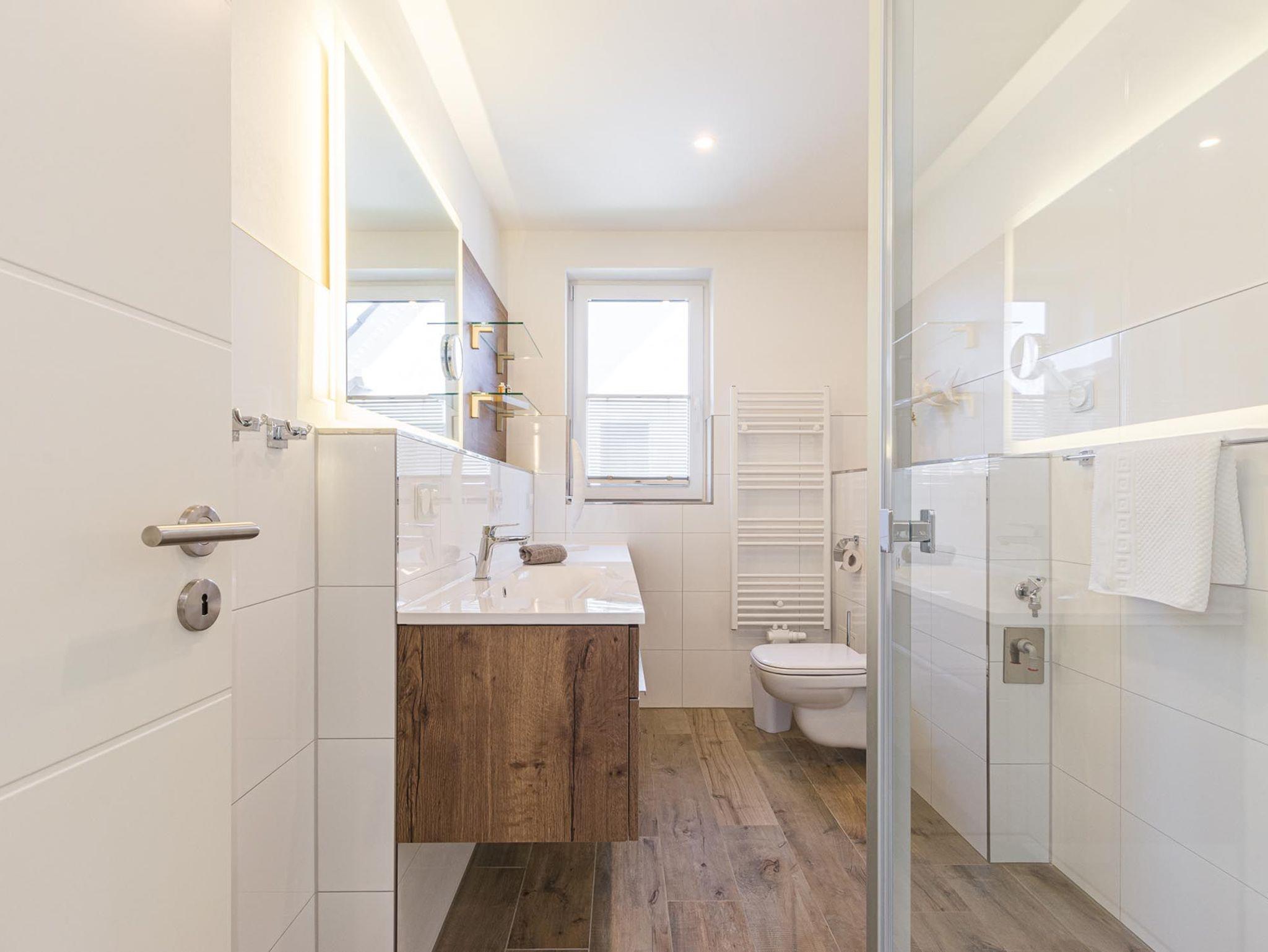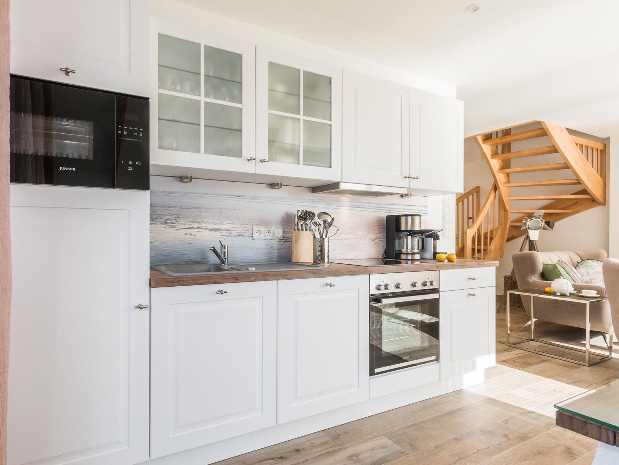 Der offene Wohn-Essbereich ist geräumig und mit hochwertigen Möbeln ausgestattet. Die Küche lässt keine Wünsche offen - Backofen, Mikrowelle, Geschirrspüler u.v.m. Einen gemütlichen TV-Abend genießen Sie auf der modernen Sitzgarnitur. Auf dem nach Süd-West aufgerichteten Balkon genießen Sie die Abendsonne und lassen den Tag ausklingen. Das Schlafzimmer ist mit einem hochwertigen Boxspringbett ausgestattet. In das Dachgeschoss gelangen Sie über eine offene Holztreppe. Hier erwartet Sie ein weiteres Highlight: eine Sauna mit Ruheraum, Dusche und direktem Zugang zur 2. Terrasse. Ebenso auf der Etage ist das 2. Schlafzimmer mit 2 Einzelbetten (Boxspringbetten) und Flatscreen-TV sowie das 2. Bad mit WC.