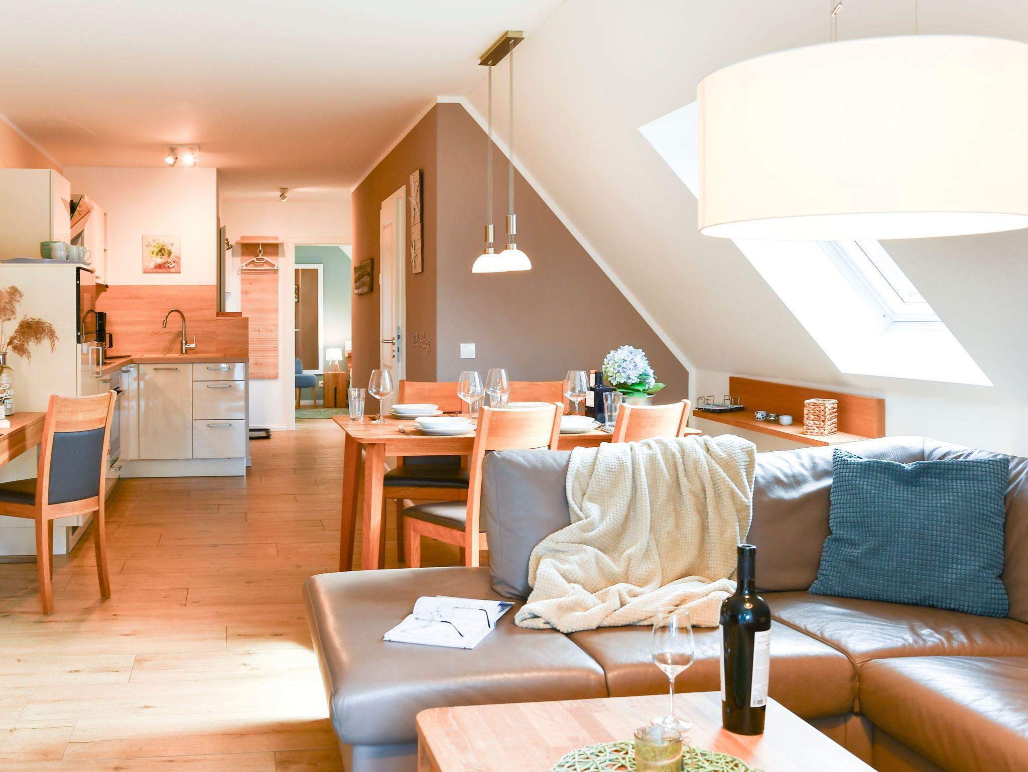 Die Ferienwohnung Wellenklang empfängt Sie mit einer modernen und einladenden Atmosphäre. Der offene Wohn- und Essbereich mit bequemer Couch bietet den perfekten Ort für entspannte Abende. Die voll ausgestattete Küchenzeile verfügt über moderne Geräte, sodass Sie mühelos kulinarische Köstlichkeiten zubereiten können. Die beiden separaten Schlafzimmer sorgen für erholsamen Schlaf.