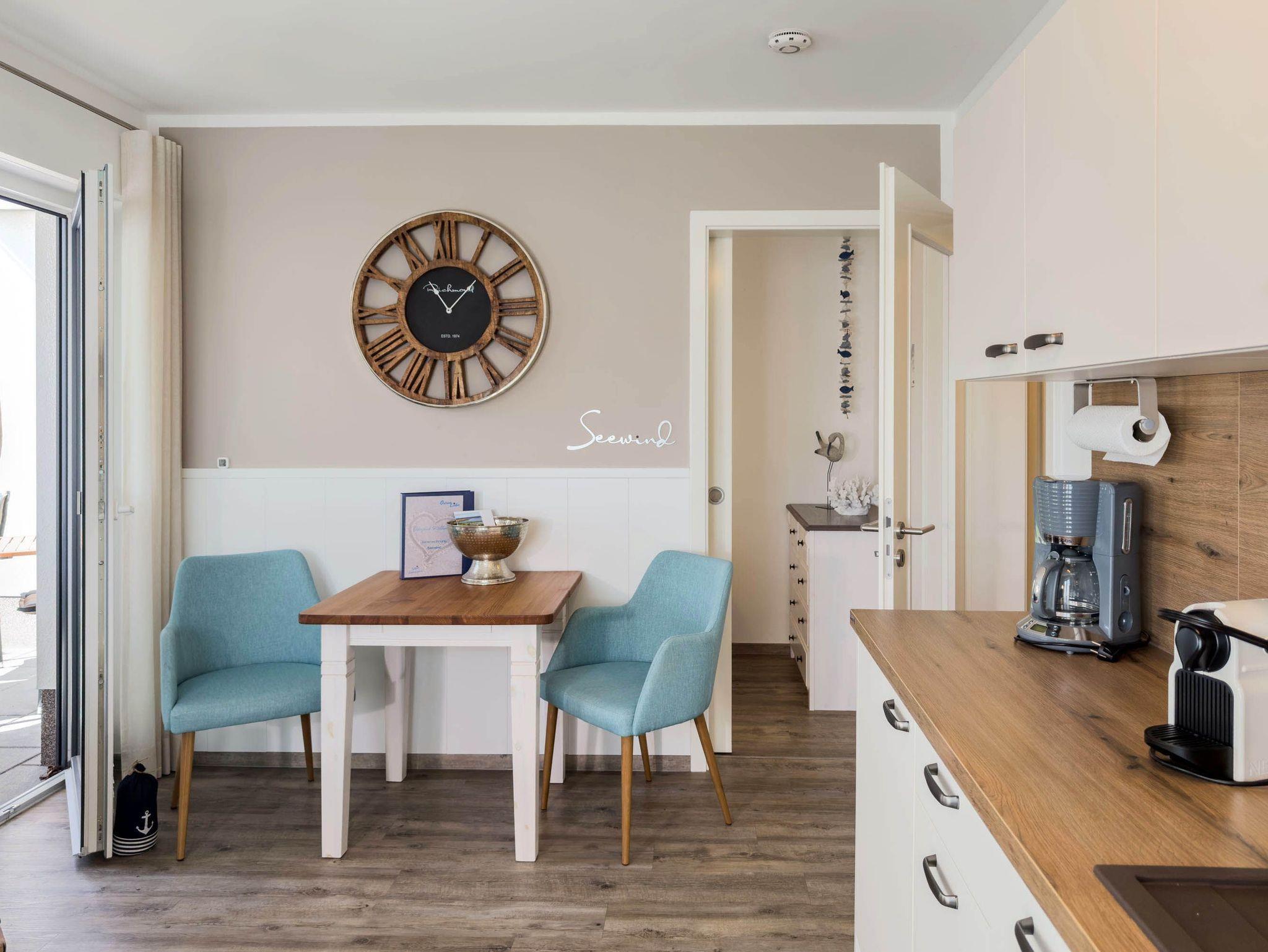 Die Ferienwohnung Seewind empfängt Sie mit einem hellen und freundlichen Ambiente. Der Wohn- und Essbereich ist geschmackvoll eingerichtet und bietet den perfekten Ort für entspannte Abende. Die voll ausgestattete Küche verfügt über moderne Geräte wie Spülmaschine, Backofen, Toaster, Filterkaffeemaschine, Wasserkocher und Nespresso-Maschine, sodass Sie mühelos kulinarische Köstlichkeiten zubereiten können. Die beiden separaten Schlafzimmer sorgen für erholsamen Schlaf.