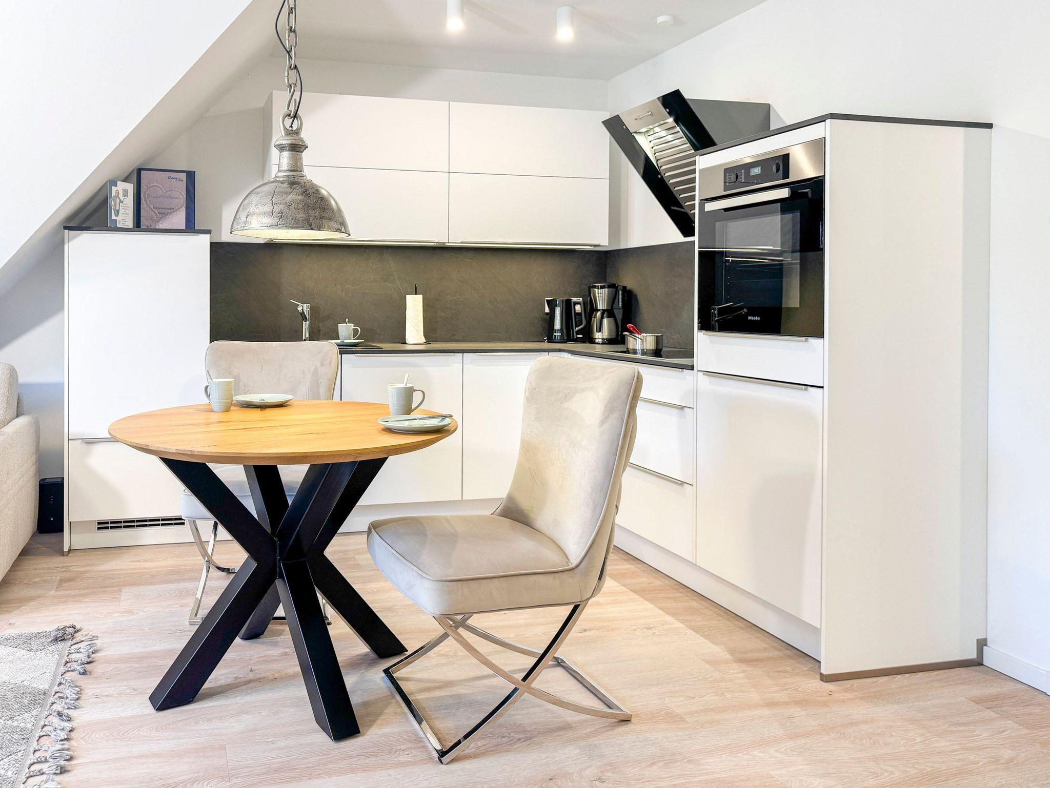 Hoch über den Gärten von Zingst gelegen, empfängt Sie die Ferienwohnung Möwenblick im ersten Obergeschoss der Anlage Düne 7 mit Leichtigkeit, Stil und einem Hauch von Meeresbrise.