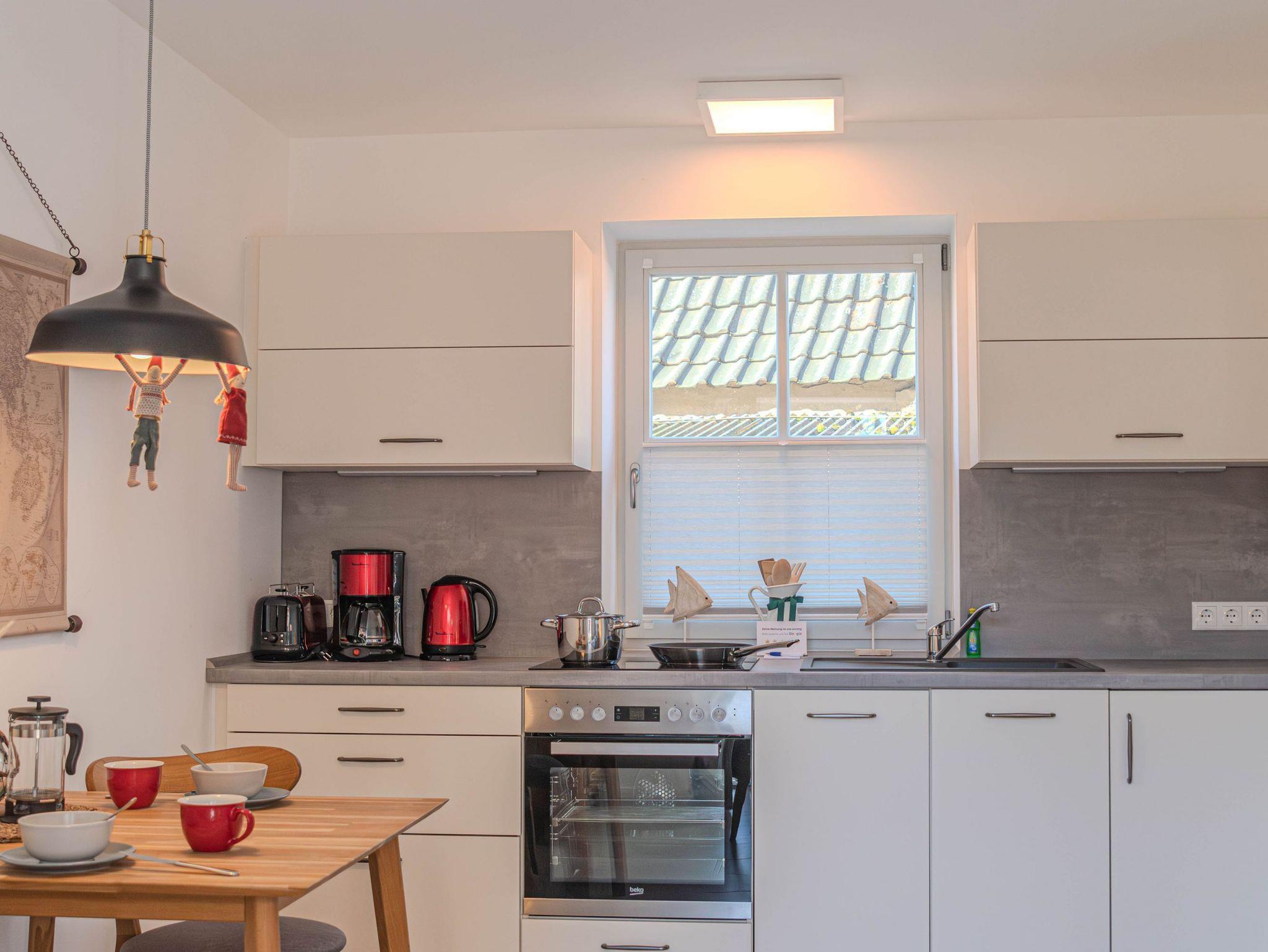 • Voll ausgestattete Küchenzeile: Kochfeld, Backofen, Kühlschrank, Geschirrspüler und Filterkaffeemaschine