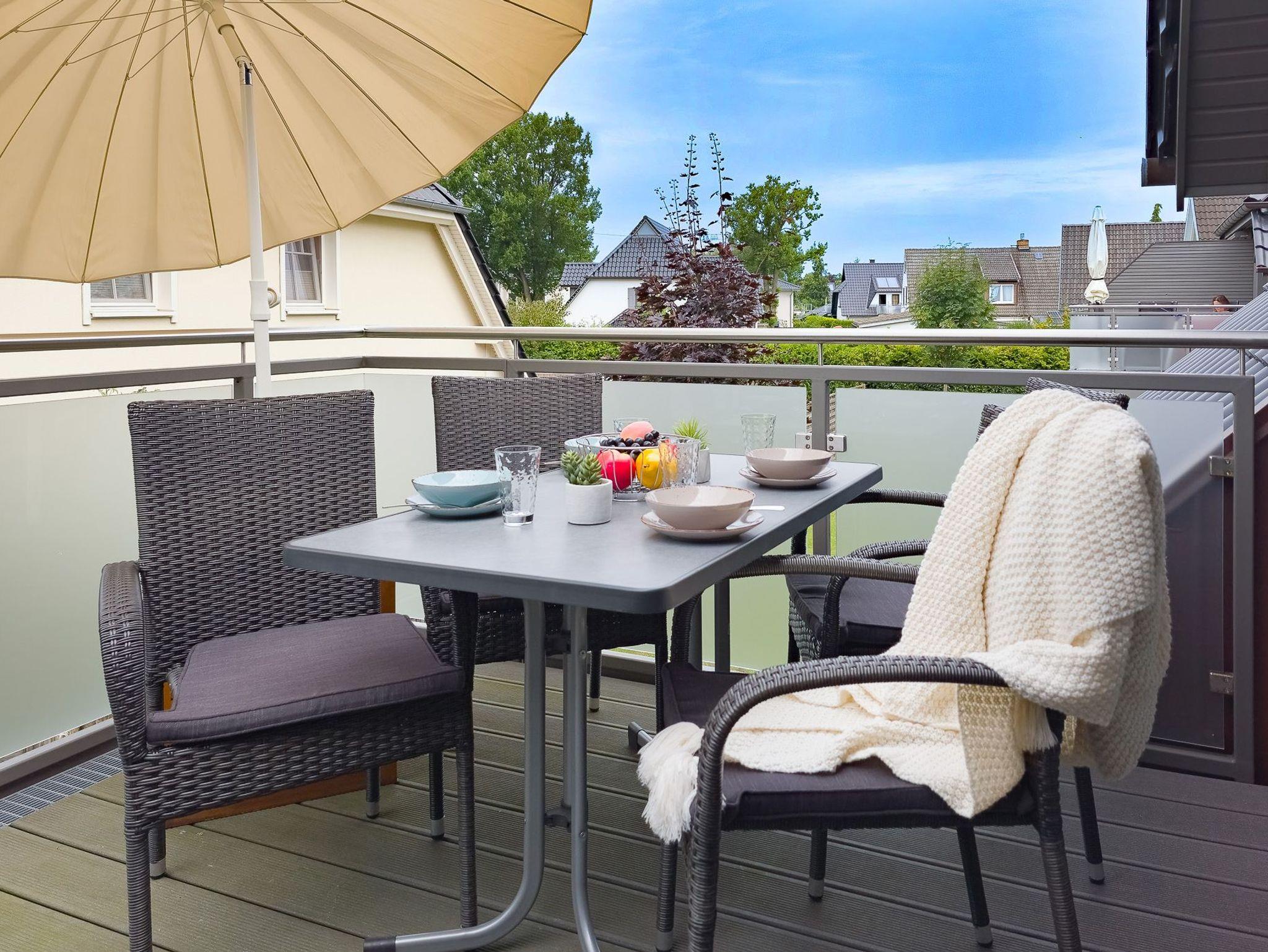 Genießen Sie die frische Ostseeluft auf dem großzügigen Balkon mit Blick ins Grüne. Hier können Sie den Tag mit einem Frühstück im Freien beginnen oder abends bei einem Glas Wein ausklingen lassen.