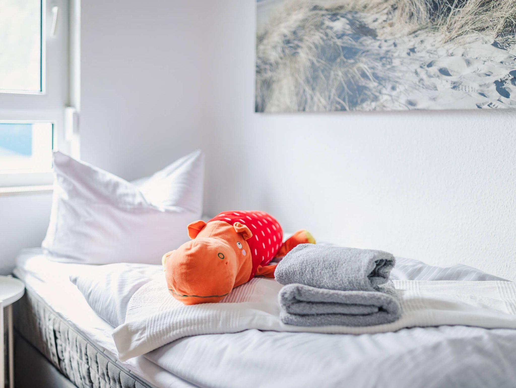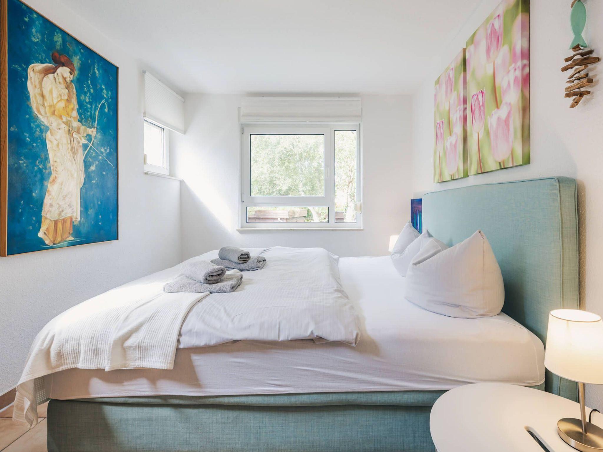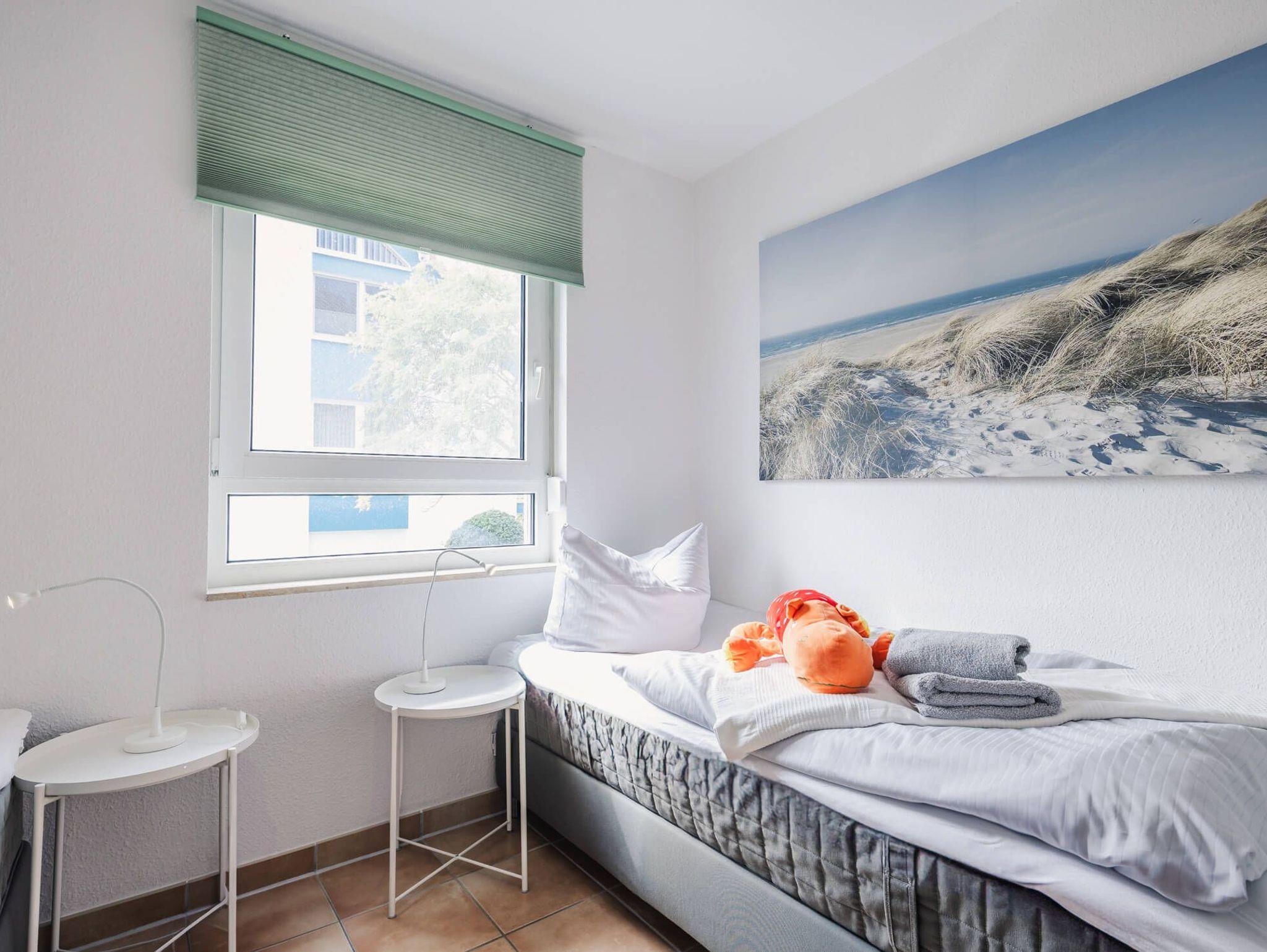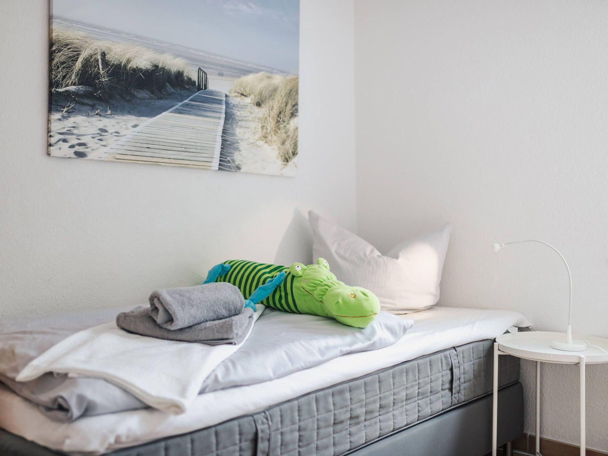 Die Wohnung zeichnet sich durch ihre moderne und gemütliche Einrichtung aus. Die Schlafzimmer sind geschmackvoll eingerichtet und bieten ausreichend Platz für eine kleine Familie oder eine Gruppe von Freunden. Die Betten sind komfortabel und laden zu erholsamen Nächten ein. Das Bad verfügt über eine ebenerdige Dusche.