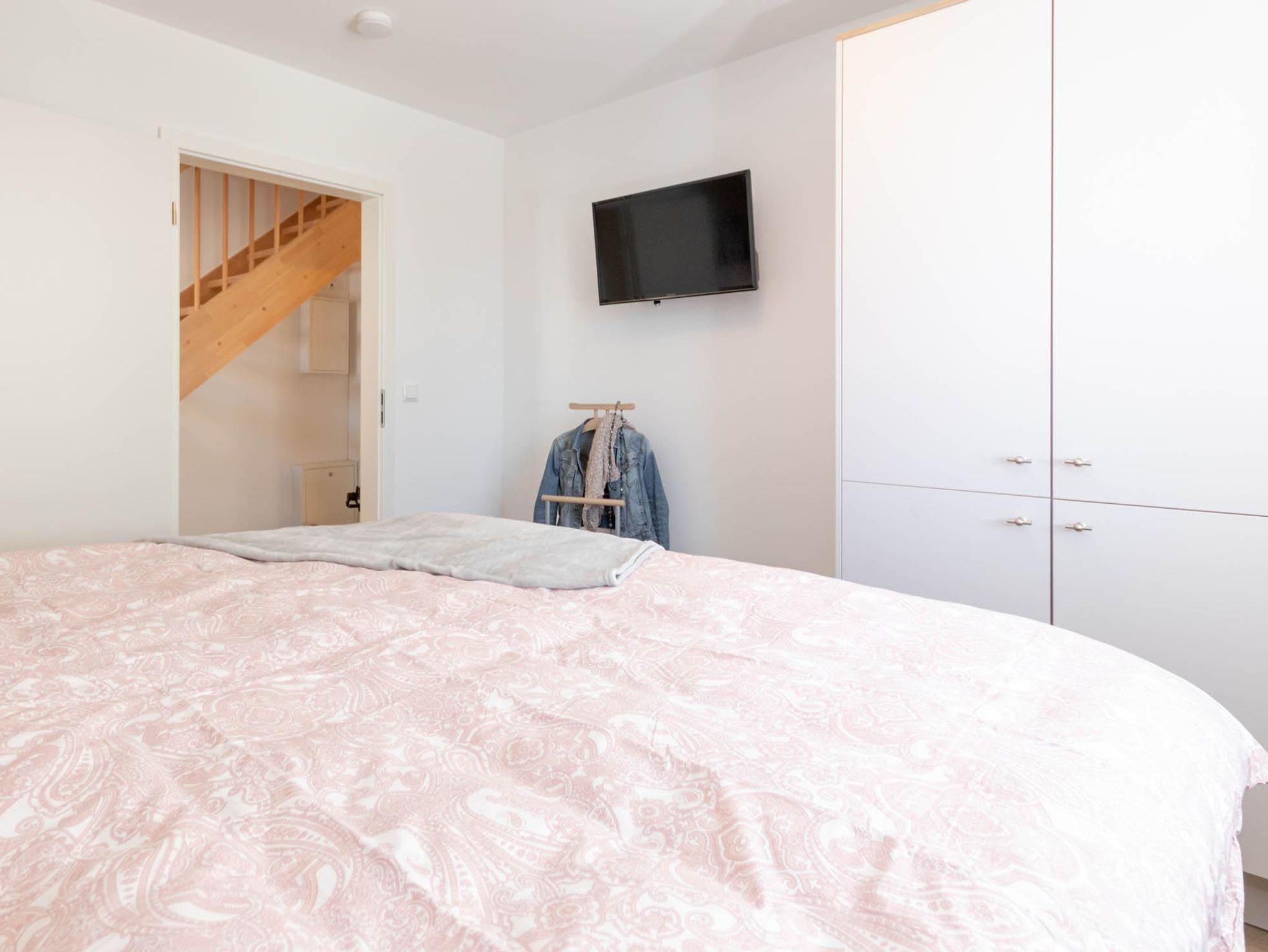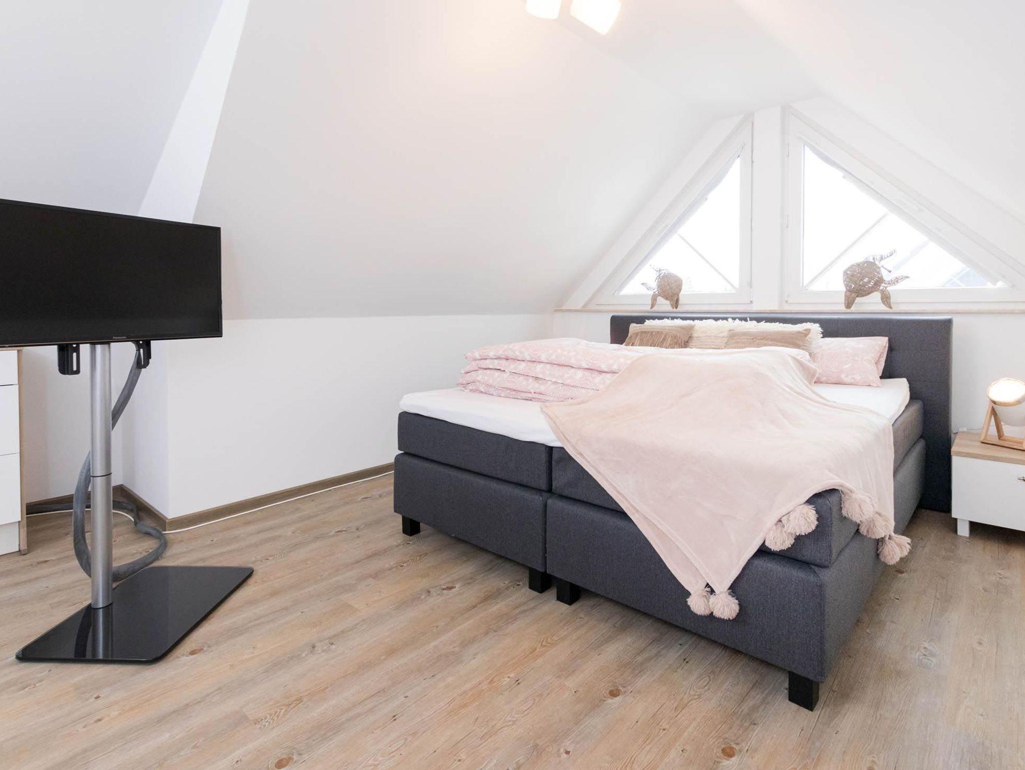 Ein Schlafzimmer sich in der ersten Etage, das zweite ist im Dachgeschoss. Beide sind mit 180x200 Boxspringbetten ausgestattet, erholsamer Schlaf ist garantiert. Das obere Schlafzimmer erreichen Sie bequem über eine Holztreppe. In jedem Raum befindet sich ein Flat-TV.
