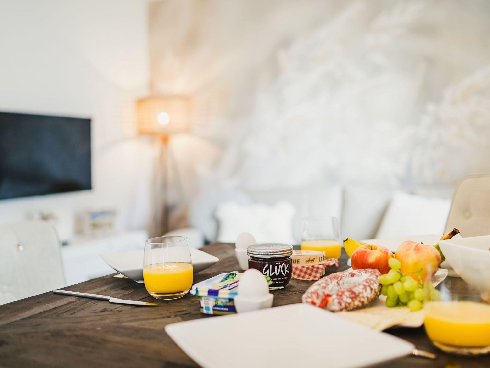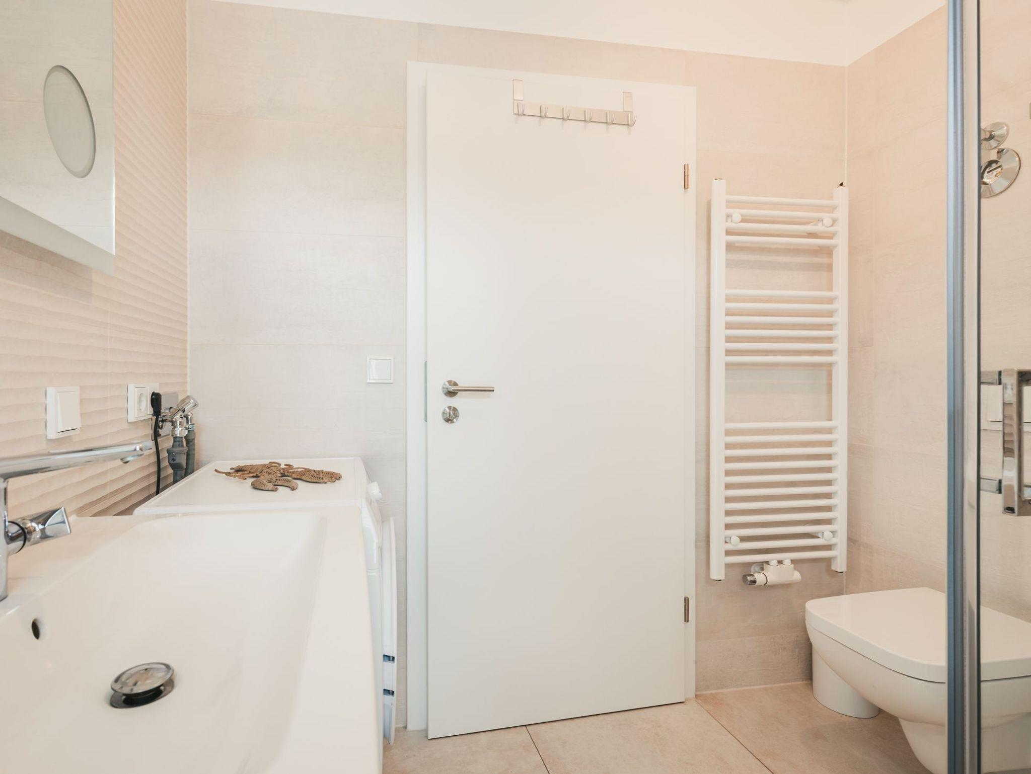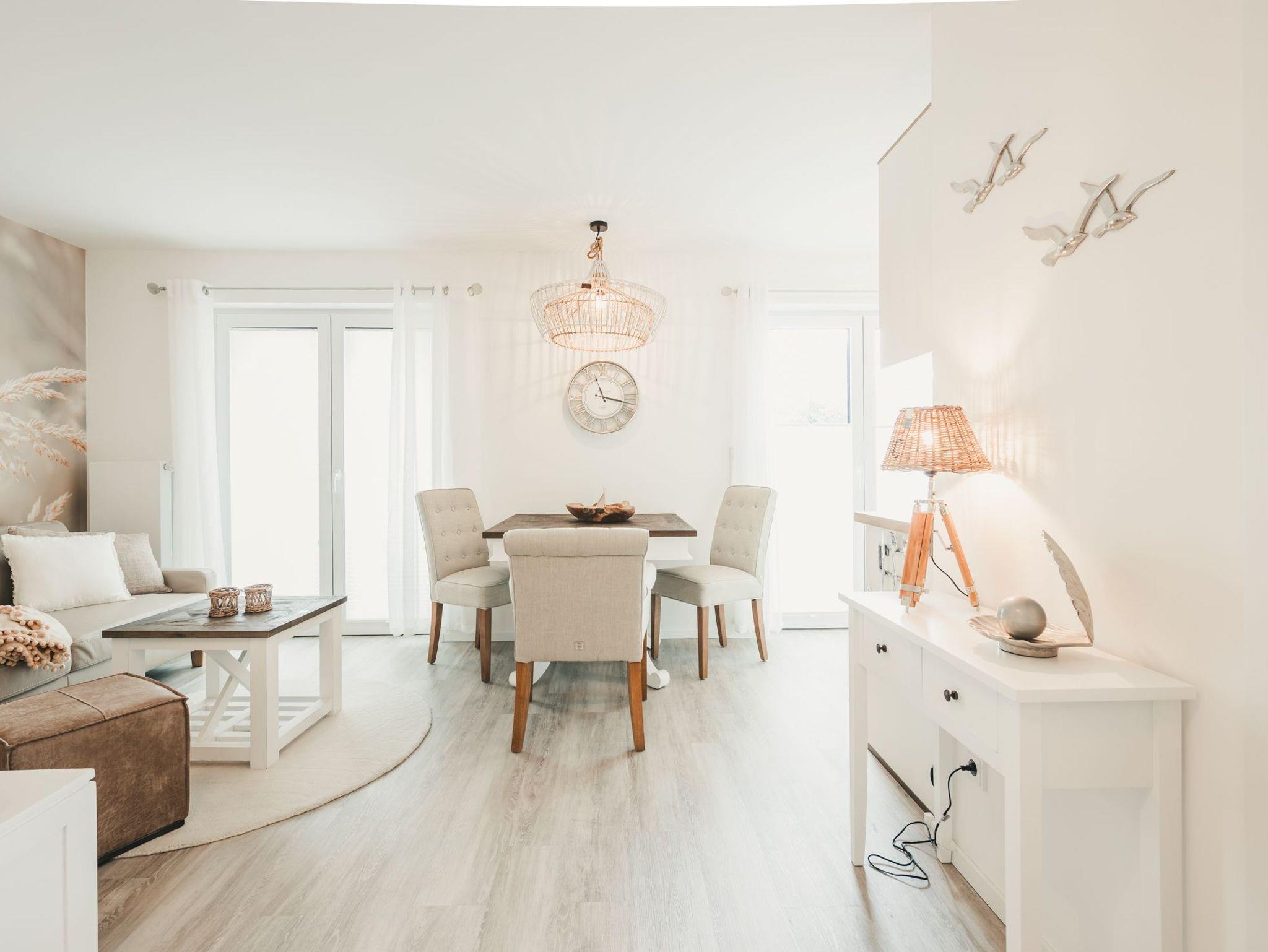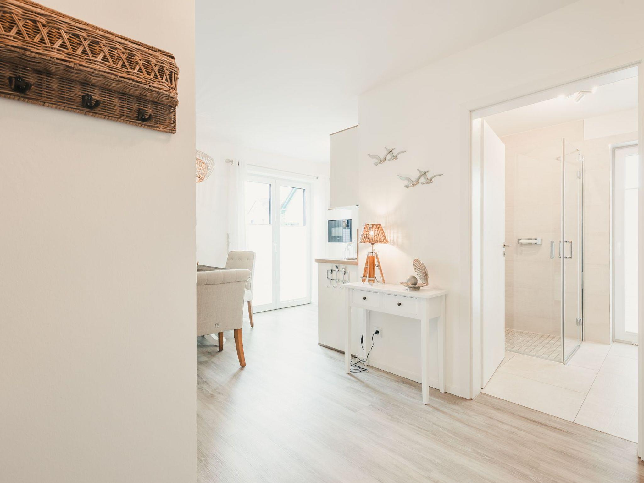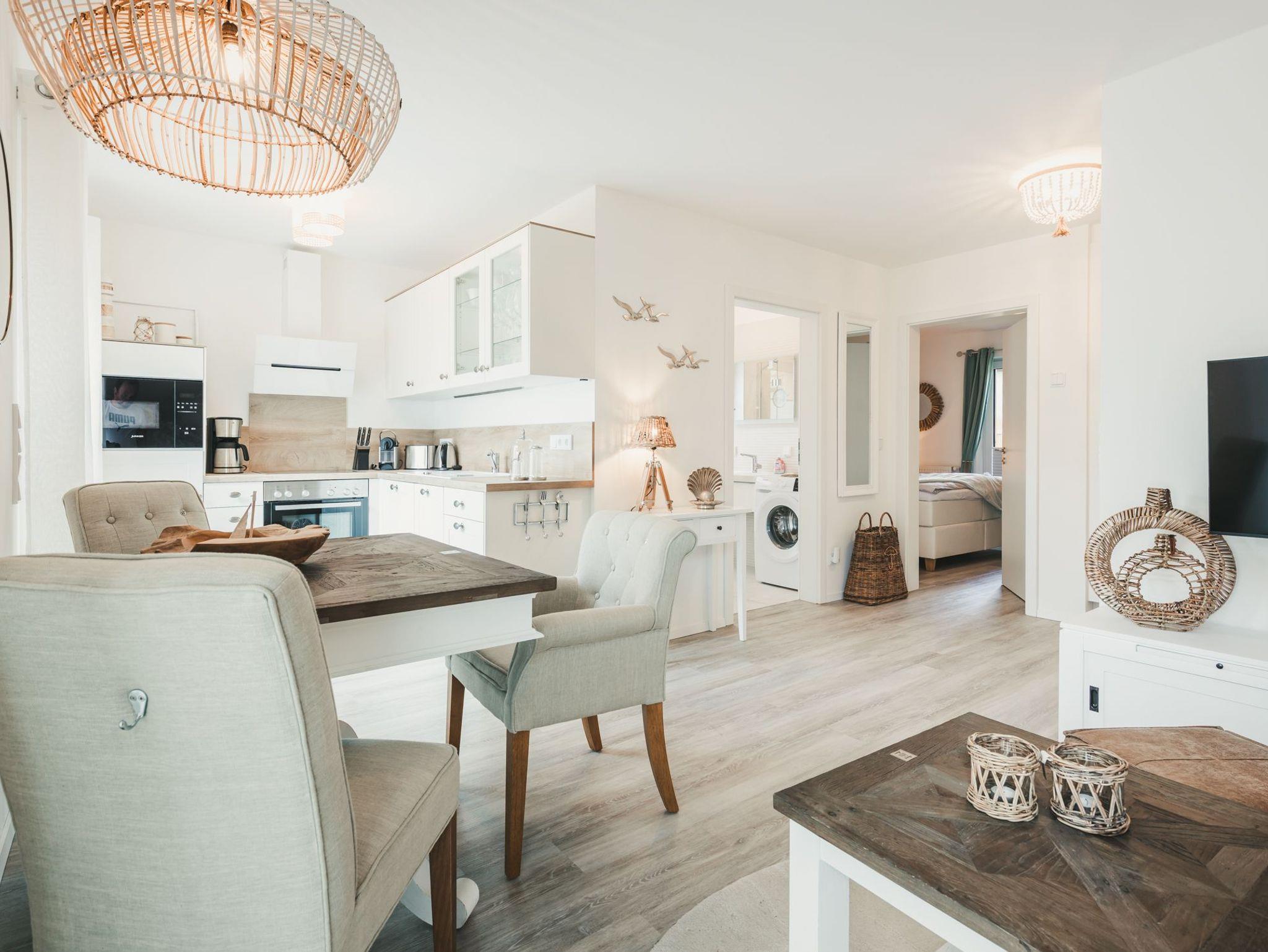 Muschelliebe - Ihr Wohlfühlort in Zingst Unsere Muschelliebe ist eine liebevoll, mit maritimem Mobiliar eingerichtete Ferienwohnung. Sie befindet sich in einem neuen Apartmentobjekt mit einer wunderschönen, modernen Architektur. Ankommen, Wohlfühlen und Durchatmen - diese ruhige, in einer Sackgasse gelegene Wohnung versprüht nicht nur durch ihre hochwertigen, natürlichen Materialien und Farben einen ganz besonderen Charme. Über einen geräumigen Eingangsbereich mit Garderobenschrank, gelangen Sie in das gemütliche Wohnzimmer mit offener Küche und einem großzügigen Essplatz. Die Küche ist exklusiv und besticht durch eine breit gefächerte Ausstattung. Neben den Standard Küchenmaschinen steht für Sie auch eine Nespresso-Kapselmaschine bereit. Sowohl vom Wohn- als auch vom Küchenbereich gelangen Sie über große Balkontüren auf die möblierte Terrasse mit angrenzendem Garten. Hier finden Sie viel Platz zum privaten Sonnenbaden, Essen und Erholen. Das Badezimmer ist in modernen Naturtönen gehalten und verfügt über eine ebenerdige Dusche, ein WC, sowie eine Waschmaschine.Zeit zum Verweilen, und ihren erholsamen Schlaf, finden Sie im Schlafzimmer gleich neben dem Badezimmer. Ein großes und sehr bequemes Boxspringbett verspricht ruhigen und erholsamen Schlaf. Für die ganz Kleinen gibt es ein ausklappbares Kinderreisebett mit Matratze. Zur Ferienwohnung gehören ein verschließbarer Schuppen für Ihre Fahrräder sowie Ihr eigener PKW Stellplatz. WLAN können Sie während des Aufenthalts kostenlos nutzen. Wir freuen uns auf Ihren Besuch und wünschen Ihnen erlebnisreiche und wundervolle Tage in Zingst.