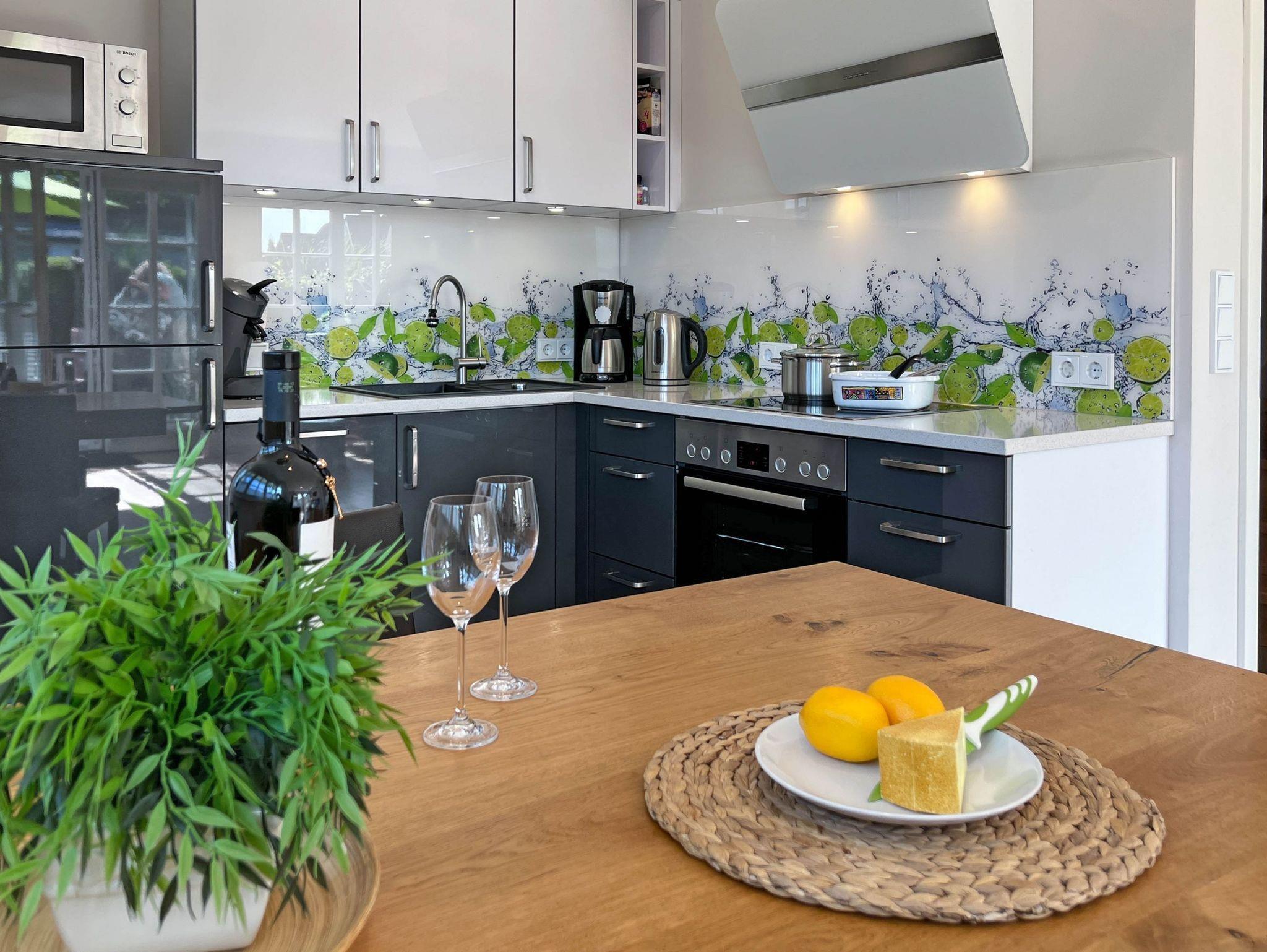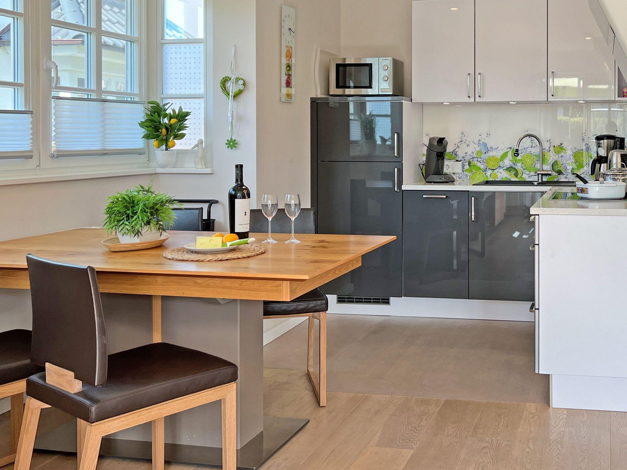 Die voll ausgestattete Küche ist ein Paradies für Hobbyköche und bietet alles, was Sie brauchen: Induktions-Kochfeld, Heißluft-Herd, Kühl- und Gefrierkombination, Geschirrspüler, Mikrowelle, 4-Fachtoaster, Wasserkocher mit Temperaturvorwahl, Filter-Kaffeemaschine und Senseo-Padmaschine.