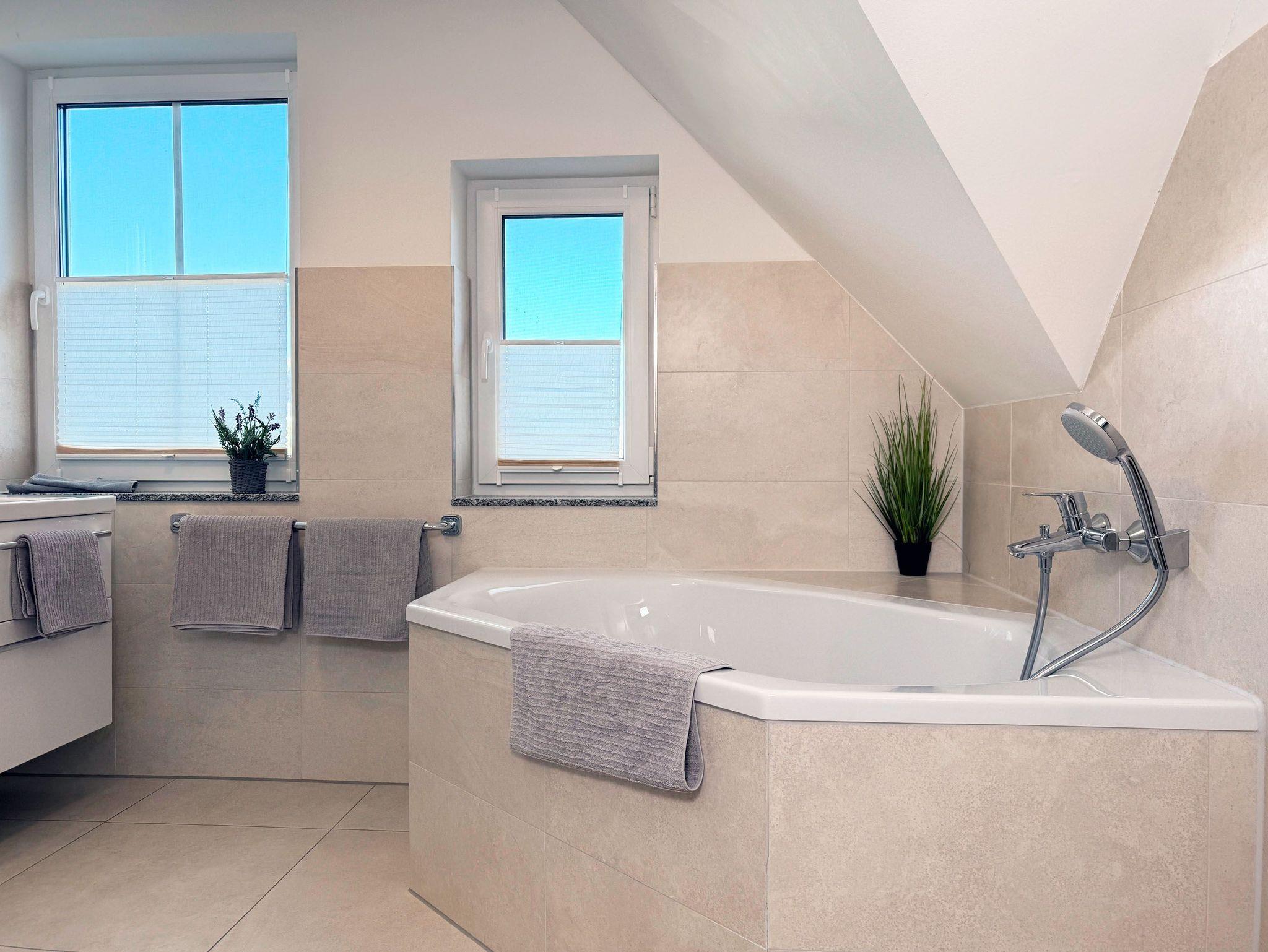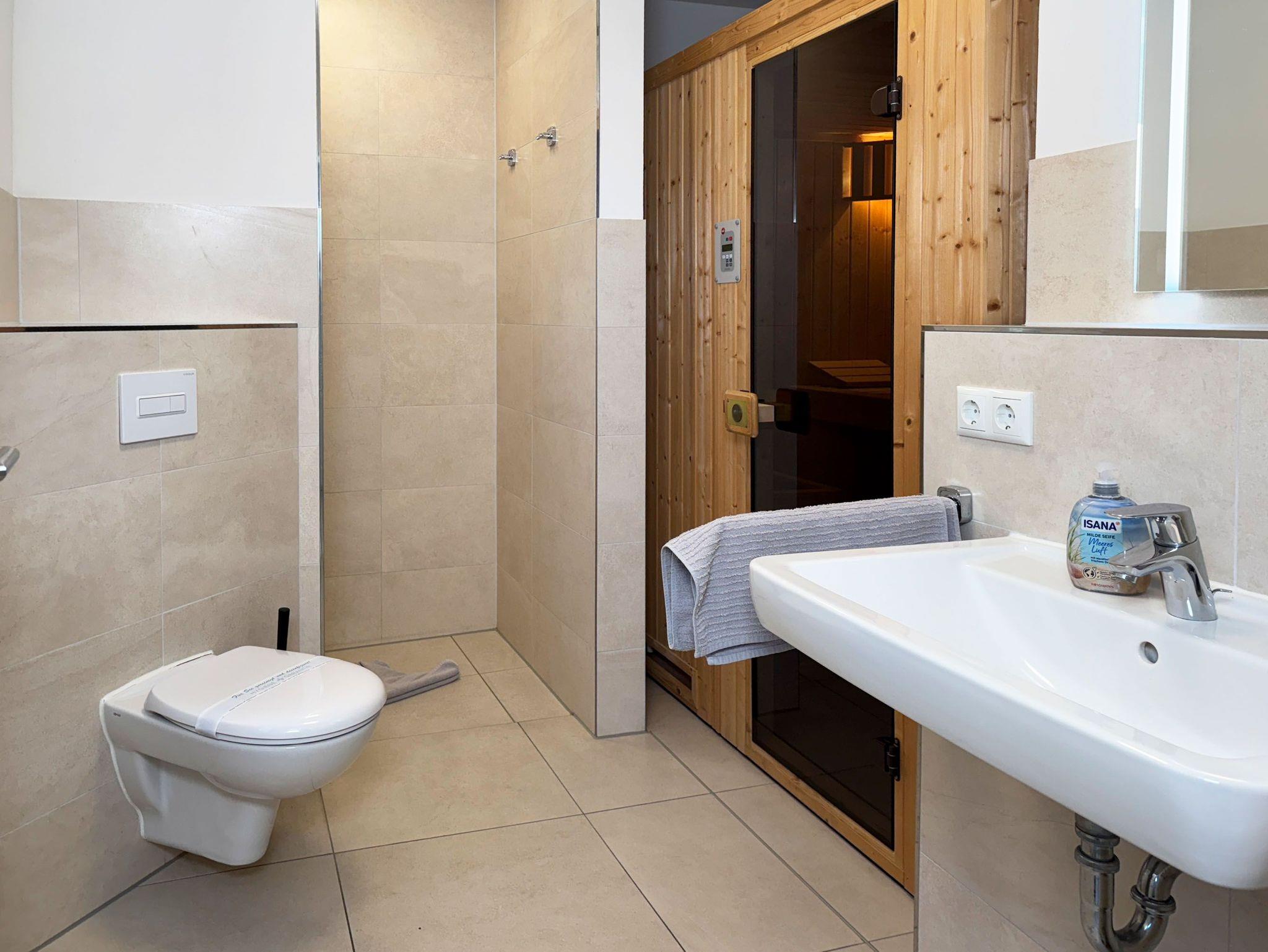 • Zwei Badezimmer: eines mit Badewanne und Dusche, eines mit Dusche und Sauna