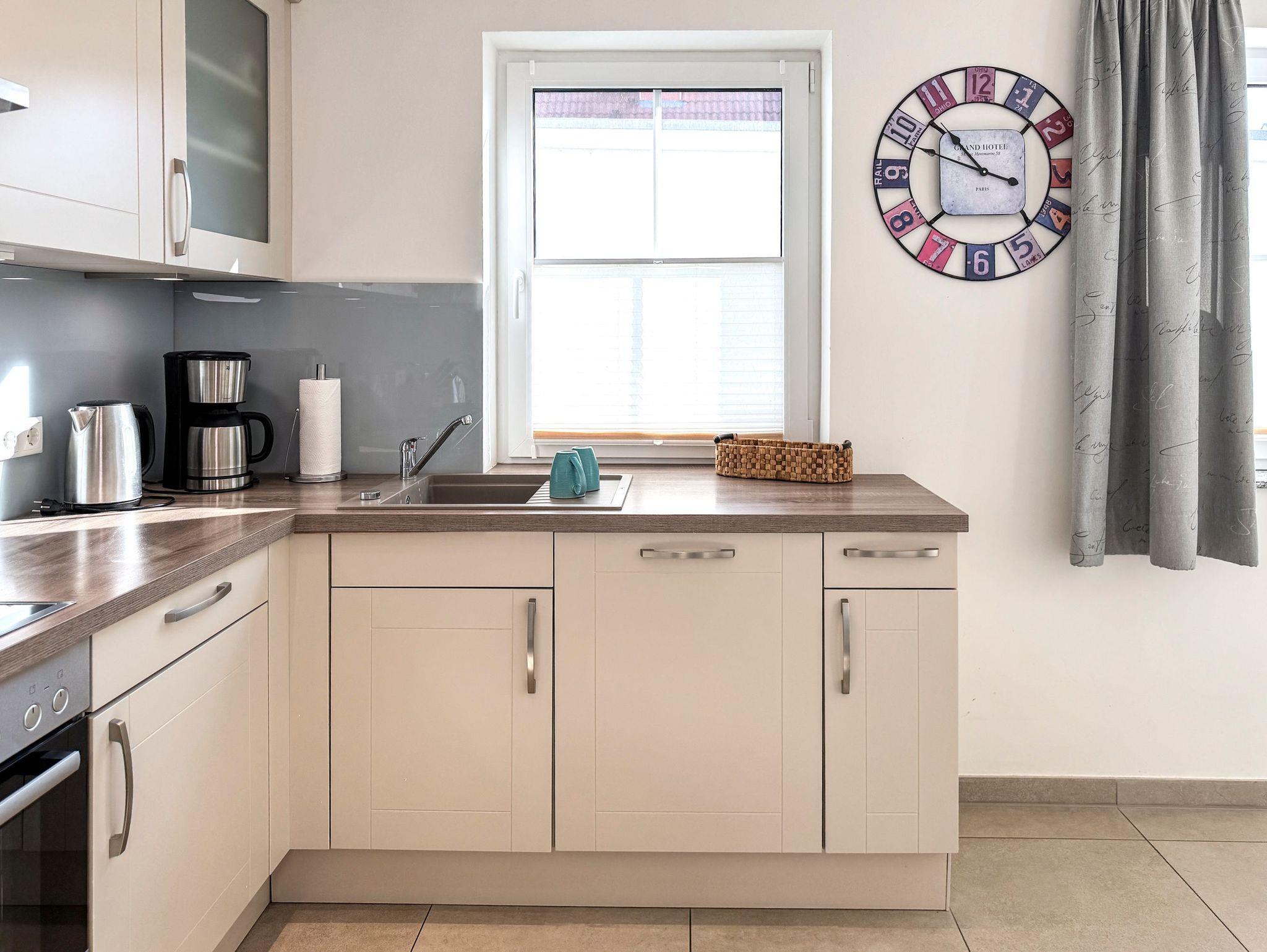 • Voll ausgestattete Küche mit Geschirrspüler, Backofen, Kochfeld, Kühlschrank, Mikrowelle, Filterkaffeemaschine, Toaster und Wasserkocher