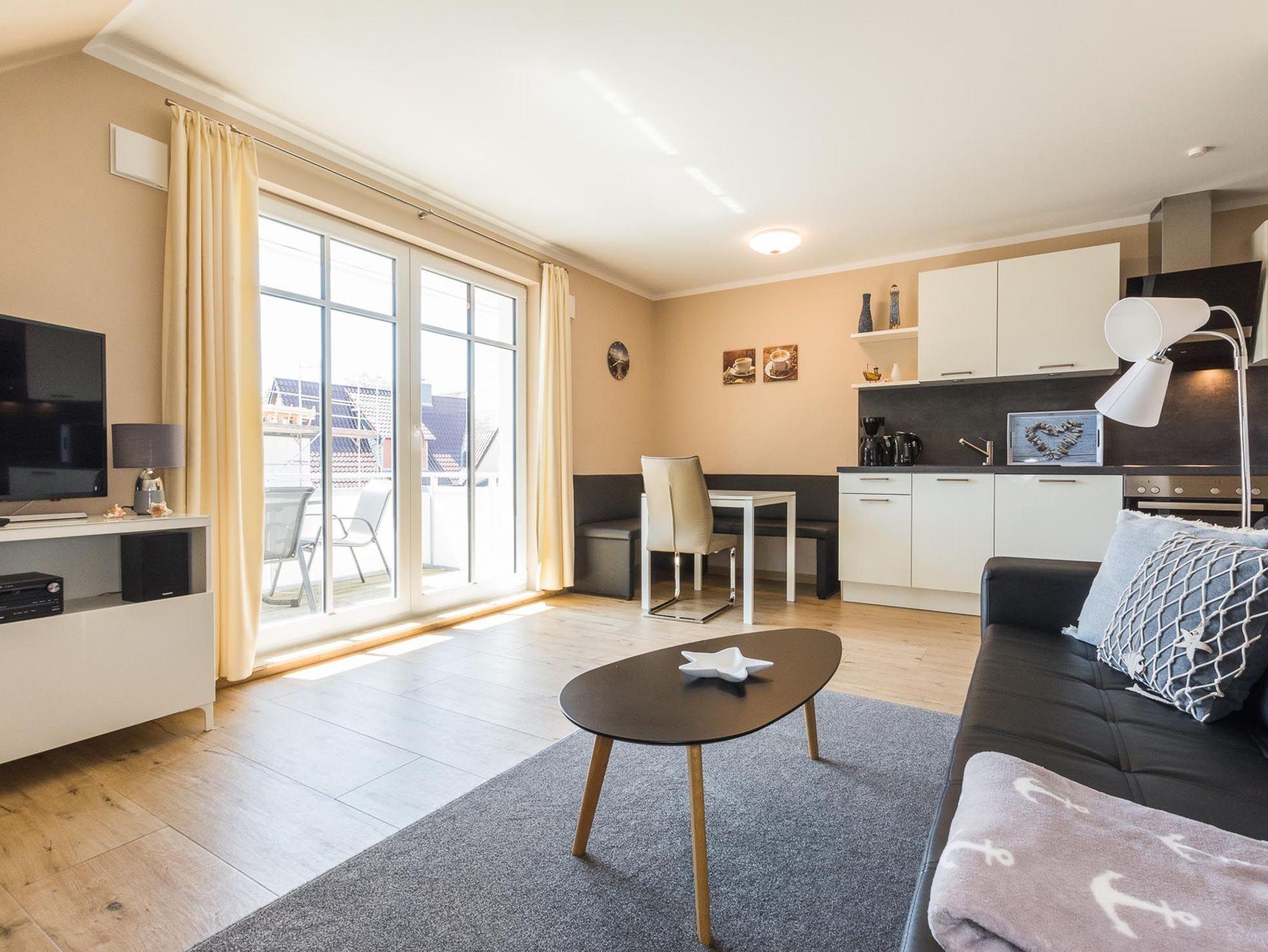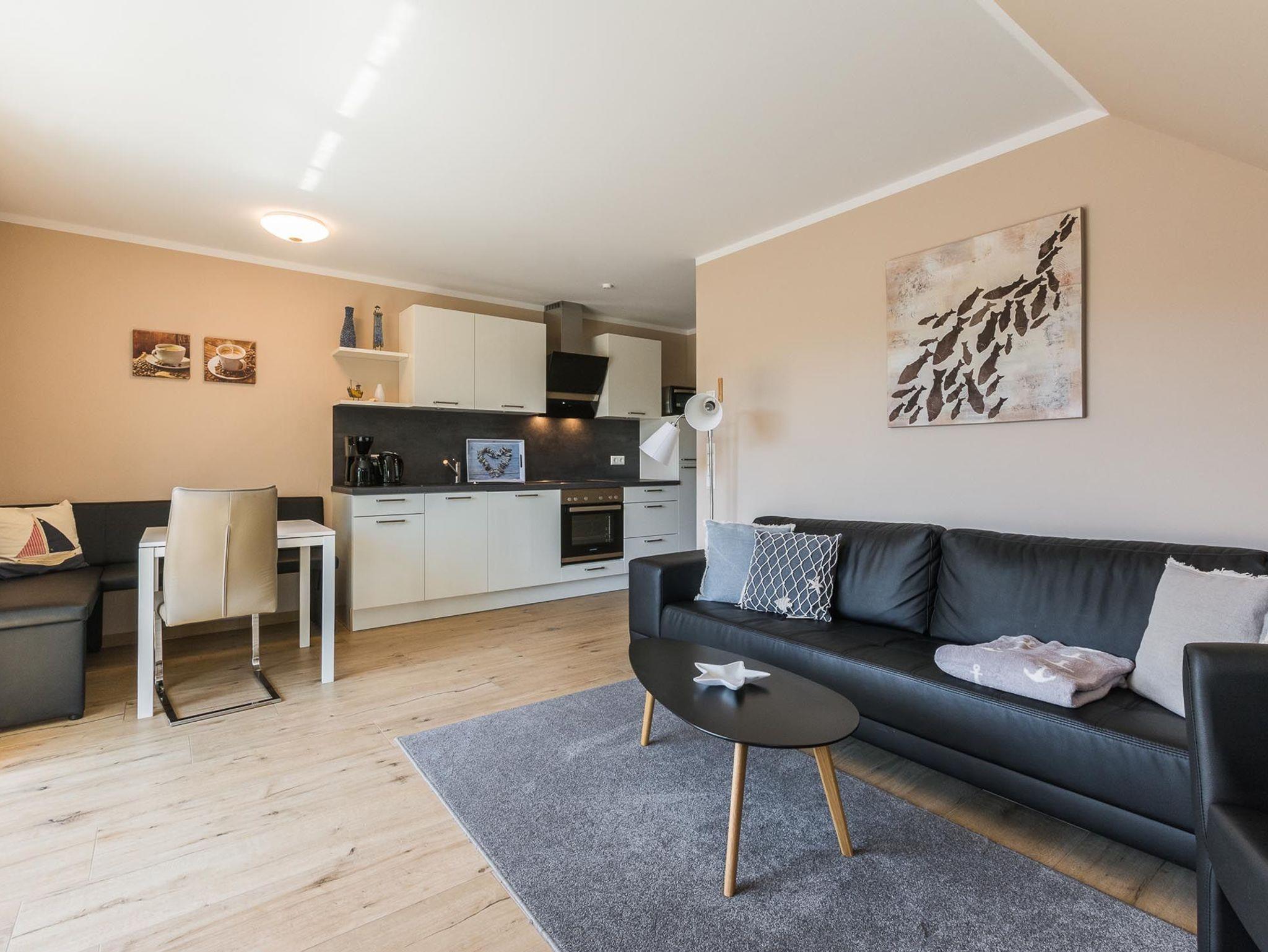 Das Appartement verfügt über einen lichtdurchfluteten Wohnbereich mit einer offenen Küche und gemütlichem Essbereich. Die Küche ist voll ausgestattet.